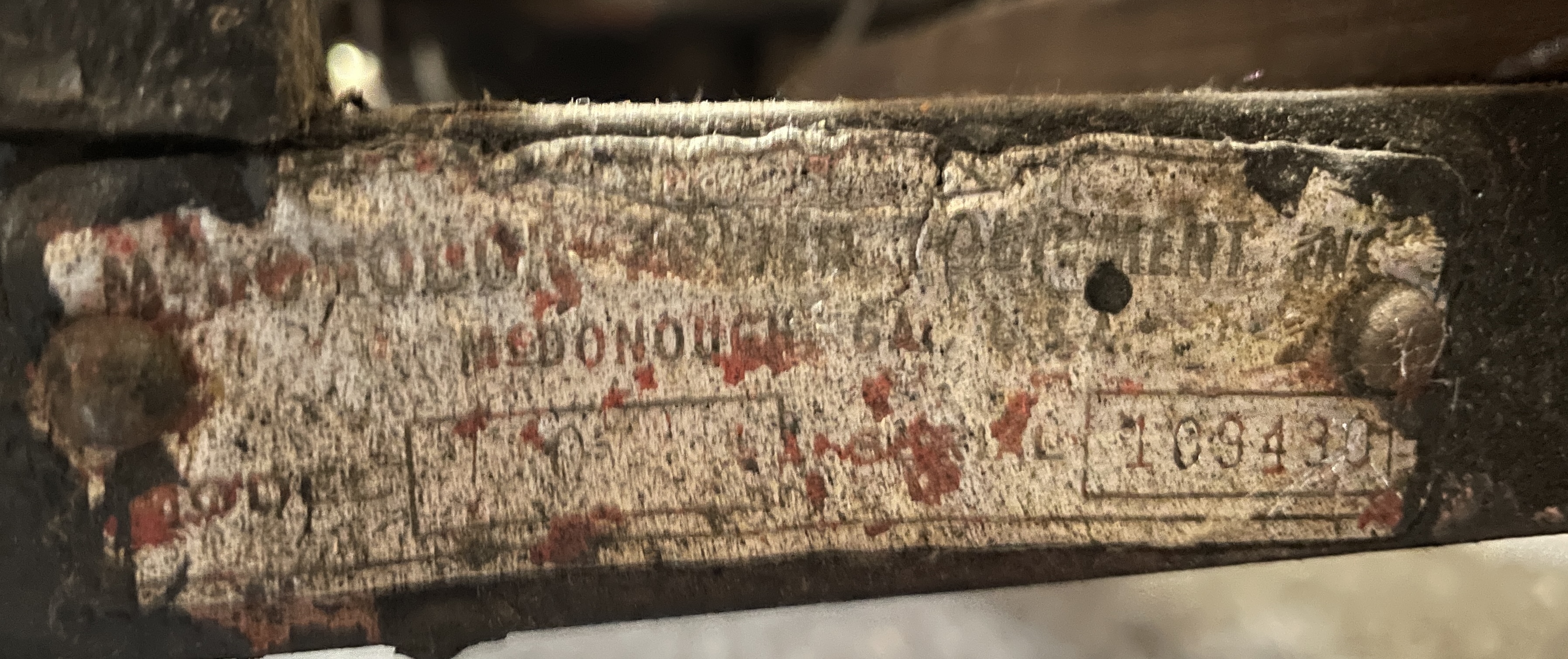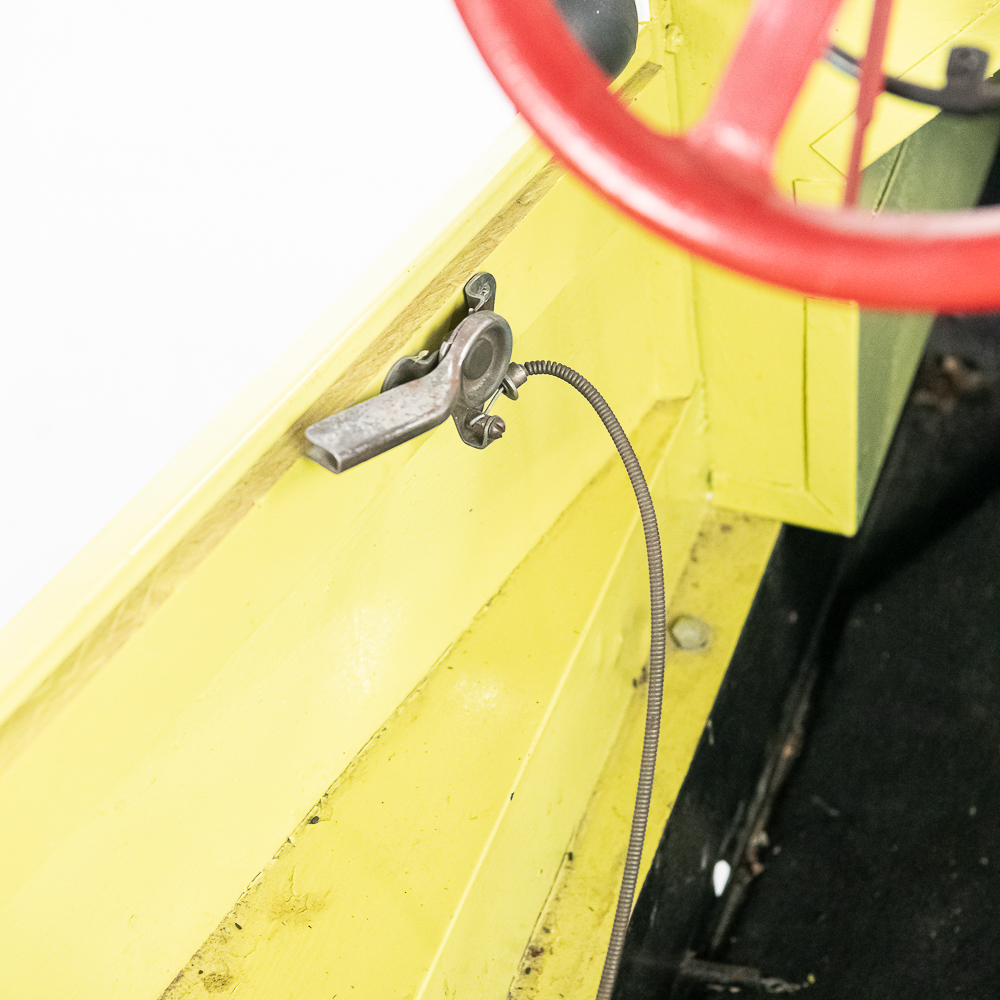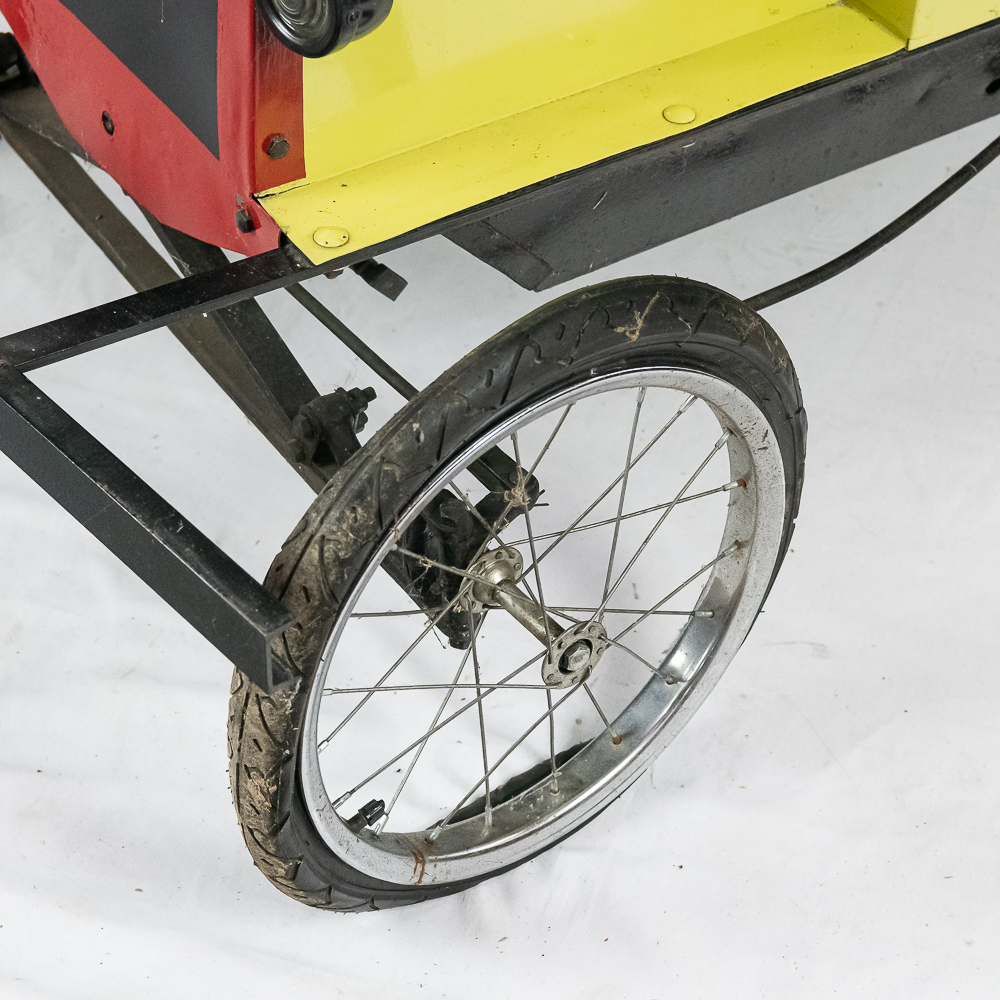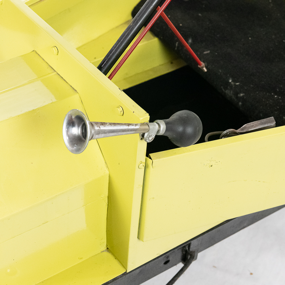 Kid size go kart mfg’d by McDonough Power Equipment in Georgia circa 1962. Serial number is 9,490. These were made to look like a Model T roadster. All steel frame and body with direct steering powered by a 2 HP Briggs & Stratton gas engine. The engine is pull start and turns over easily but has not been started. It rides on 14″ bicycle balloon tires. The engine speed is controlled by a lever / cable mounted on the drivers side as well as a motor engage lever and a friction brake lever also on the drivers side. In overall VG condition with no rust and good paint. Seats 2 children. Measures 72″ long, 36″ wide, 36″ tall to the top of the steering wheel.