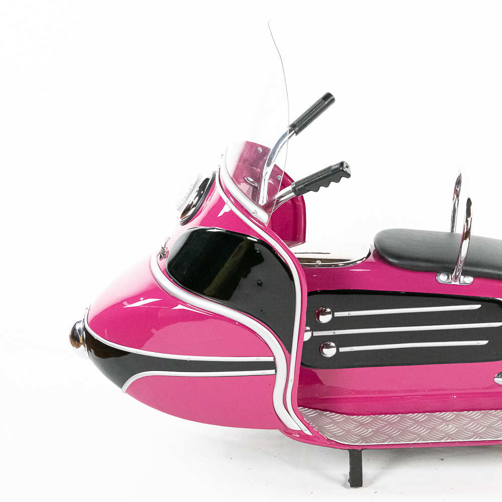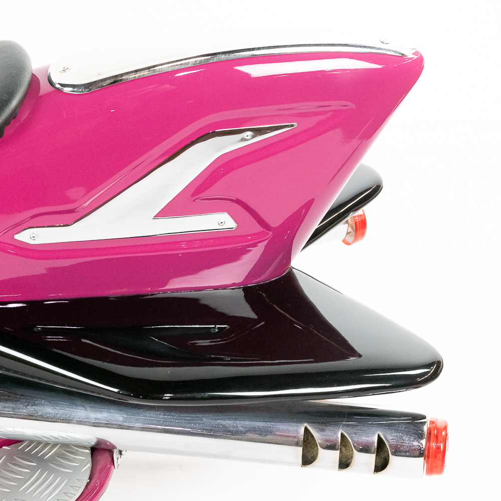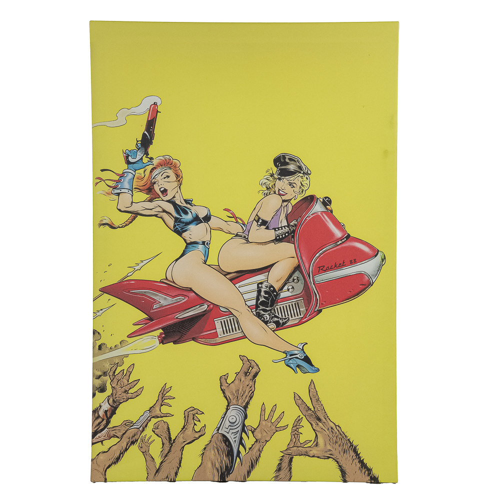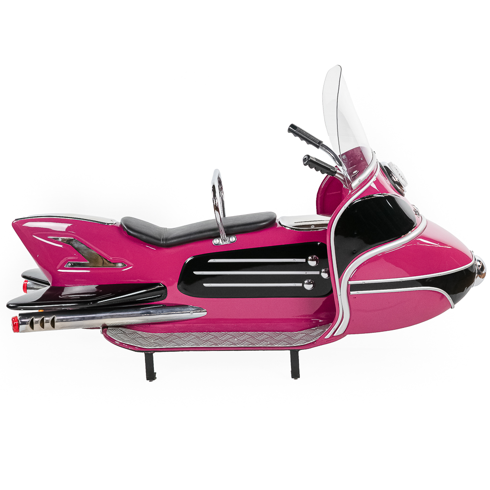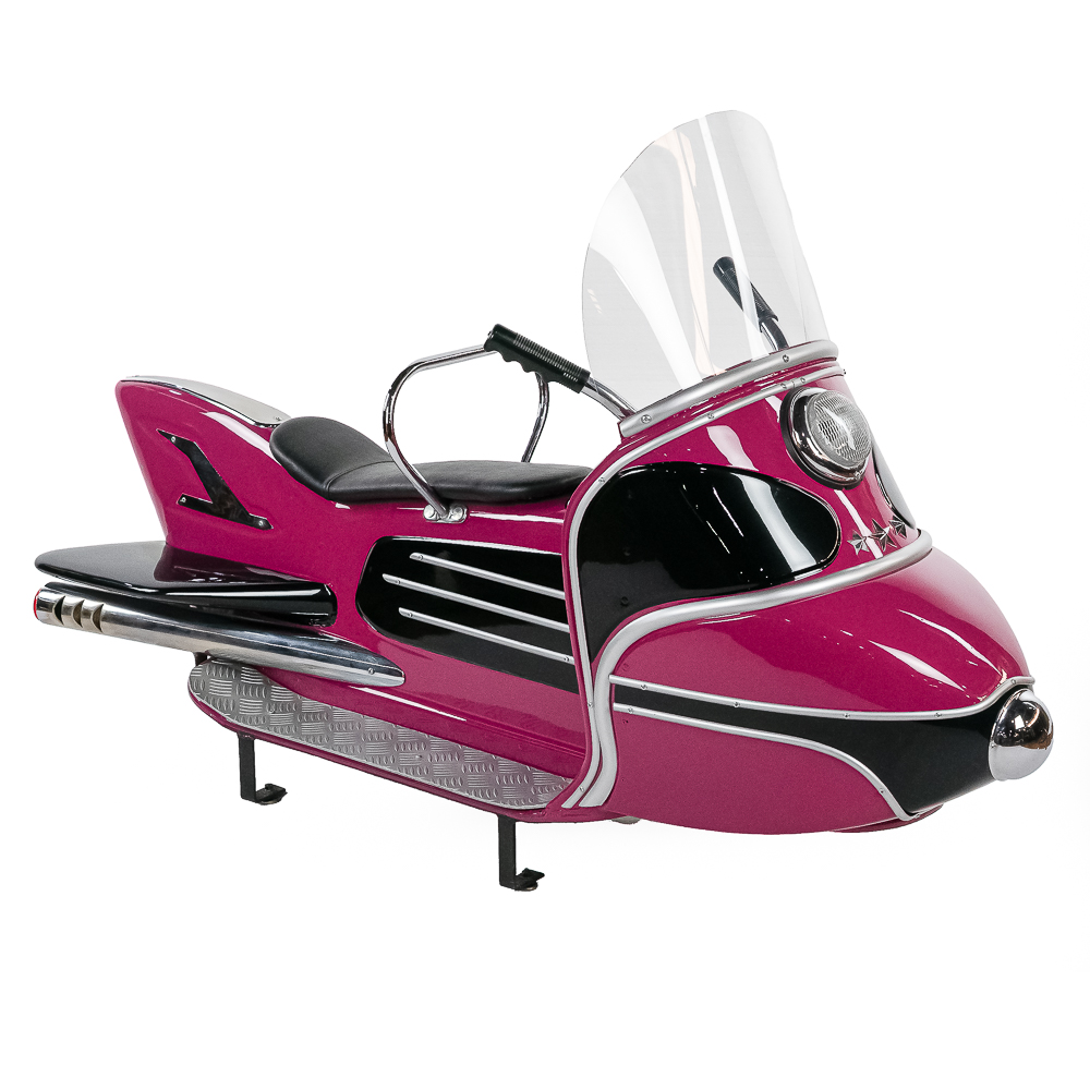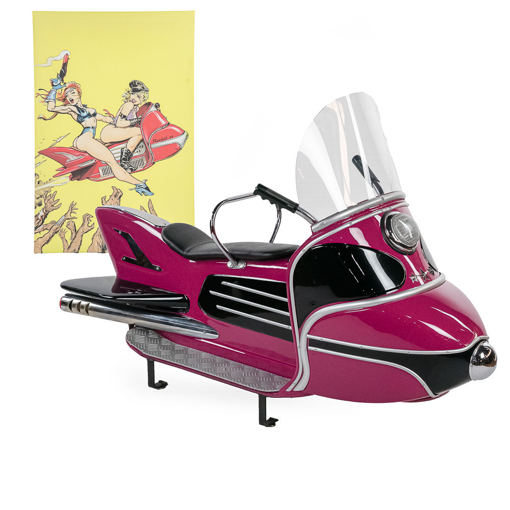 Fully restored amusement ride manufactured by L’ Autopede of Belgium. With 24″ X 36″ Canvas print by Dave Stevens creator of the Rocketeer. Ride is 58″L X 17″W X 37″ H at windscreen. Both in excellent condition