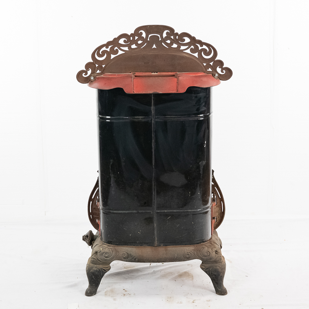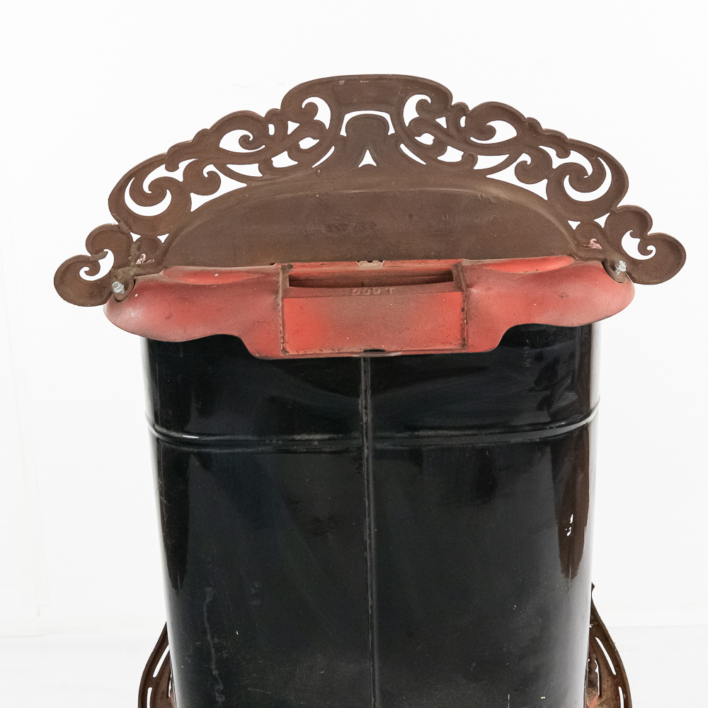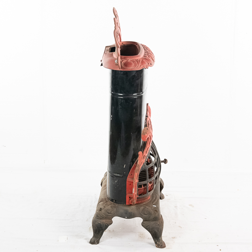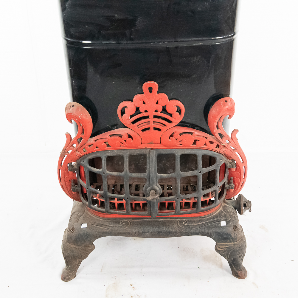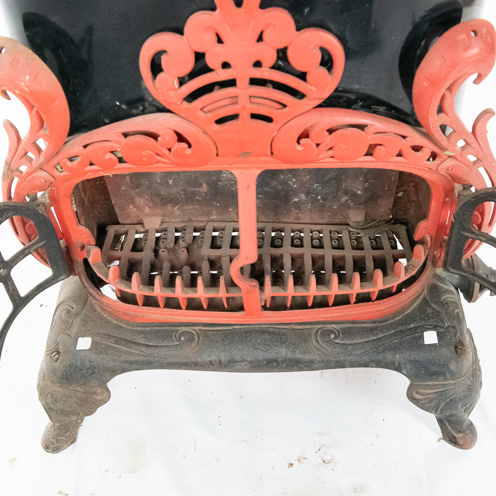 Ornate small gas parlor stove with older amateur restoration painted in black and red. Looks to be complete, possibly missing lower front cosmetic panel. Good condition with no major dents or cast iron cracks.