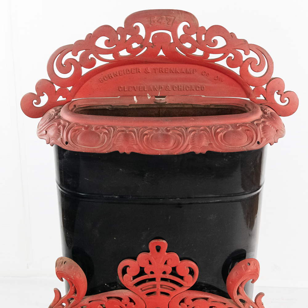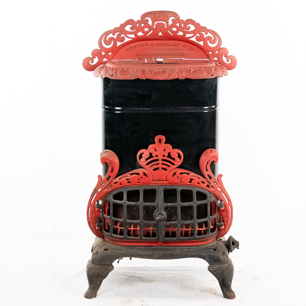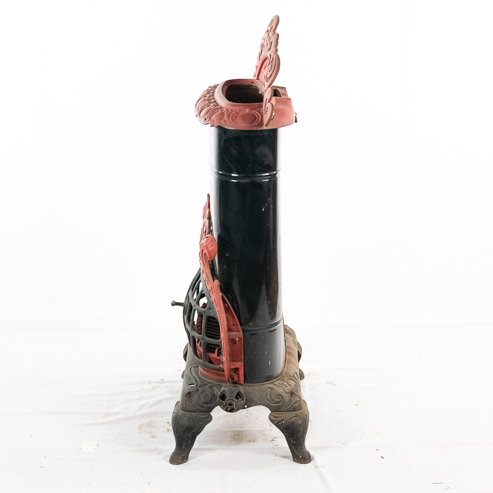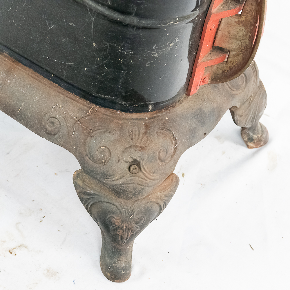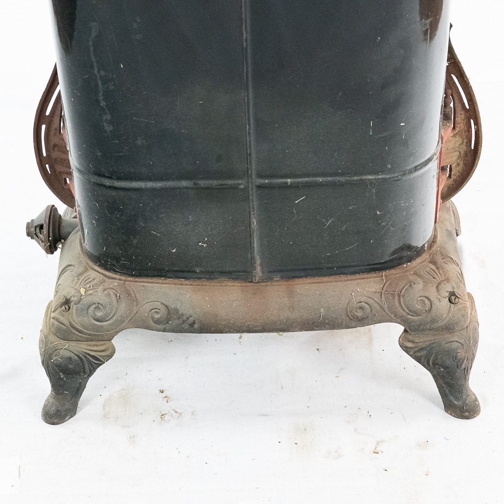Ornate small gas parlor stove with older amateur restoration painted in black and red. Looks to be complete, possibly missing lower front cosmetic panel. Good condition with no major dents or cast iron cracks.