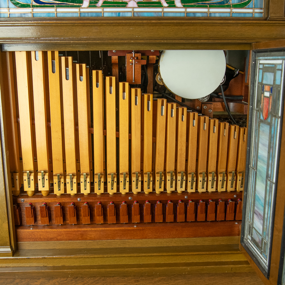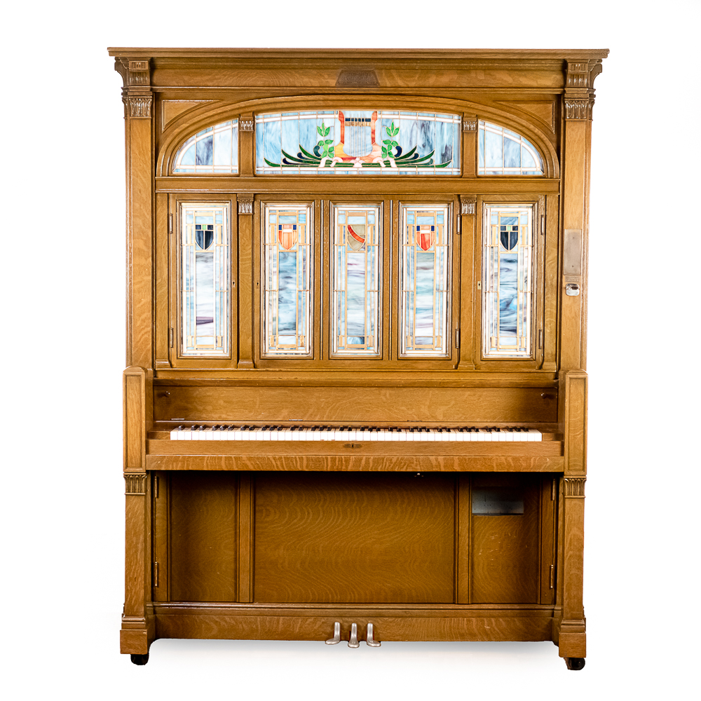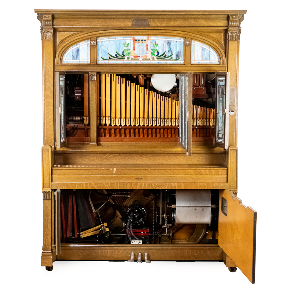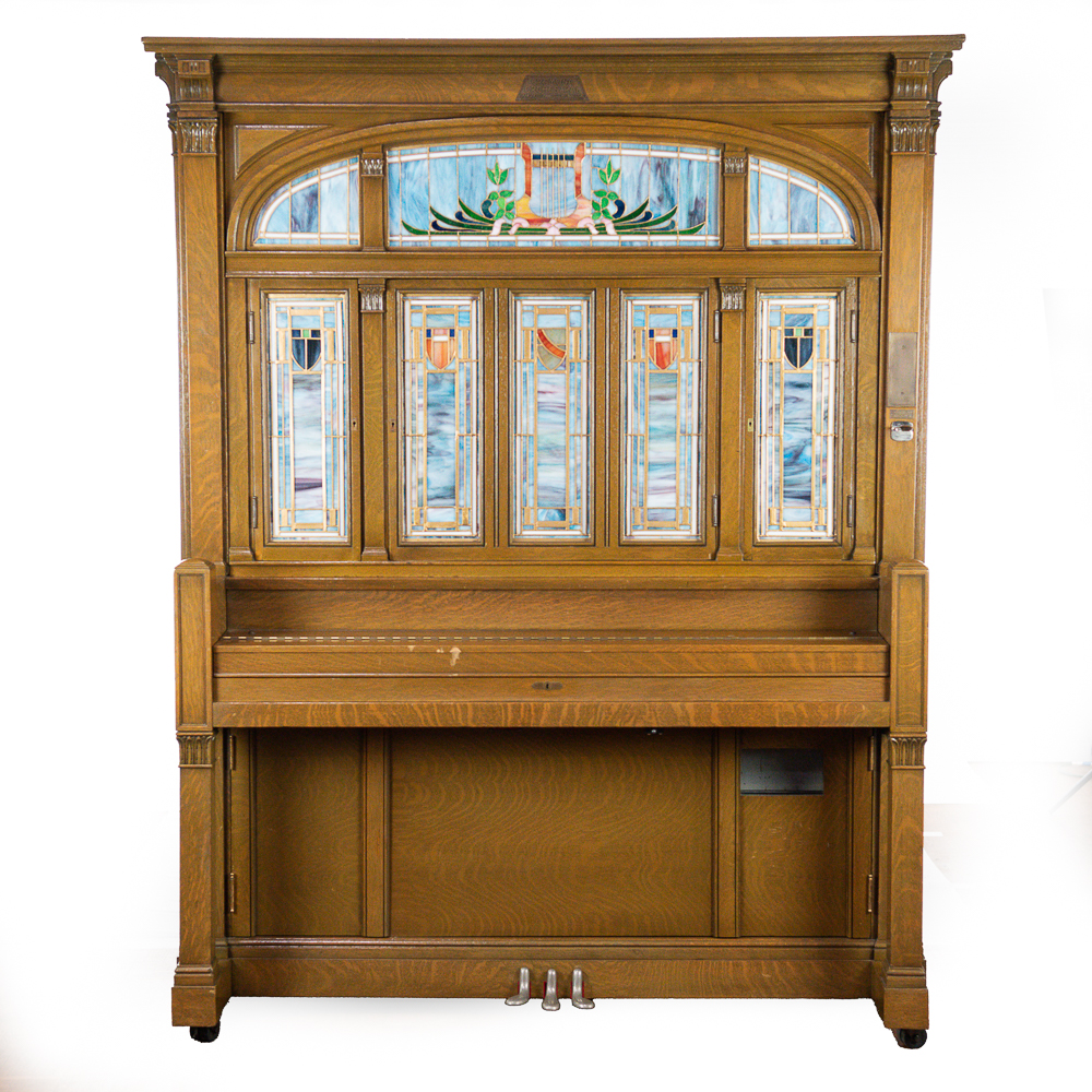 This impressive desirable machine in its oak cabinet featuring scarce opalescent blue art glass all of which is in excellent condition with no cracks. Instrumentation features piano, mandolin attachment, 32 violins and 32 open flute pipes, xylophone, bass and snare drums, tympani effect, snare drum, cymbal, and triangle. Plays Marquette “M” rolls. This machine was completely restored by D.C. Ramey Piano Co, Chicago Heights, Il in 2003. The cabinet, glass and piano and instrumentation are in good working order. Has its complete coin op mechanism and works with a 5 cent coin as well as a manual override, It comes with one “M” roll, The cabinet measures 80″ T X 62″ W X 28-1/2″ D. A nice example of a hard to find machine.