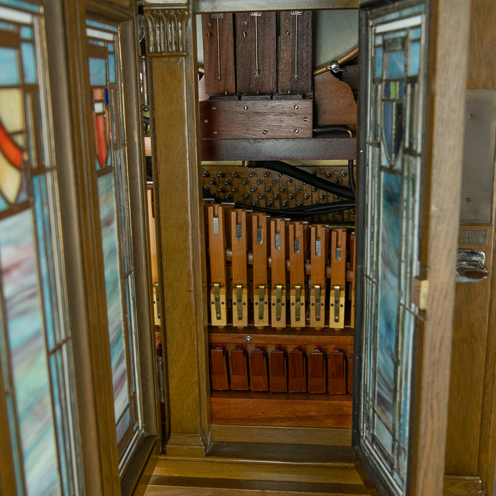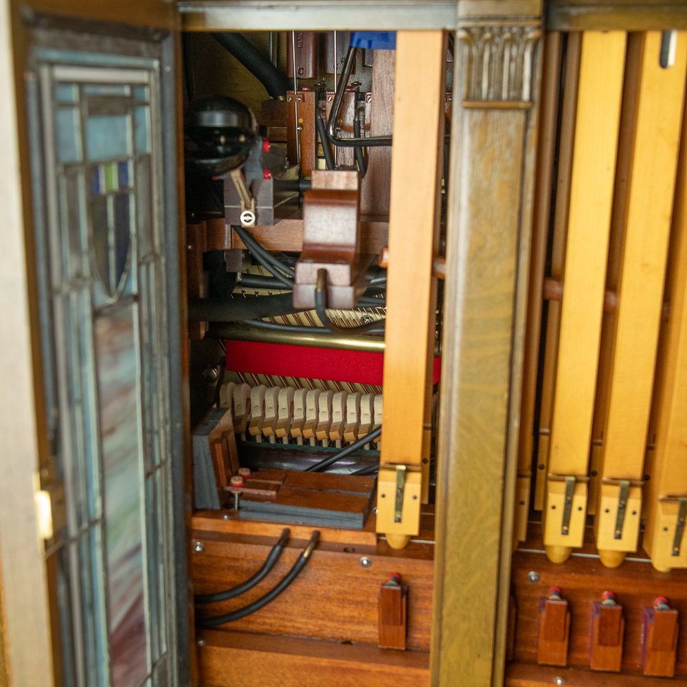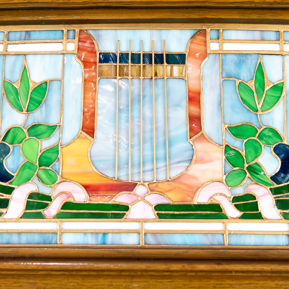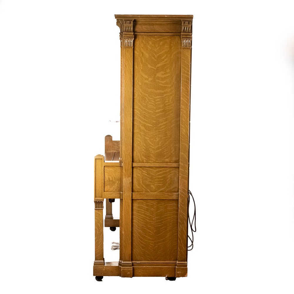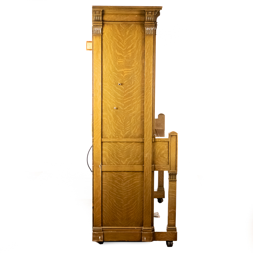 This impressive desirable machine in its oak cabinet featuring scarce opalescent blue art glass all of which is in excellent condition with no cracks. Instrumentation features piano, mandolin attachment, 32 violins and 32 open flute pipes, xylophone, bass and snare drums, tympani effect, snare drum, cymbal, and triangle. Plays Marquette “M” rolls. This machine was completely restored by D.C. Ramey Piano Co, Chicago Heights, Il in 2003. The cabinet, glass and piano and instrumentation are in good working order. Has its complete coin op mechanism and works with a 5 cent coin as well as a manual override, It comes with one “M” roll, The cabinet measures 80″ T X 62″ W X 28-1/2″ D. A nice example of a hard to find machine.