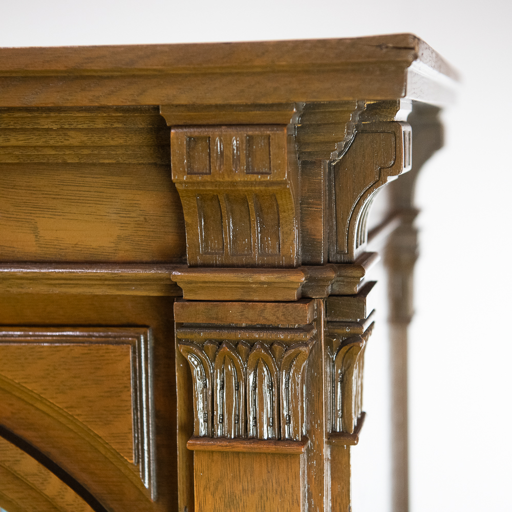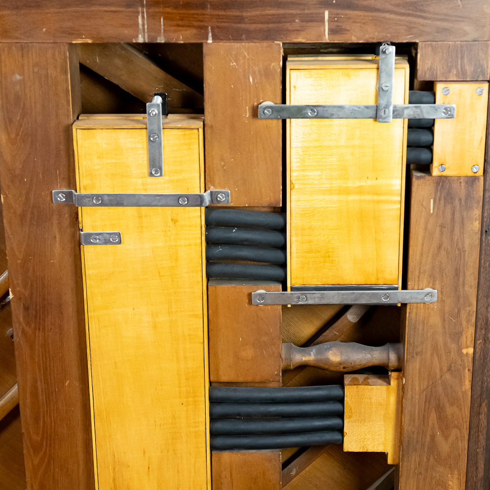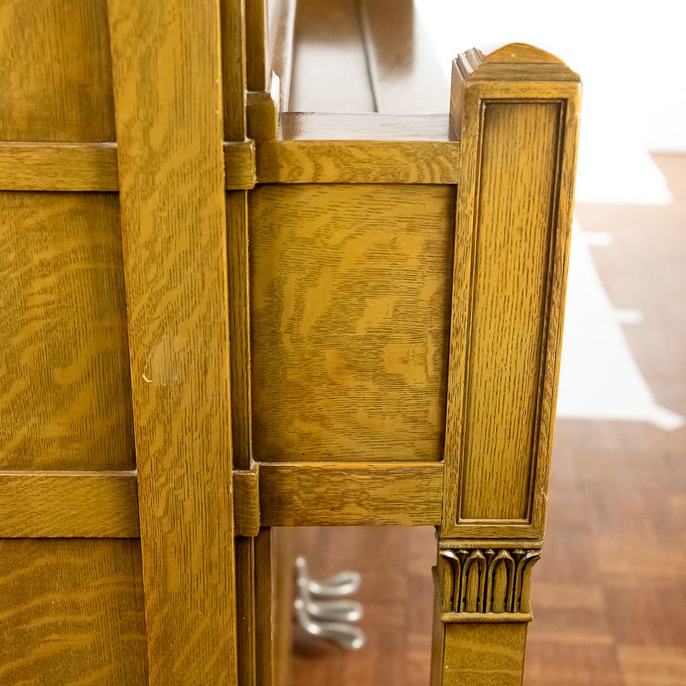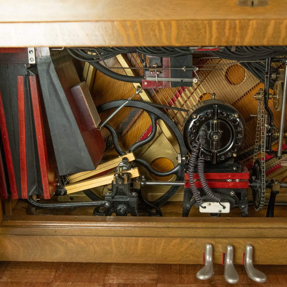 This impressive desirable machine in its oak cabinet featuring scarce opalescent blue art glass all of which is in excellent condition with no cracks. Instrumentation features piano, mandolin attachment, 32 violins and 32 open flute pipes, xylophone, bass and snare drums, tympani effect, snare drum, cymbal, and triangle. Plays Marquette “M” rolls. This machine was completely restored by D.C. Ramey Piano Co, Chicago Heights, Il in 2003. The cabinet, glass and piano and instrumentation are in good working order. Has its complete coin op mechanism and works with a 5 cent coin as well as a manual override, It comes with one “M” roll, The cabinet measures 80″ T X 62″ W X 28-1/2″ D. A nice example of a hard to find machine.