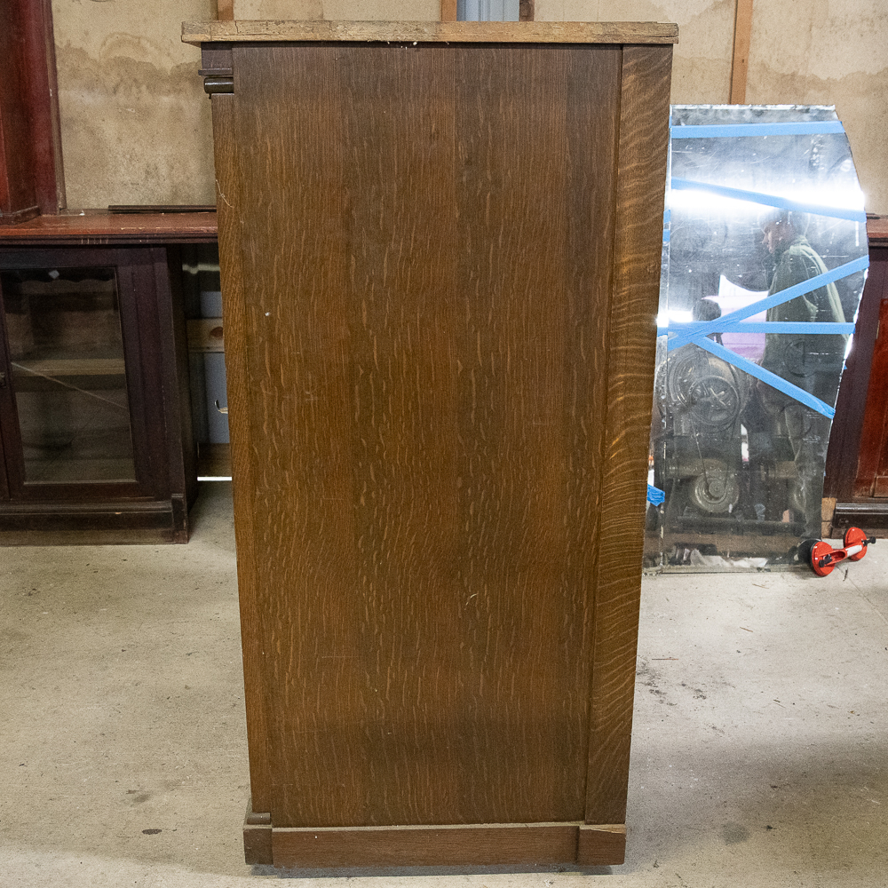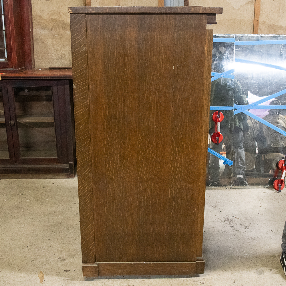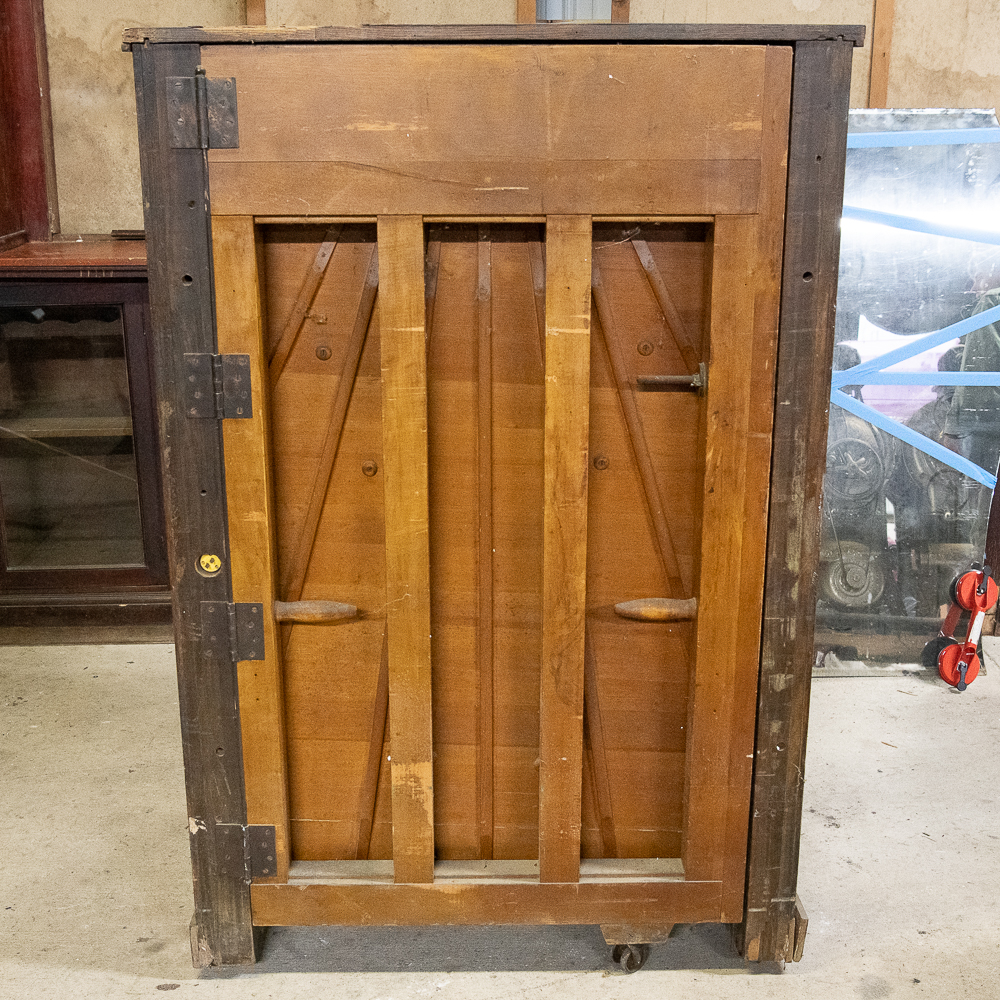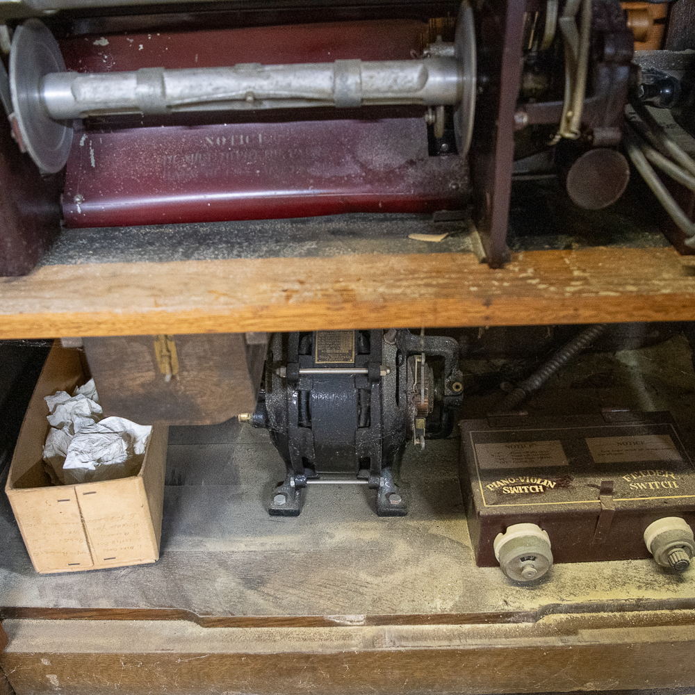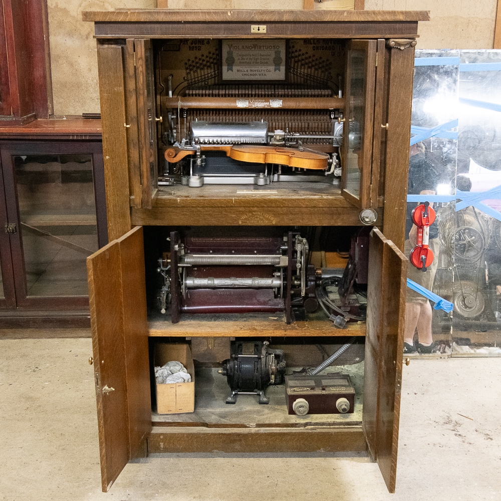 Oak Mills Violano serial number 1797. Good restoration candidate. It has its original violin which is market Mills Novelty Company on the paper label inside the violin. There are no strings present, otherwise the violin appears to be in good condition. The tuning weights and arms are present but appear to be reproductions. Oak cabinet has original front bifold doors and beveled glass and hardware, One of the front columns is missing a capital – see photos. Has original coin mechanism. The coin box and front cover are older reproductions. The sounding board appears to be in good condition with no visible cracks. The cast iron harp is free of any cracks, the piano action appears to have been reconditioned as well as the piano having been re-strung some time ago. The oak cabinet appears to have been professionally refinished. There are several minor nicks and scrapes and some veneer damage on the edges of the top cover. The roll-frame motor/generator and governor are all present. The contact roller is also present, but detached. It appears to be missing one of the pin ends. This machine is not in playing condition and in need of restoration. 64″H x 42″W x 30″ D