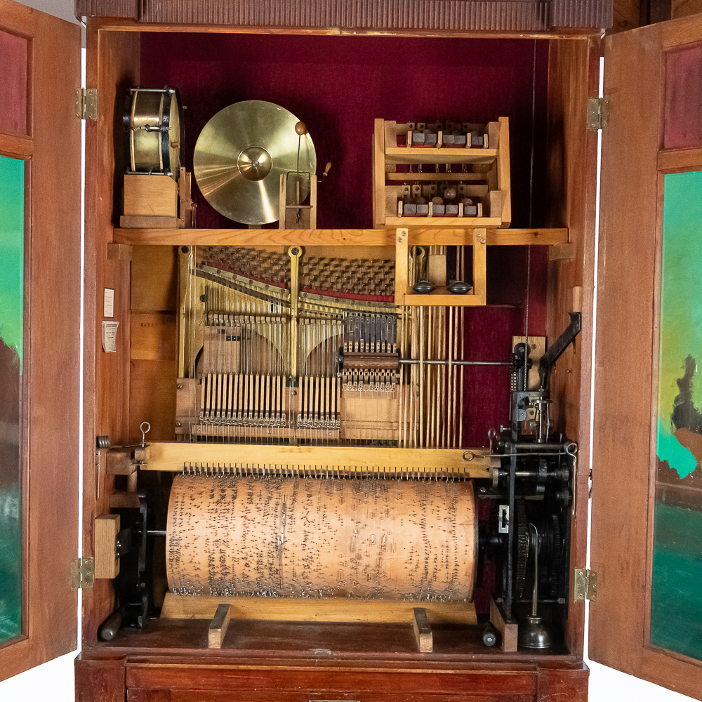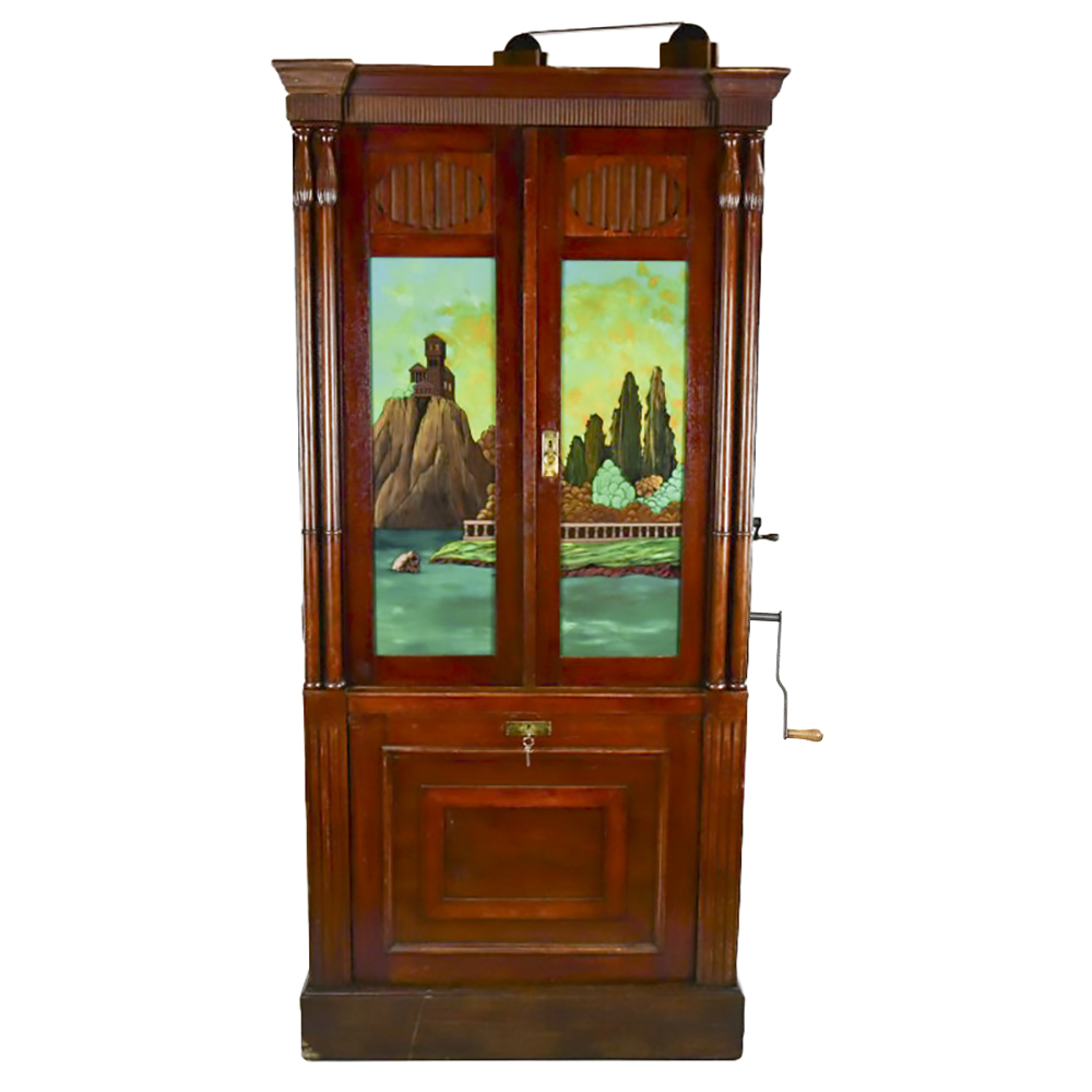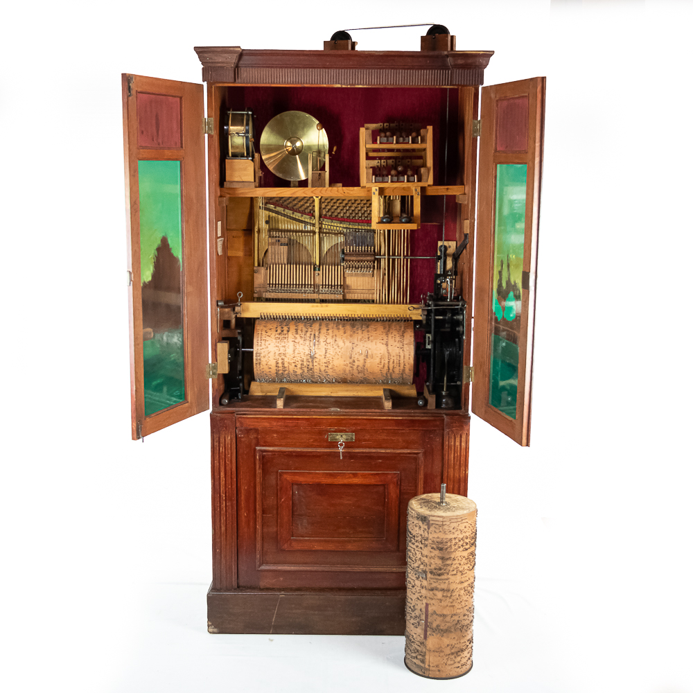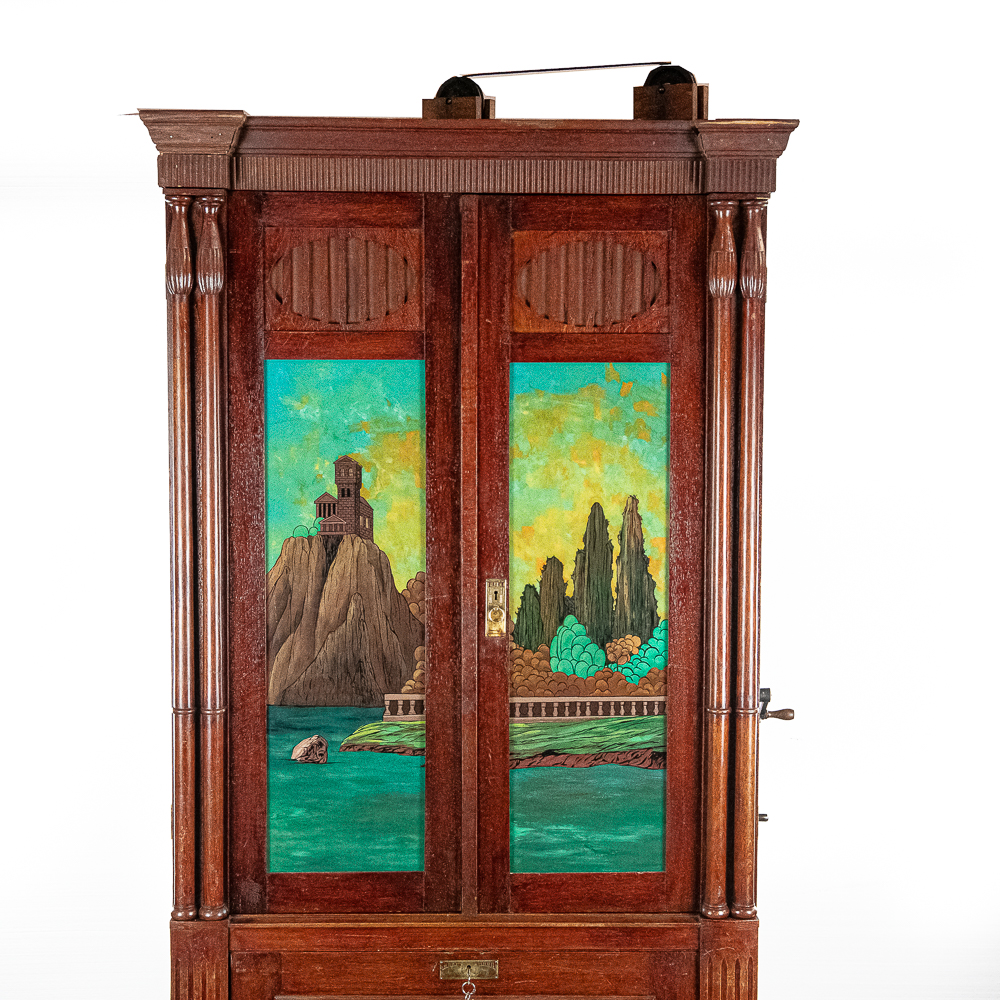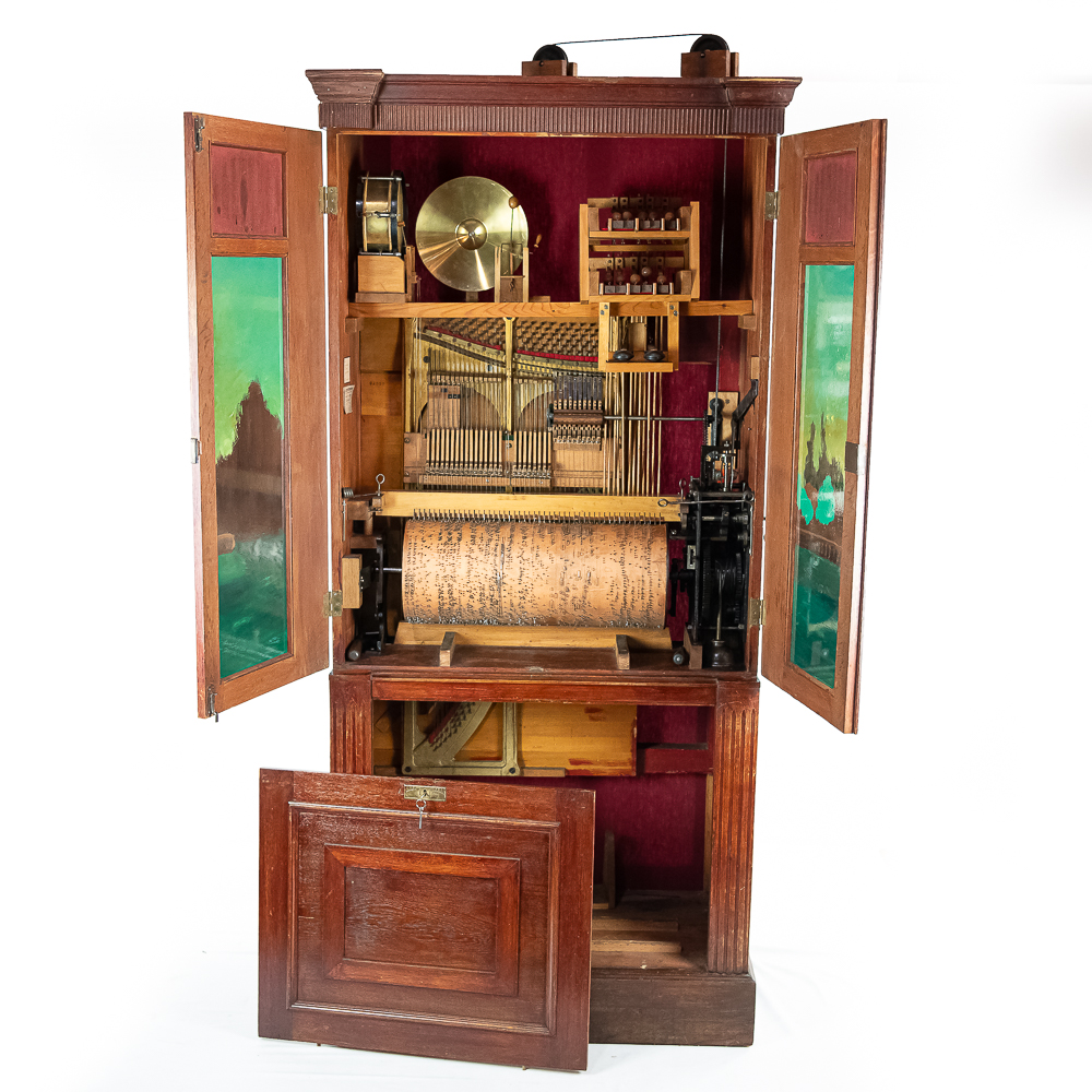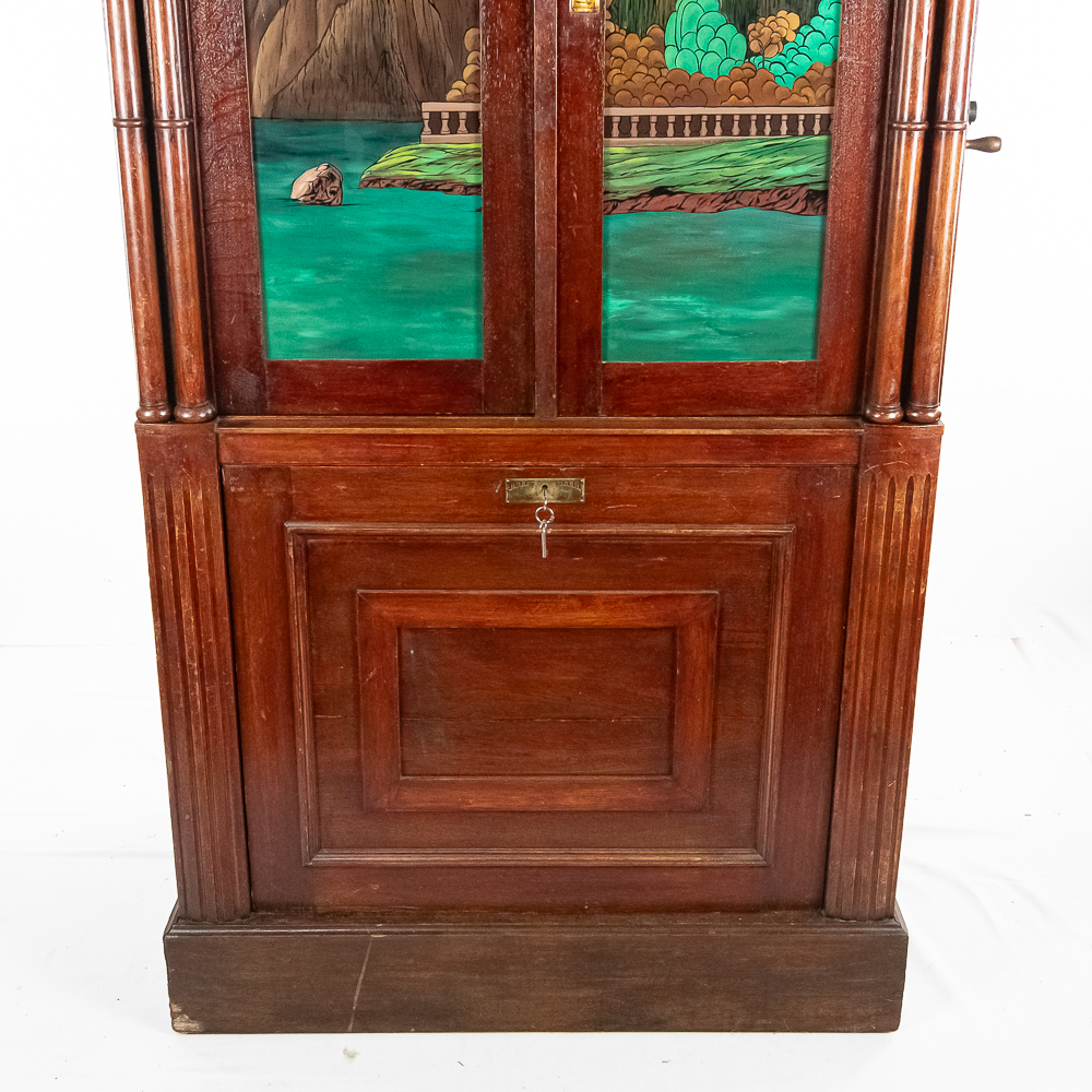 This Saxon Orchestrion “Eldorado” machine in its large oak cabinet has been refinished and is in average condition with several pieces of decorative crown molding at the top that is either loose or missing.. The cabinet features 4 turned columns on the front as well as two large reverse painted glass panels featuring water, mountains, trees and a castle scene. The lower front panel which is flanked by 2 fluted pilasters gives access to a storage compartment for an additional wooden cob. This instrument plays a large 10″ D X 25″ L 6 tune wooden barrel/cob. The crank wound weight operated mechanism that is coin operated with a 10 mark coin features piano with mandolin affects, castanets, wood bar xylophone, cymbal and drum. The piano has a cast iron harp and the weights which operate the instrument are housed in a bin which hangs from a cable on the back side of the instrument. The entire mechanism is quite clean for its age. The machine comes with one additional 9 tune wooden cob. Also included are the two old original front glass panels. Also included are two cabinet keys, This machine was made in Germany by an unknown maker circa 1890-1910. An interesting bit of trivia is this instrument came out of Butch McGuire’s Saloon, 20 W. Division Street, Chicago and in service there till 1994. Cabinet measures 40″ W X 22″ D X 89″ T. Was said to be in good working order when moved to our location.