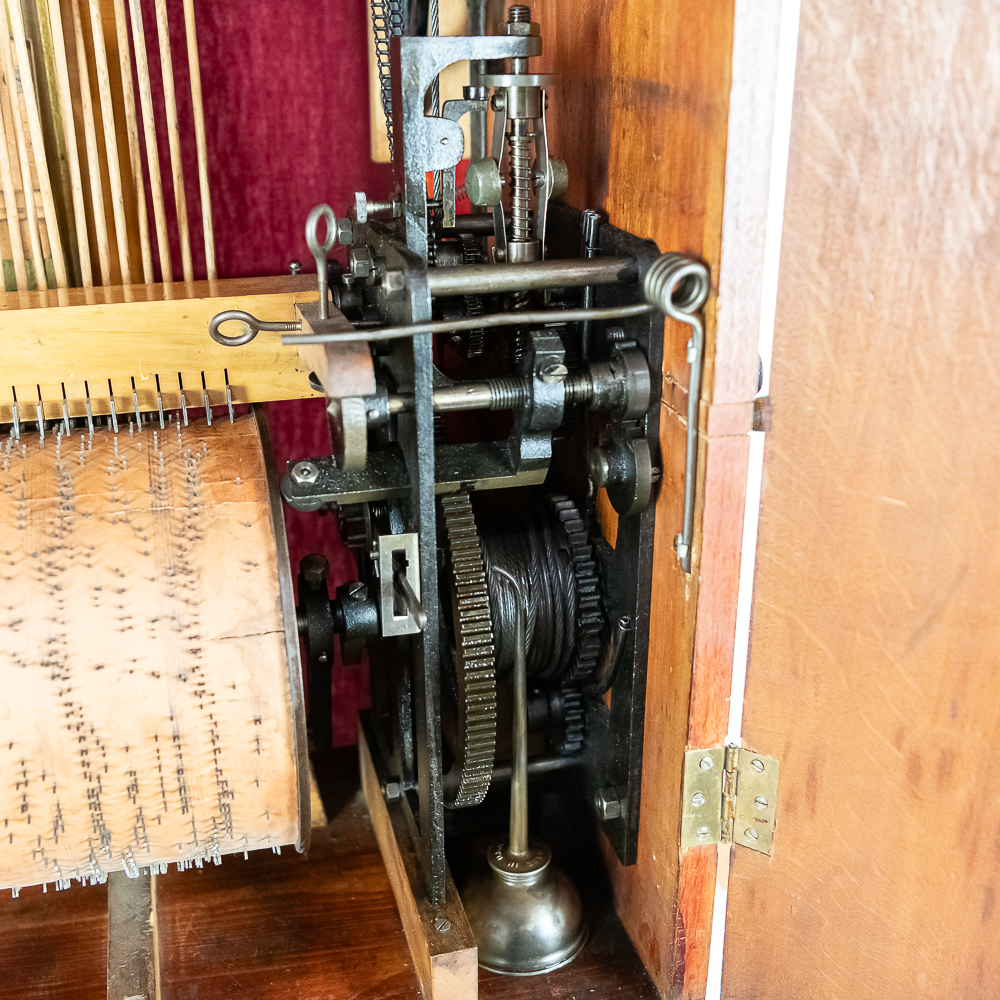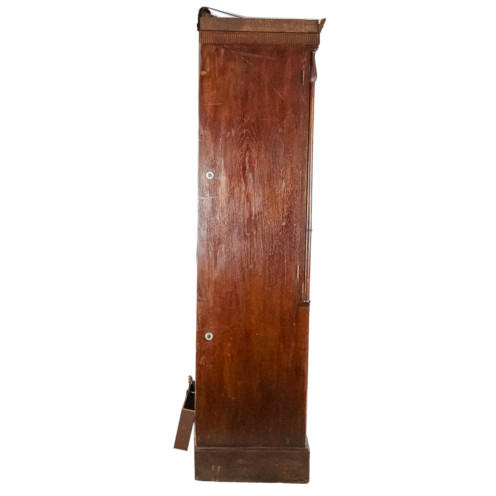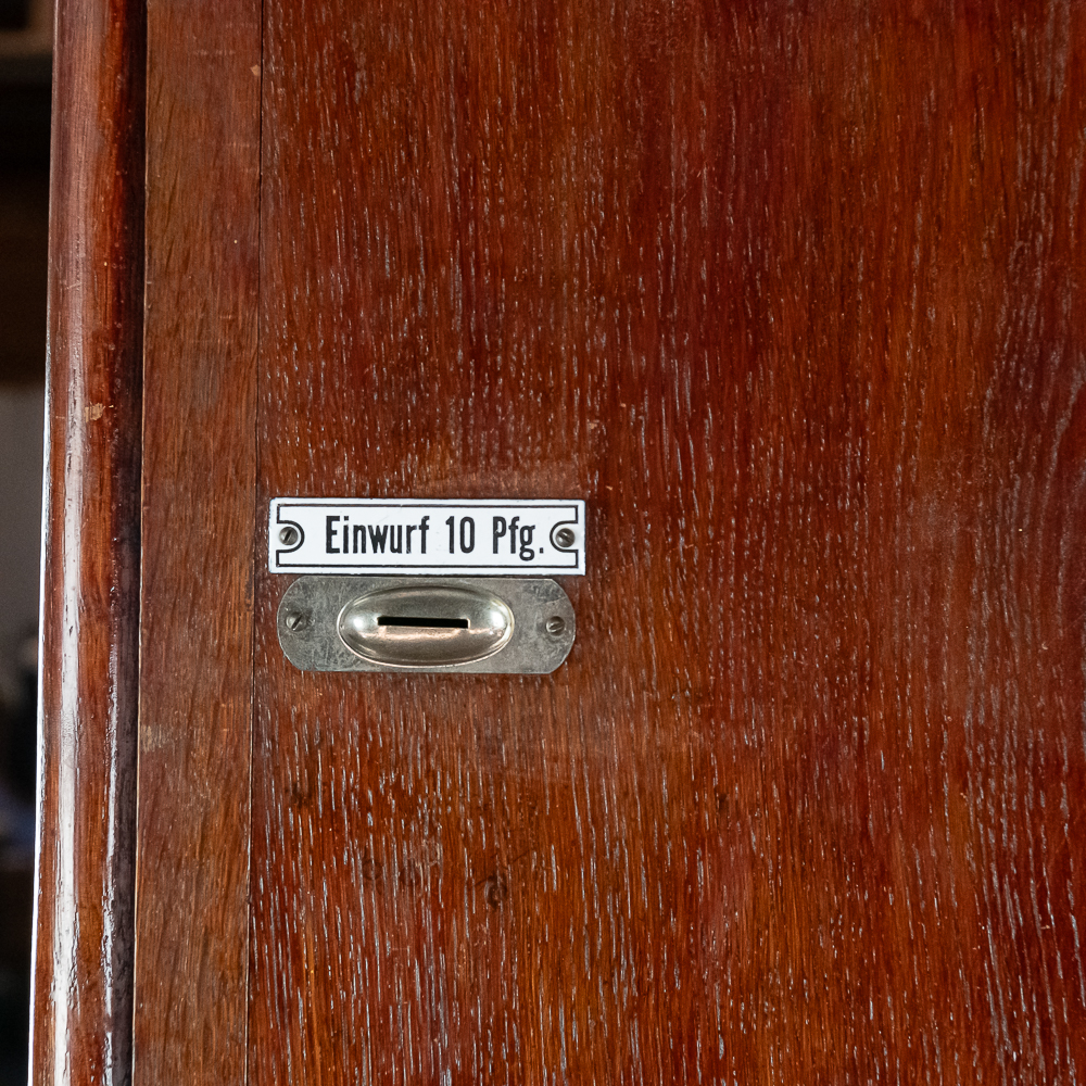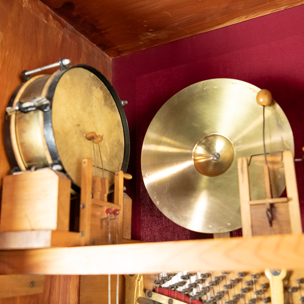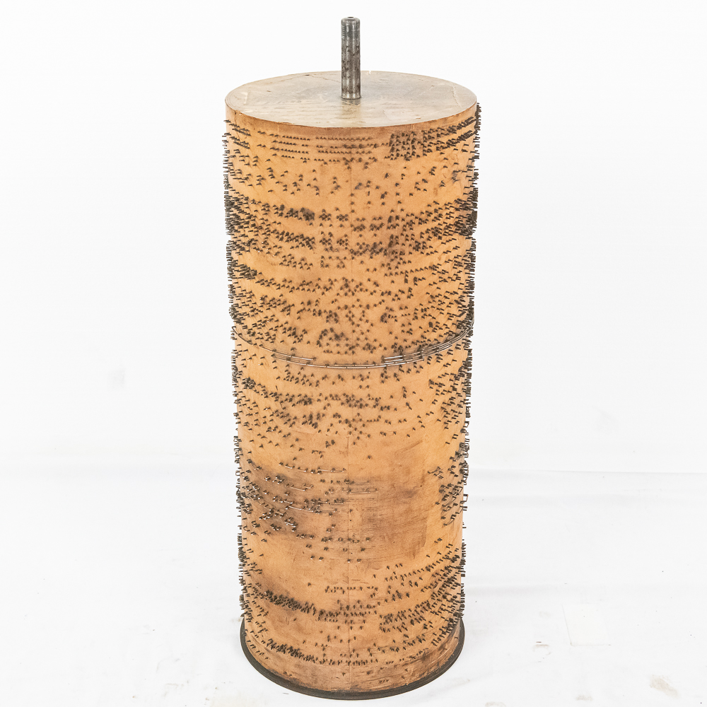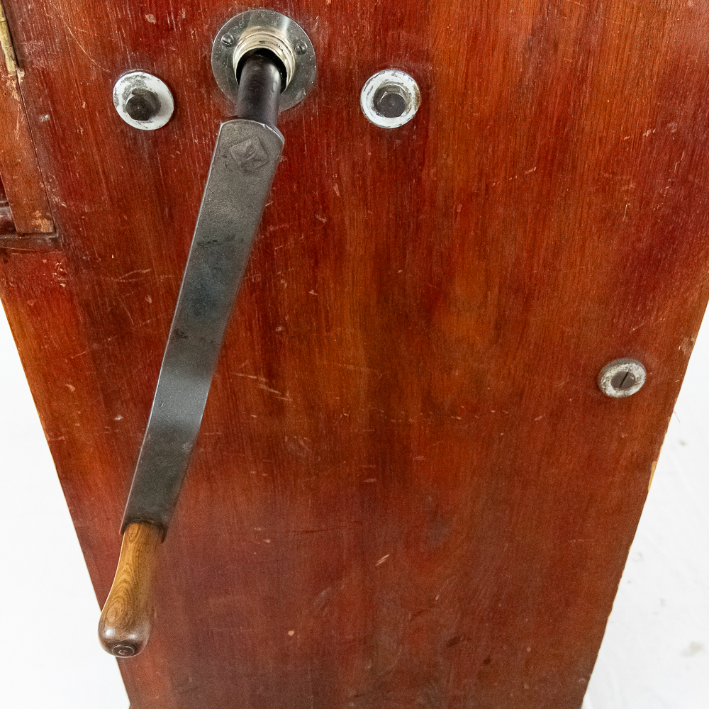 This Saxon Orchestrion “Eldorado” machine in its large oak cabinet has been refinished and is in average condition with several pieces of decorative crown molding at the top that is either loose or missing.. The cabinet features 4 turned columns on the front as well as two large reverse painted glass panels featuring water, mountains, trees and a castle scene. The lower front panel which is flanked by 2 fluted pilasters gives access to a storage compartment for an additional wooden cob. This instrument plays a large 10″ D X 25″ L 6 tune wooden barrel/cob. The crank wound weight operated mechanism that is coin operated with a 10 mark coin features piano with mandolin affects, castanets, wood bar xylophone, cymbal and drum. The piano has a cast iron harp and the weights which operate the instrument are housed in a bin which hangs from a cable on the back side of the instrument. The entire mechanism is quite clean for its age. The machine comes with one additional 9 tune wooden cob. Also included are the two old original front glass panels. Also included are two cabinet keys, This machine was made in Germany by an unknown maker circa 1890-1910. An interesting bit of trivia is this instrument came out of Butch McGuire’s Saloon, 20 W. Division Street, Chicago and in service there till 1994. Cabinet measures 40″ W X 22″ D X 89″ T. Was said to be in good working order when moved to our location.