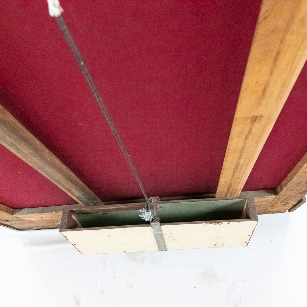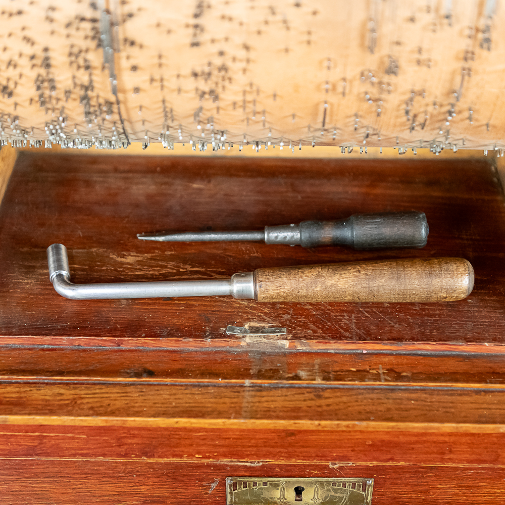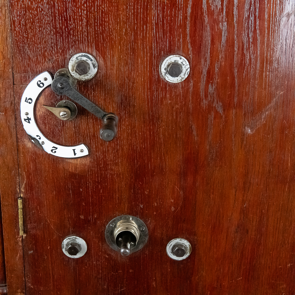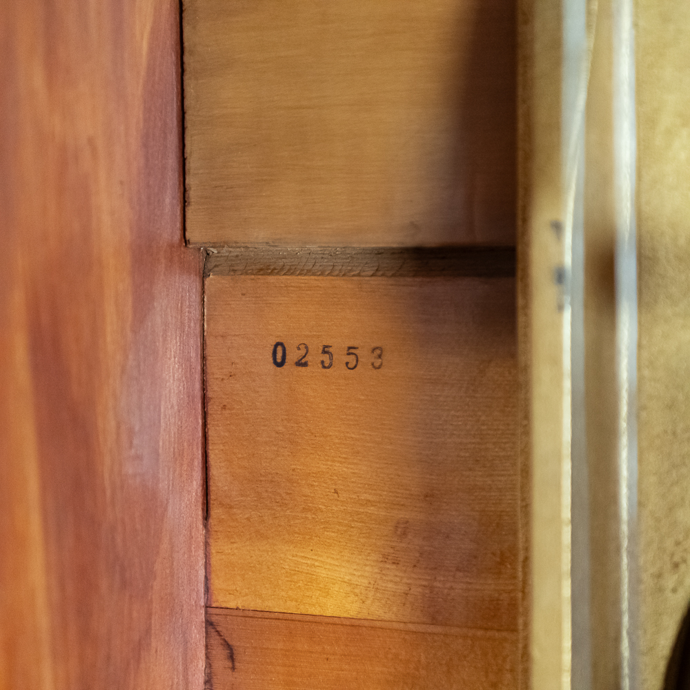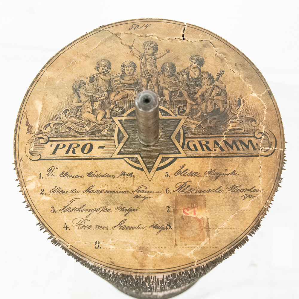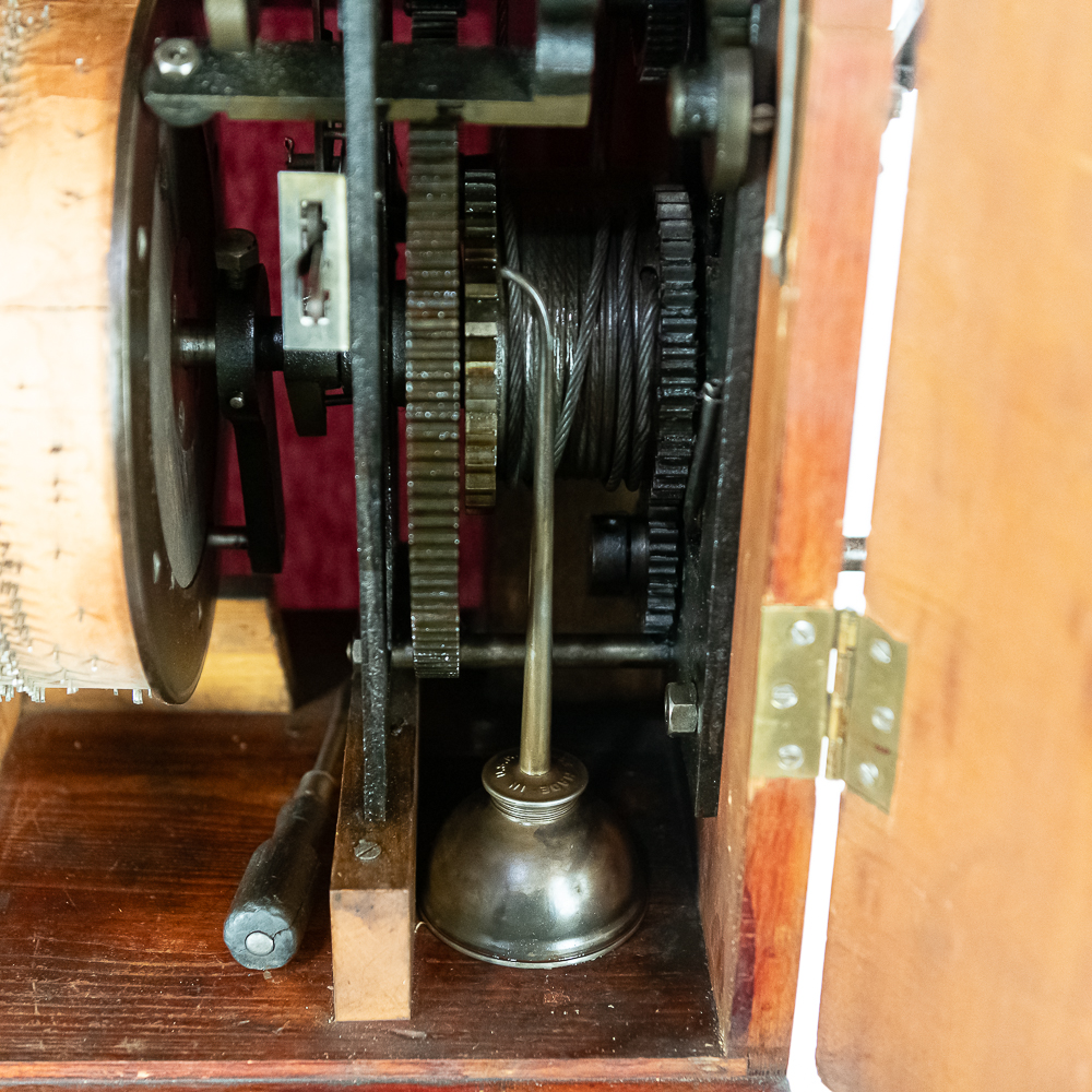This Saxon Orchestrion “Eldorado” machine in its large oak cabinet has been refinished and is in average condition with several pieces of decorative crown molding at the top that is either loose or missing.. The cabinet features 4 turned columns on the front as well as two large reverse painted glass panels featuring water, mountains, trees and a castle scene. The lower front panel which is flanked by 2 fluted pilasters gives access to a storage compartment for an additional wooden cob. This instrument plays a large 10″ D X 25″ L 6 tune wooden barrel/cob. The crank wound weight operated mechanism that is coin operated with a 10 mark coin features piano with mandolin affects, castanets, wood bar xylophone, cymbal and drum. The piano has a cast iron harp and the weights which operate the instrument are housed in a bin which hangs from a cable on the back side of the instrument. The entire mechanism is quite clean for its age. The machine comes with one additional 9 tune wooden cob. Also included are the two old original front glass panels. Also included are two cabinet keys, This machine was made in Germany by an unknown maker circa 1890-1910. An interesting bit of trivia is this instrument came out of Butch McGuire’s Saloon, 20 W. Division Street, Chicago and in service there till 1994. Cabinet measures 40″ W X 22″ D X 89″ T. Was said to be in good working order when moved to our location.