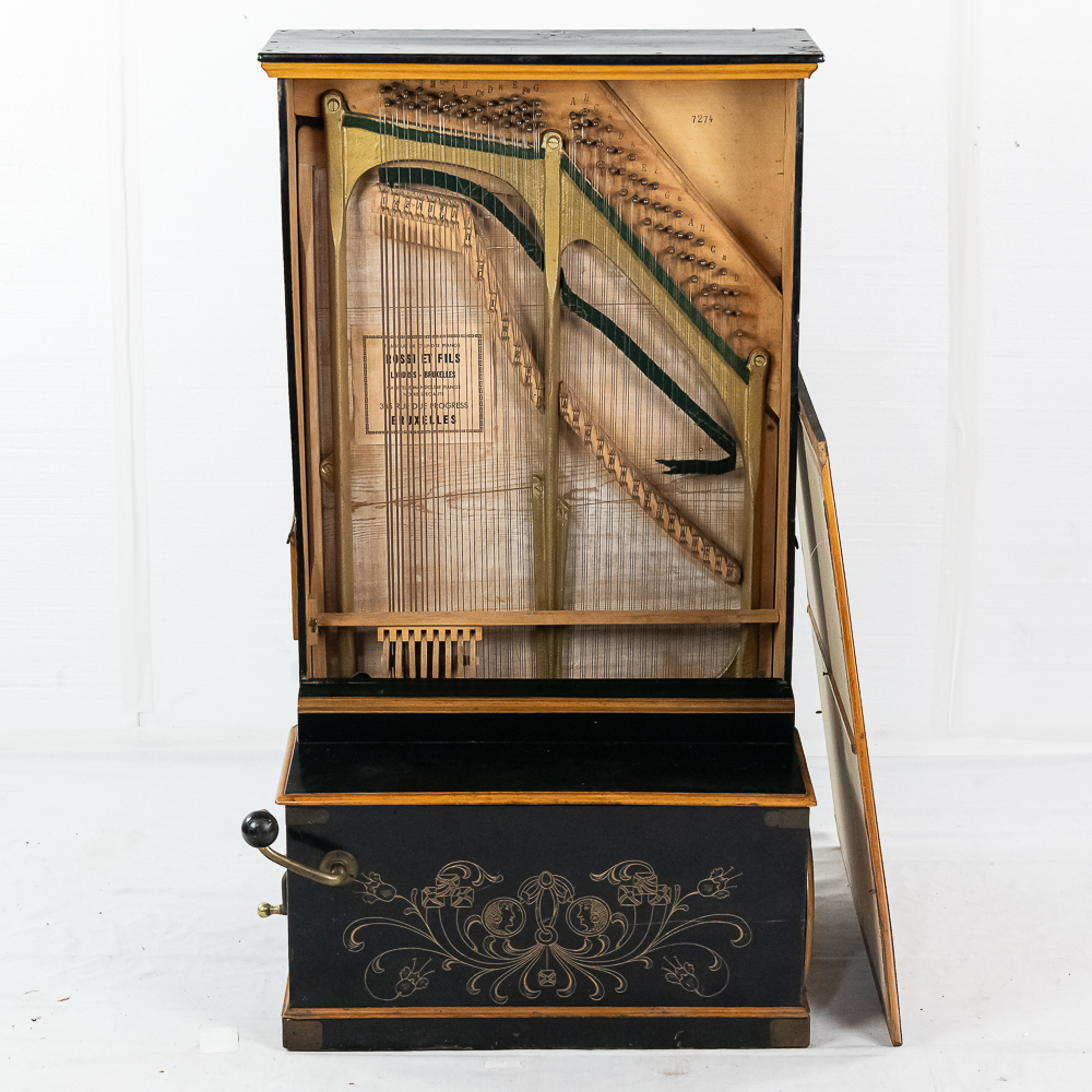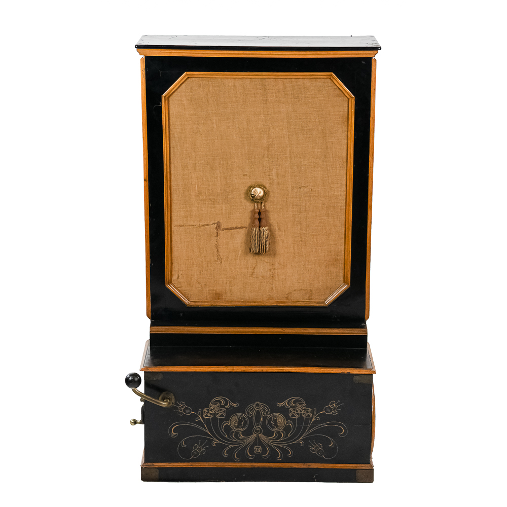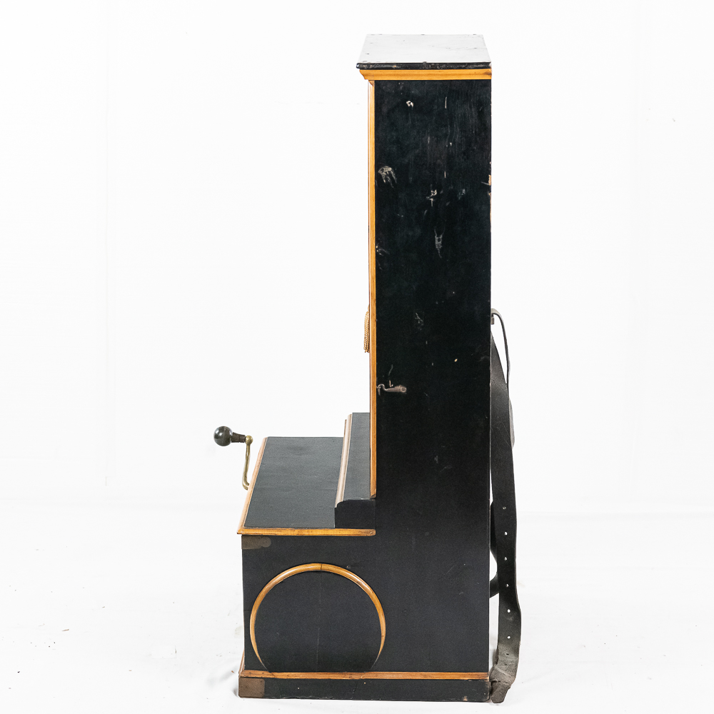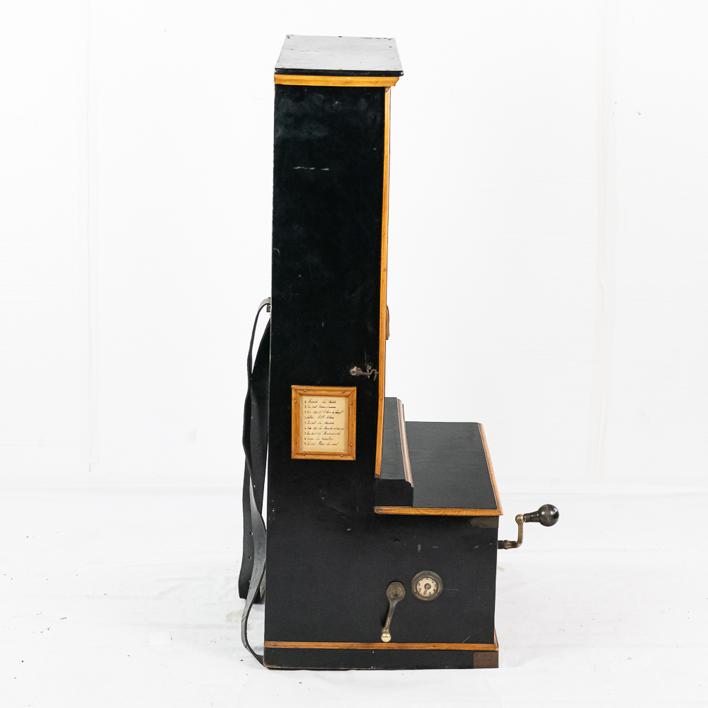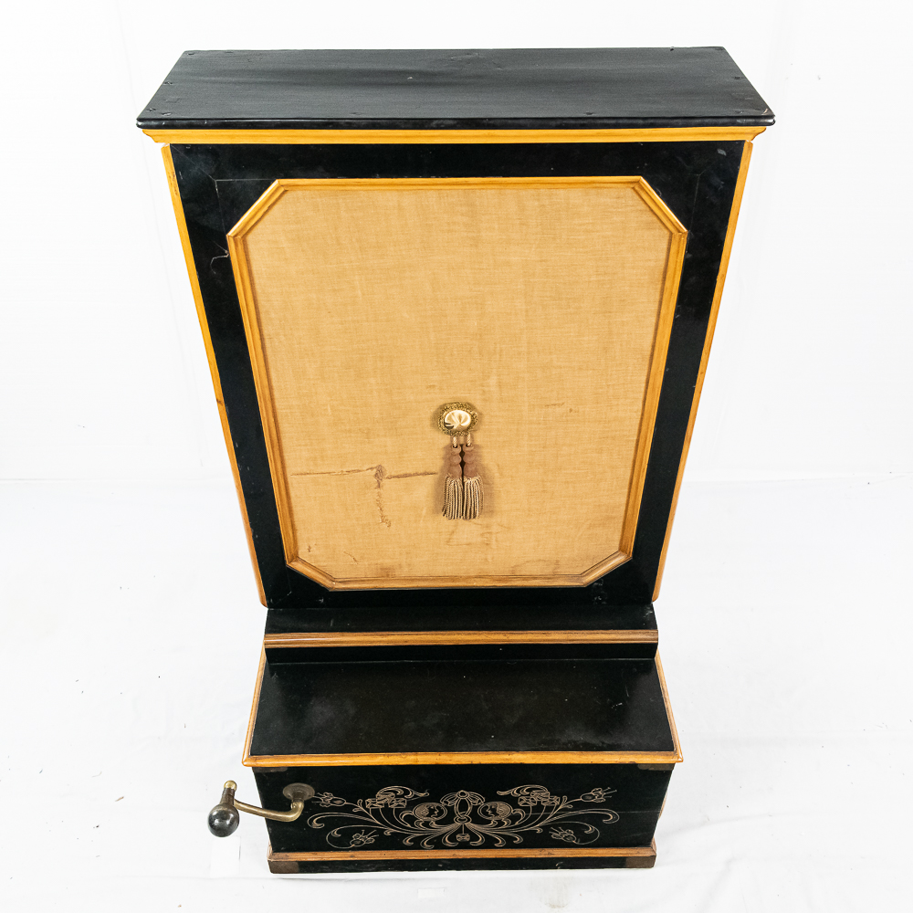 A unique and interesting machine in its wood cabinet has its original black lacquer finish with blonde wood highlights and borders throughout. Has an older original grill cloth with decorative tassels and has evidence of having been repaired and reinforced.. The decorative embossed lower front panel features plant like design with two female faces. The left side of the cabinet has a blonde wooden frame with what appears to be an original tune card listing the 8 selections it plays. Also on the left side of the cabinet is a tune indicator with numbers 1-8 indicating which tune is being played. The barrel operated mechanism is extremely clean and in good working order. Has evidence of having been completely restored and re strung and is in good working order. Has its original operating crank. The mechanism operates smoothly and plays well. Unlike most other barrel pianos this one has a small cast iron harp which allows the instrument to be tuned and hold a tune better than most. Has an old fragile leather carrying strap on the back of the piano. Cabinet measures 24″ W X 17-1/2″ D X 44″ T.