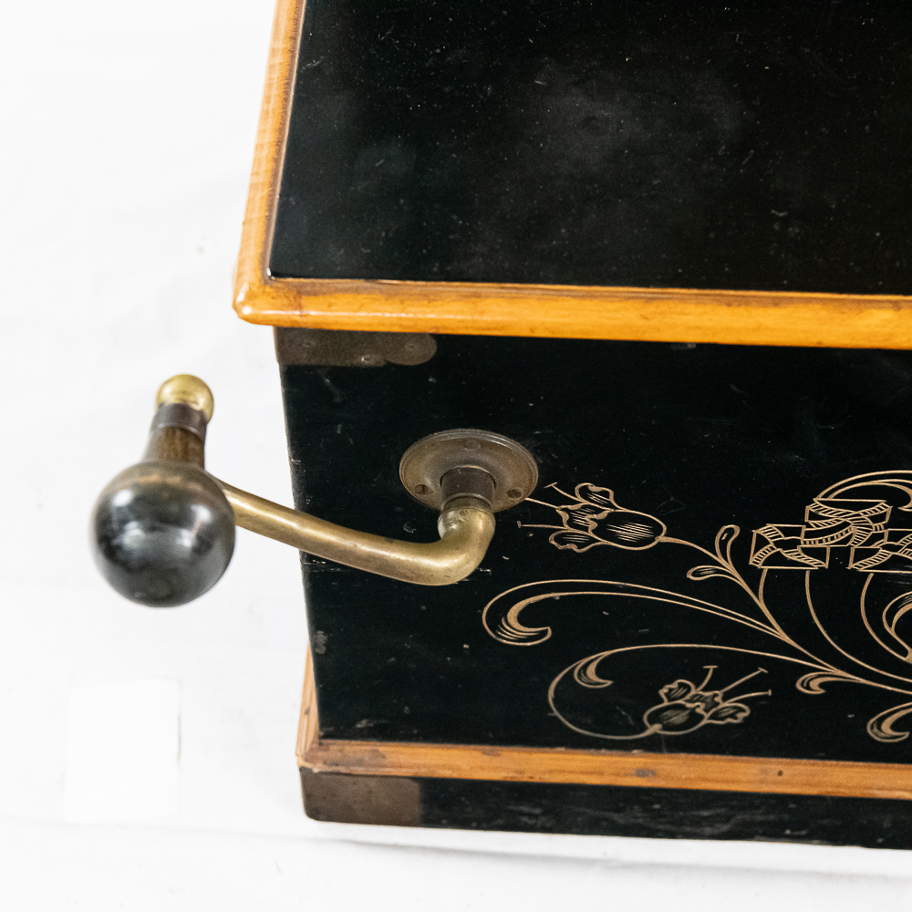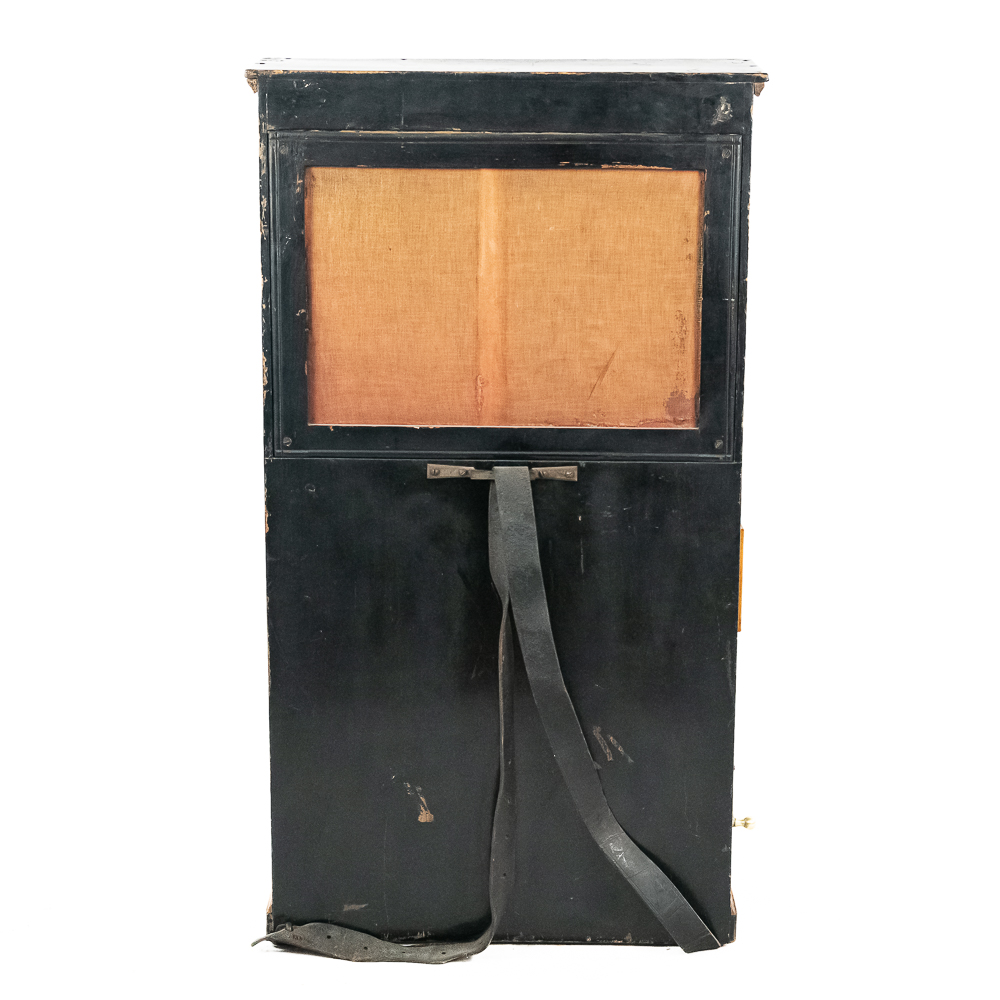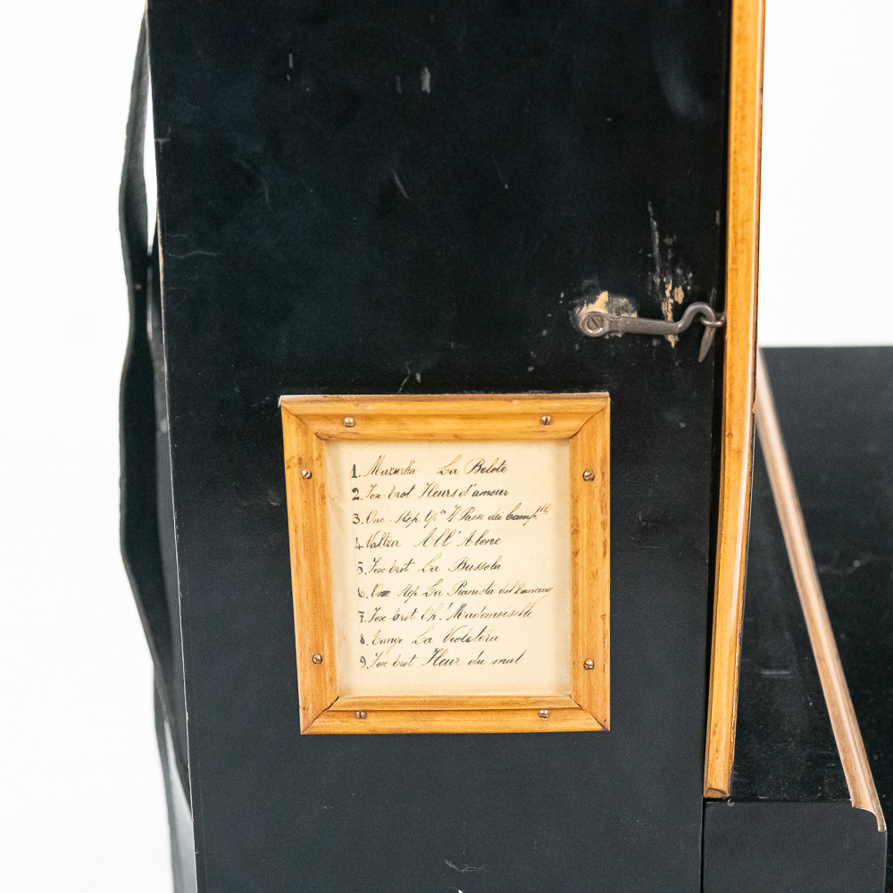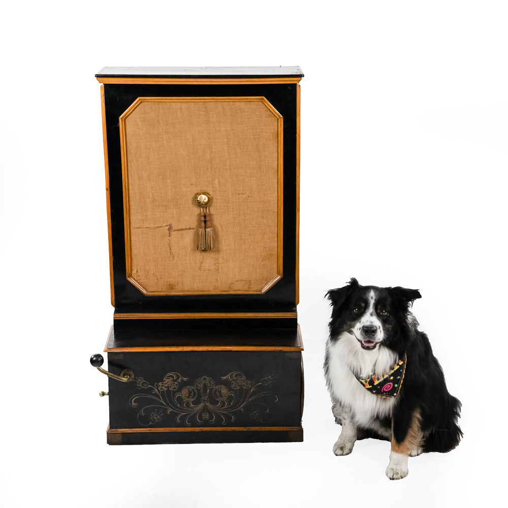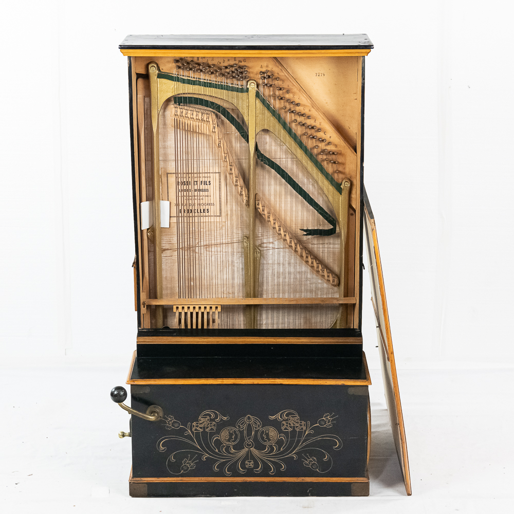 A unique and interesting machine in its wood cabinet has its original black lacquer finish with blonde wood highlights and borders throughout. Has an older original grill cloth with decorative tassels and has evidence of having been repaired and reinforced.. The decorative embossed lower front panel features plant like design with two female faces. The left side of the cabinet has a blonde wooden frame with what appears to be an original tune card listing the 8 selections it plays. Also on the left side of the cabinet is a tune indicator with numbers 1-8 indicating which tune is being played. The barrel operated mechanism is extremely clean and in good working order. Has evidence of having been completely restored and re strung and is in good working order. Has its original operating crank. The mechanism operates smoothly and plays well. Unlike most other barrel pianos this one has a small cast iron harp which allows the instrument to be tuned and hold a tune better than most. Has an old fragile leather carrying strap on the back of the piano. Cabinet measures 24″ W X 17-1/2″ D X 44″ T.