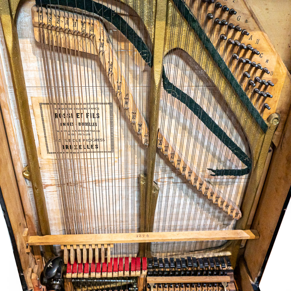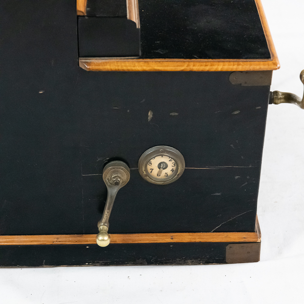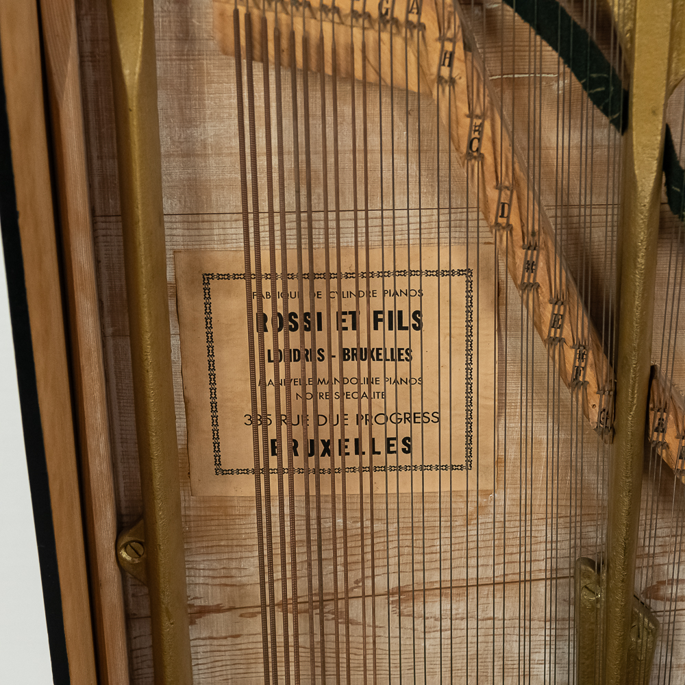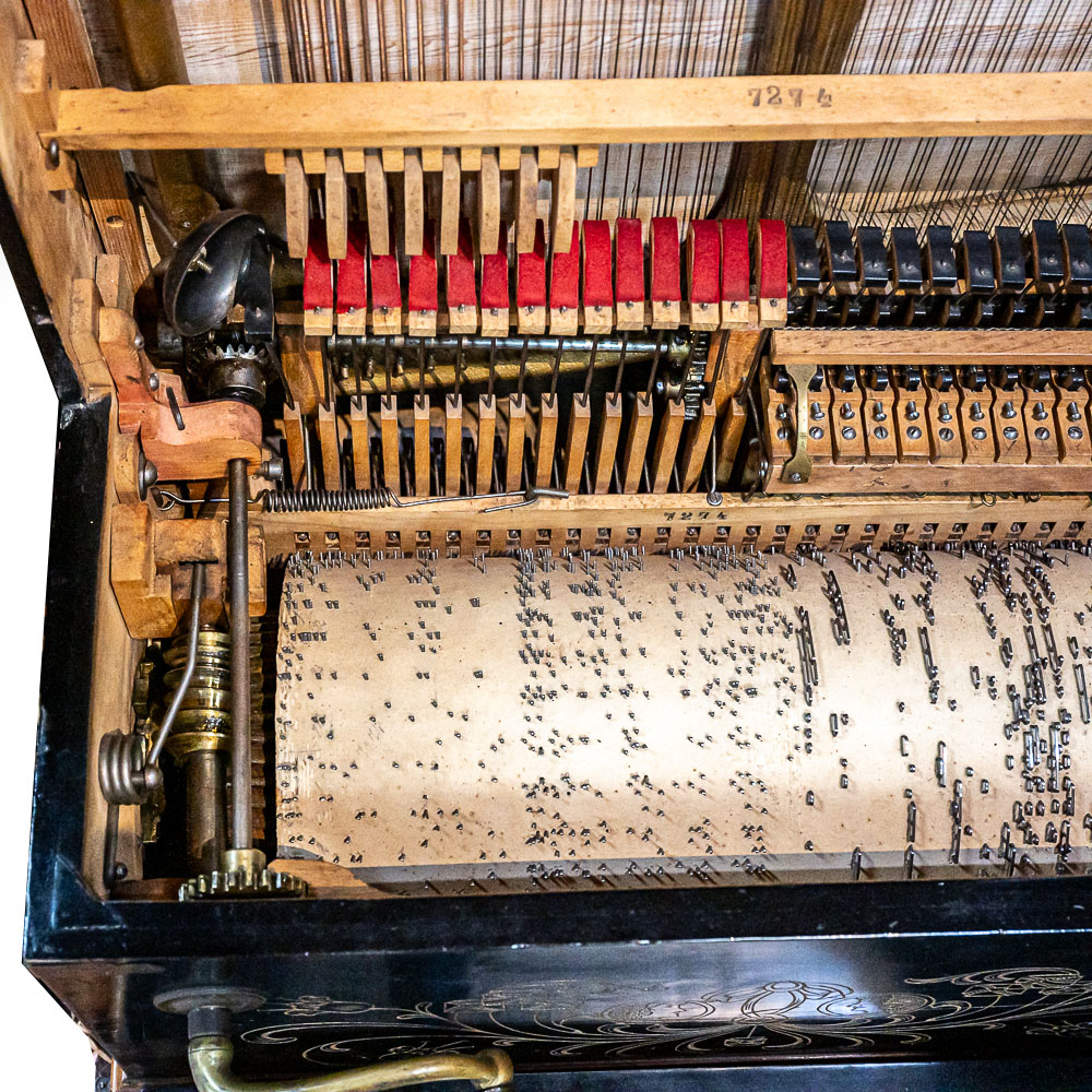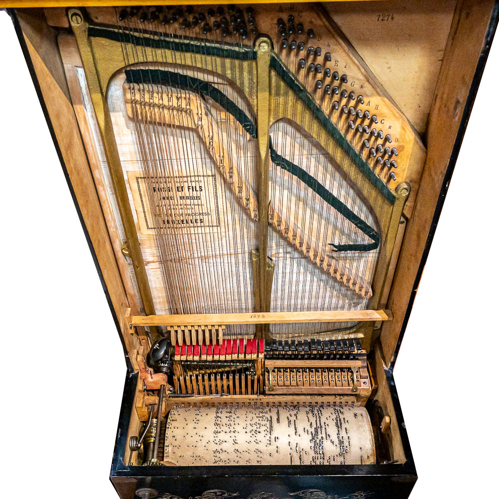 A unique and interesting machine in its wood cabinet has its original black lacquer finish with blonde wood highlights and borders throughout. Has an older original grill cloth with decorative tassels and has evidence of having been repaired and reinforced.. The decorative embossed lower front panel features plant like design with two female faces. The left side of the cabinet has a blonde wooden frame with what appears to be an original tune card listing the 8 selections it plays. Also on the left side of the cabinet is a tune indicator with numbers 1-8 indicating which tune is being played. The barrel operated mechanism is extremely clean and in good working order. Has evidence of having been completely restored and re strung and is in good working order. Has its original operating crank. The mechanism operates smoothly and plays well. Unlike most other barrel pianos this one has a small cast iron harp which allows the instrument to be tuned and hold a tune better than most. Has an old fragile leather carrying strap on the back of the piano. Cabinet measures 24″ W X 17-1/2″ D X 44″ T.