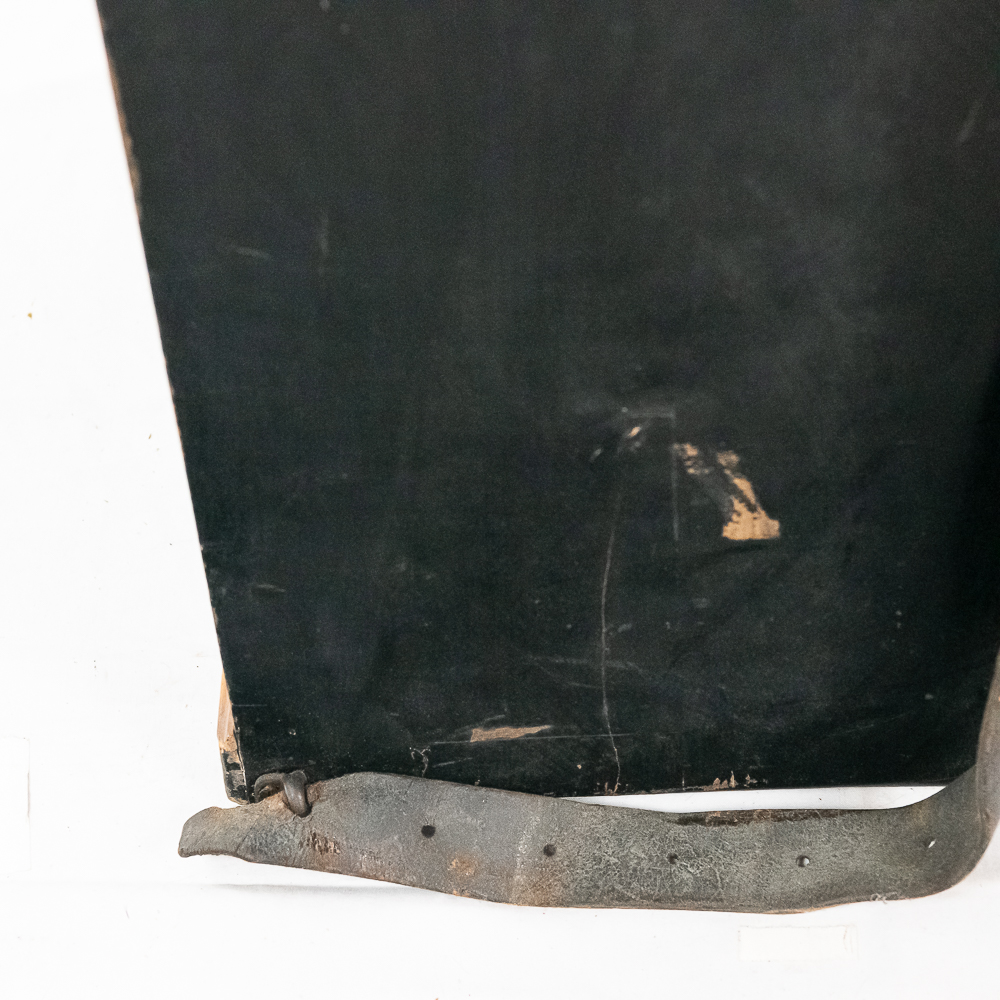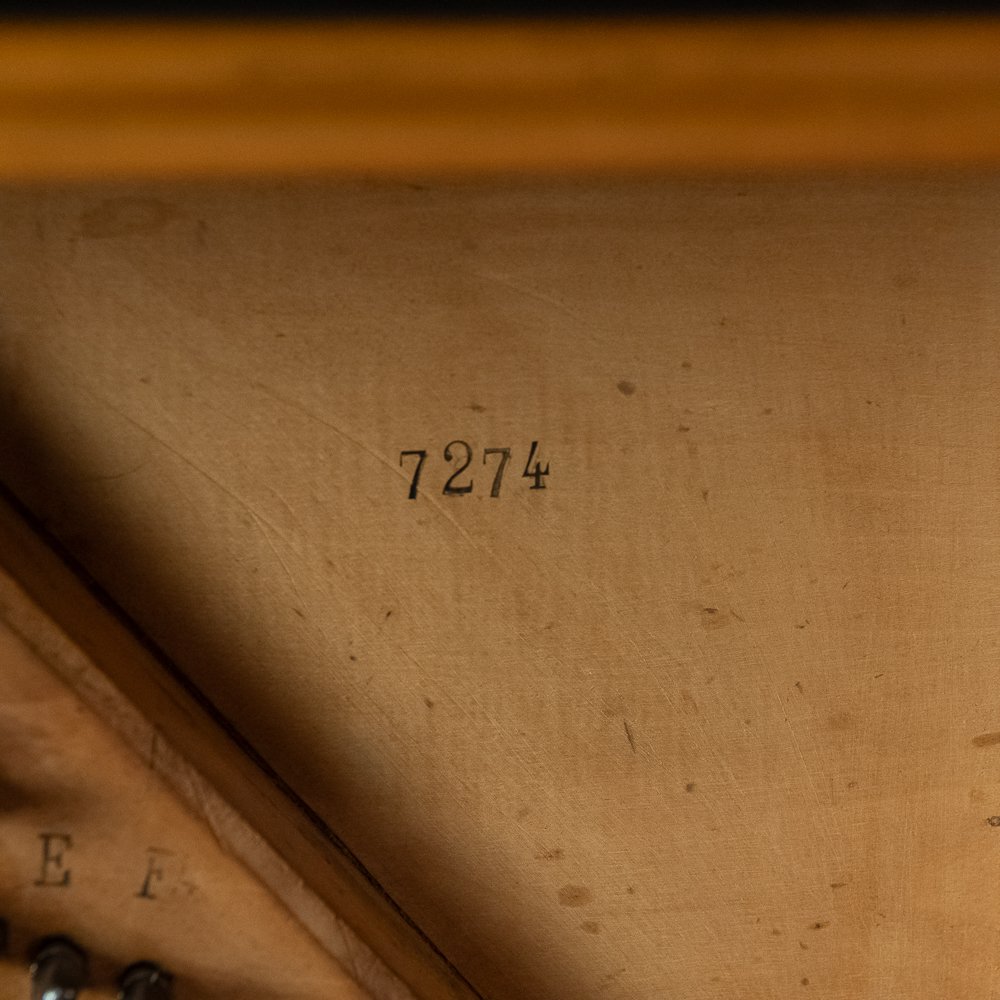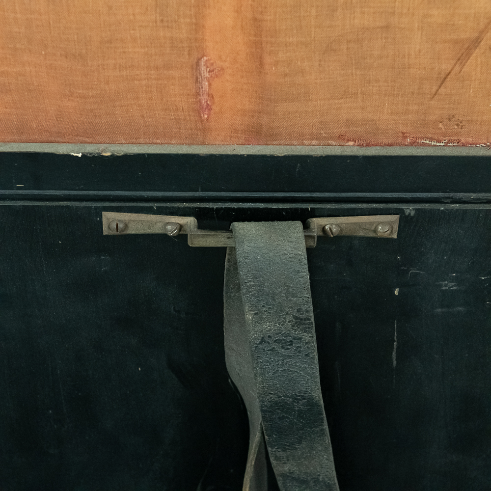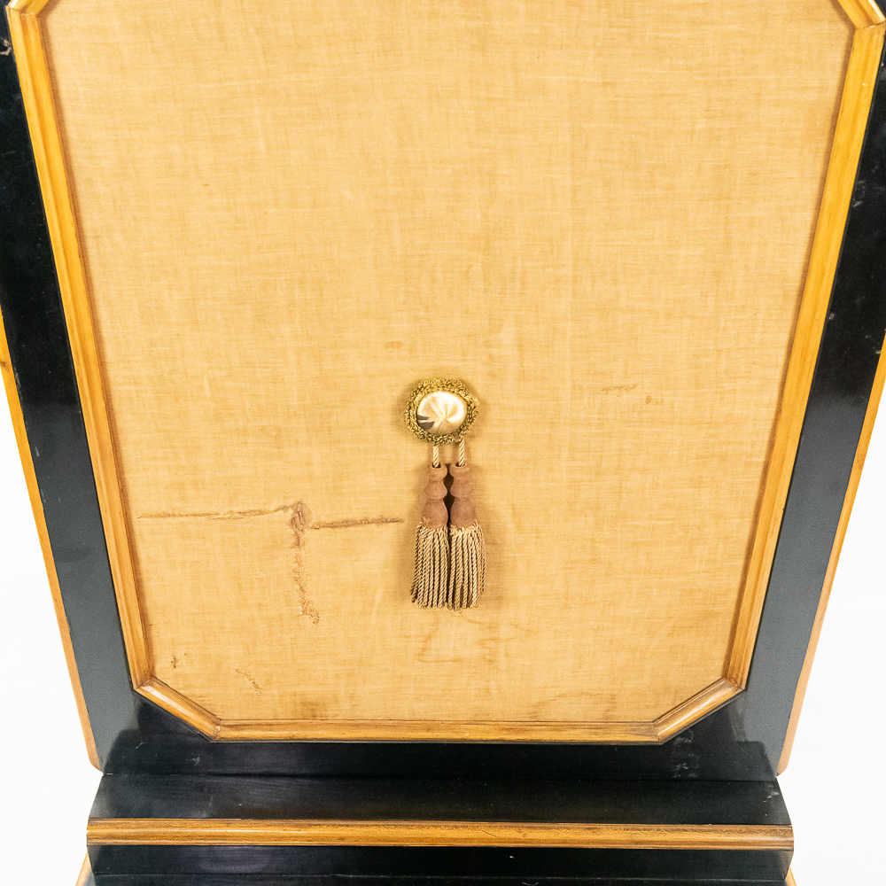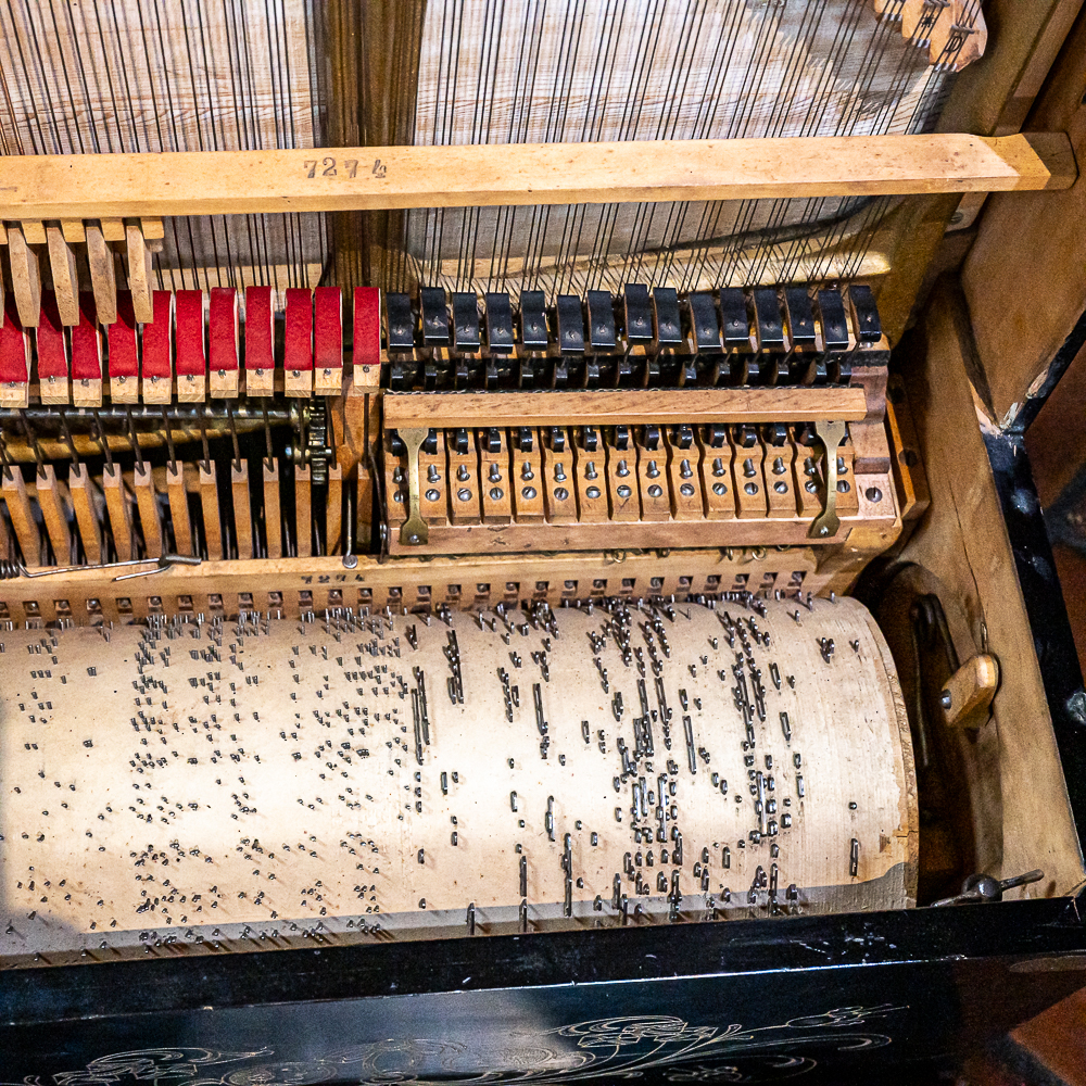 A unique and interesting machine in its wood cabinet has its original black lacquer finish with blonde wood highlights and borders throughout. Has an older original grill cloth with decorative tassels and has evidence of having been repaired and reinforced.. The decorative embossed lower front panel features plant like design with two female faces. The left side of the cabinet has a blonde wooden frame with what appears to be an original tune card listing the 8 selections it plays. Also on the left side of the cabinet is a tune indicator with numbers 1-8 indicating which tune is being played. The barrel operated mechanism is extremely clean and in good working order. Has evidence of having been completely restored and re strung and is in good working order. Has its original operating crank. The mechanism operates smoothly and plays well. Unlike most other barrel pianos this one has a small cast iron harp which allows the instrument to be tuned and hold a tune better than most. Has an old fragile leather carrying strap on the back of the piano. Cabinet measures 24″ W X 17-1/2″ D X 44″ T.