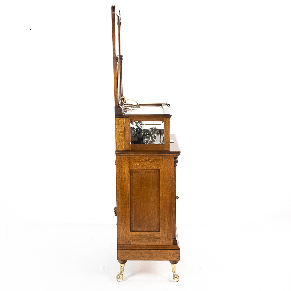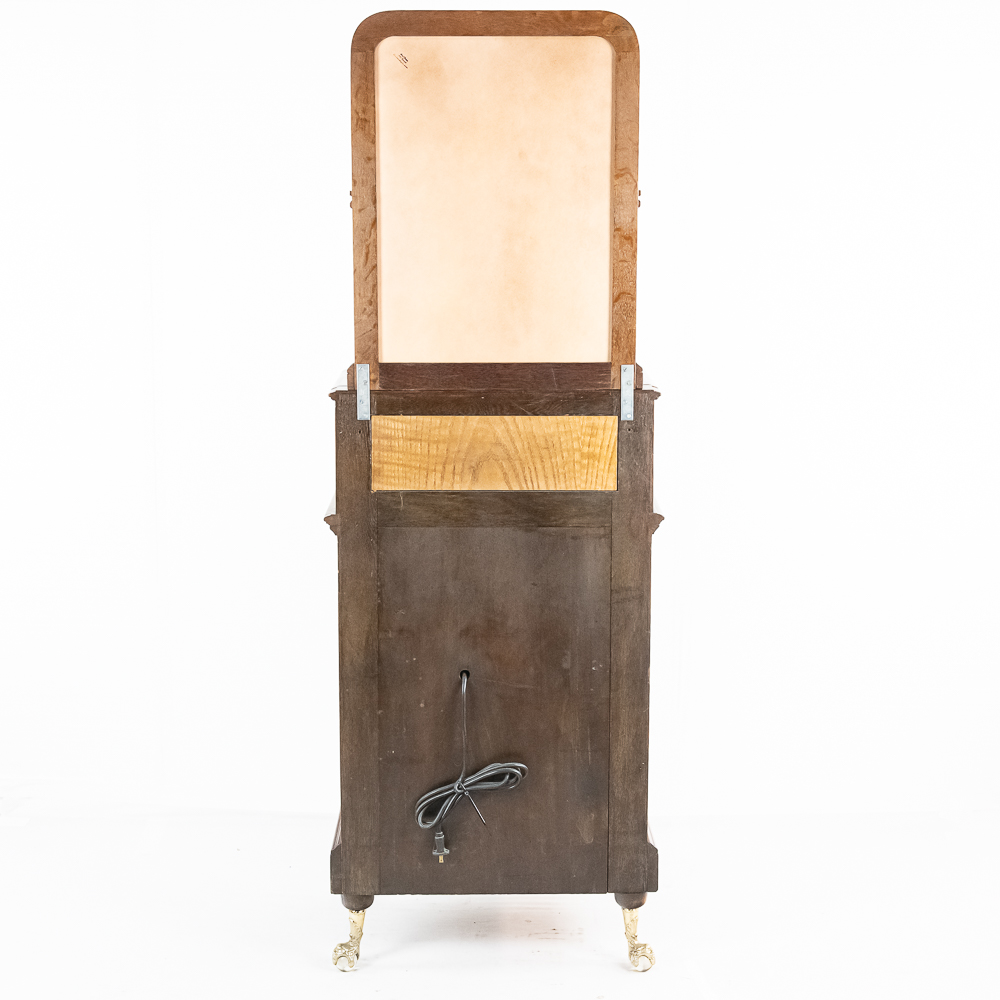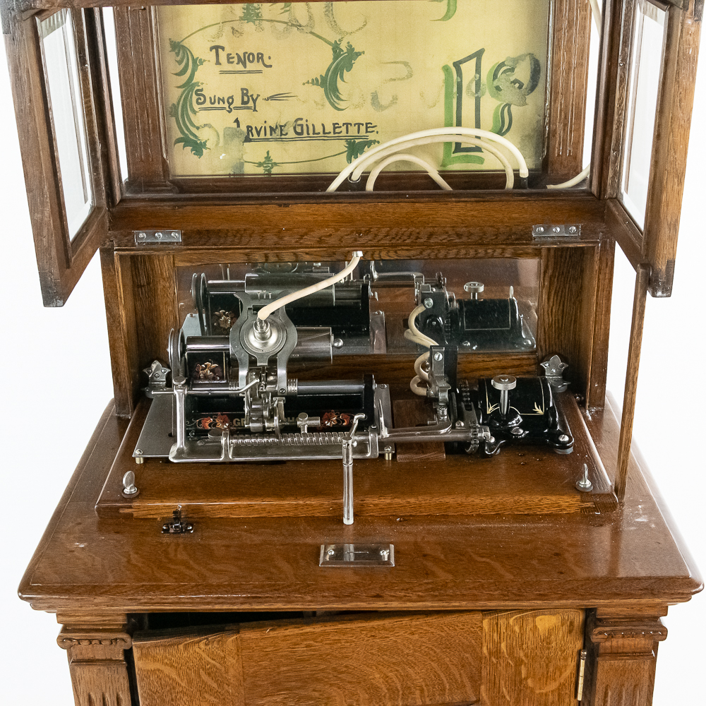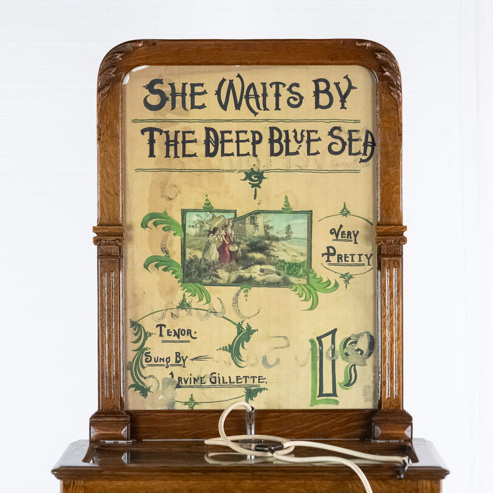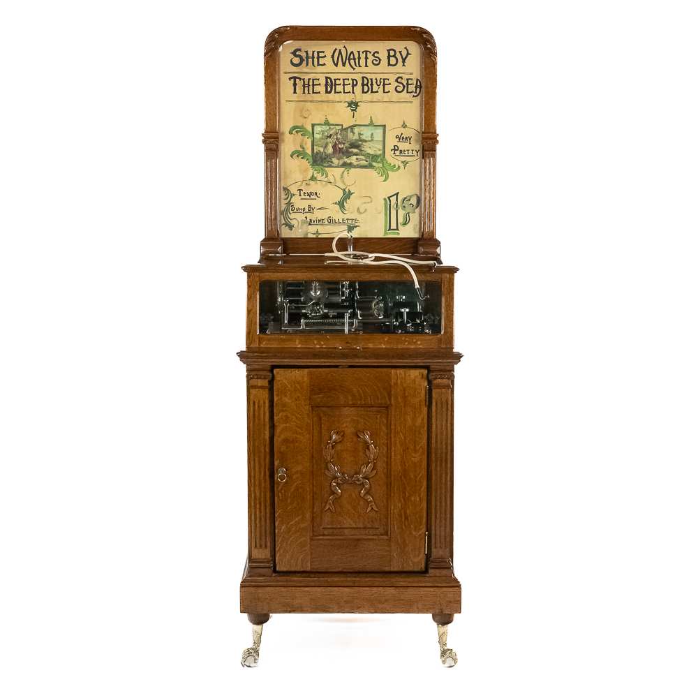 Made by the Rosenfield Mfg. Co. of New York circa 1905 this coin operated phonograph is the forerunner of what would become the juke box industry. Using a Columbia Type AZ 2 minute cylinder phonograph mechanism Rosenfield held several important patents unique to this machine including an electric motor that rewound the spring motor after the record played. The oak cabinet is on cast iron claw foot legs holding glass balls. The glass and oak fame mechanism cover has beveled glass. The oak wood frame original marquee holds an original hand painted poster advertising the record, “She Waits by the Deep Blue Sea” which matches the cylinder on the machine. 1 cent operation and listen through a set of primitive ear phones. The machine has been professionally restored some years ago and presents very well. The original Emerson Electric 110 volt AC motor winds the spring after the record plays. There are only a handful of these machines known to exist and this definitely ranks at the top. Original locks with replacement key. Measures 71.5″ tall to the top of the removable marquee, 25″ wide, 17″ deep.