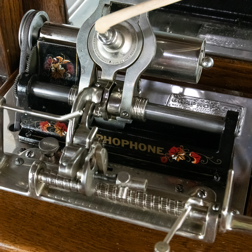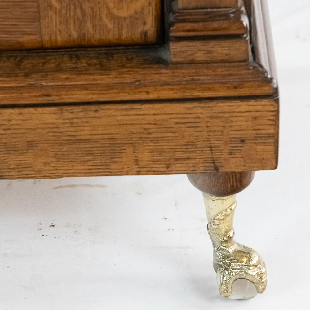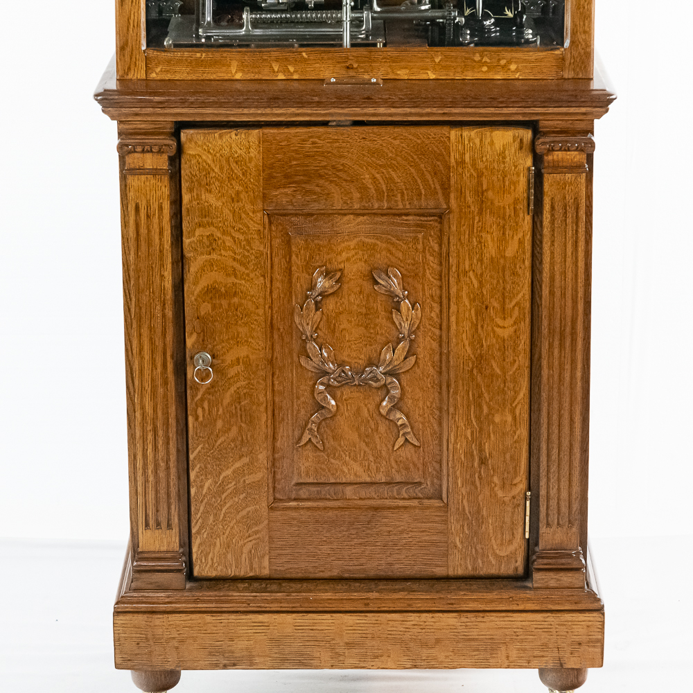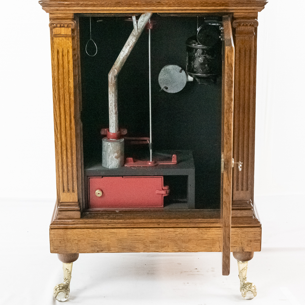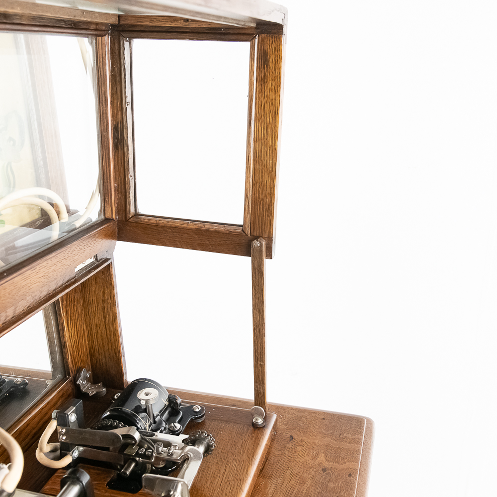 Made by the Rosenfield Mfg. Co. of New York circa 1905 this coin operated phonograph is the forerunner of what would become the juke box industry. Using a Columbia Type AZ 2 minute cylinder phonograph mechanism Rosenfield held several important patents unique to this machine including an electric motor that rewound the spring motor after the record played. The oak cabinet is on cast iron claw foot legs holding glass balls. The glass and oak fame mechanism cover has beveled glass. The oak wood frame original marquee holds an original hand painted poster advertising the record, “She Waits by the Deep Blue Sea” which matches the cylinder on the machine. 1 cent operation and listen through a set of primitive ear phones. The machine has been professionally restored some years ago and presents very well. The original Emerson Electric 110 volt AC motor winds the spring after the record plays. There are only a handful of these machines known to exist and this definitely ranks at the top. Original locks with replacement key. Measures 71.5″ tall to the top of the removable marquee, 25″ wide, 17″ deep.