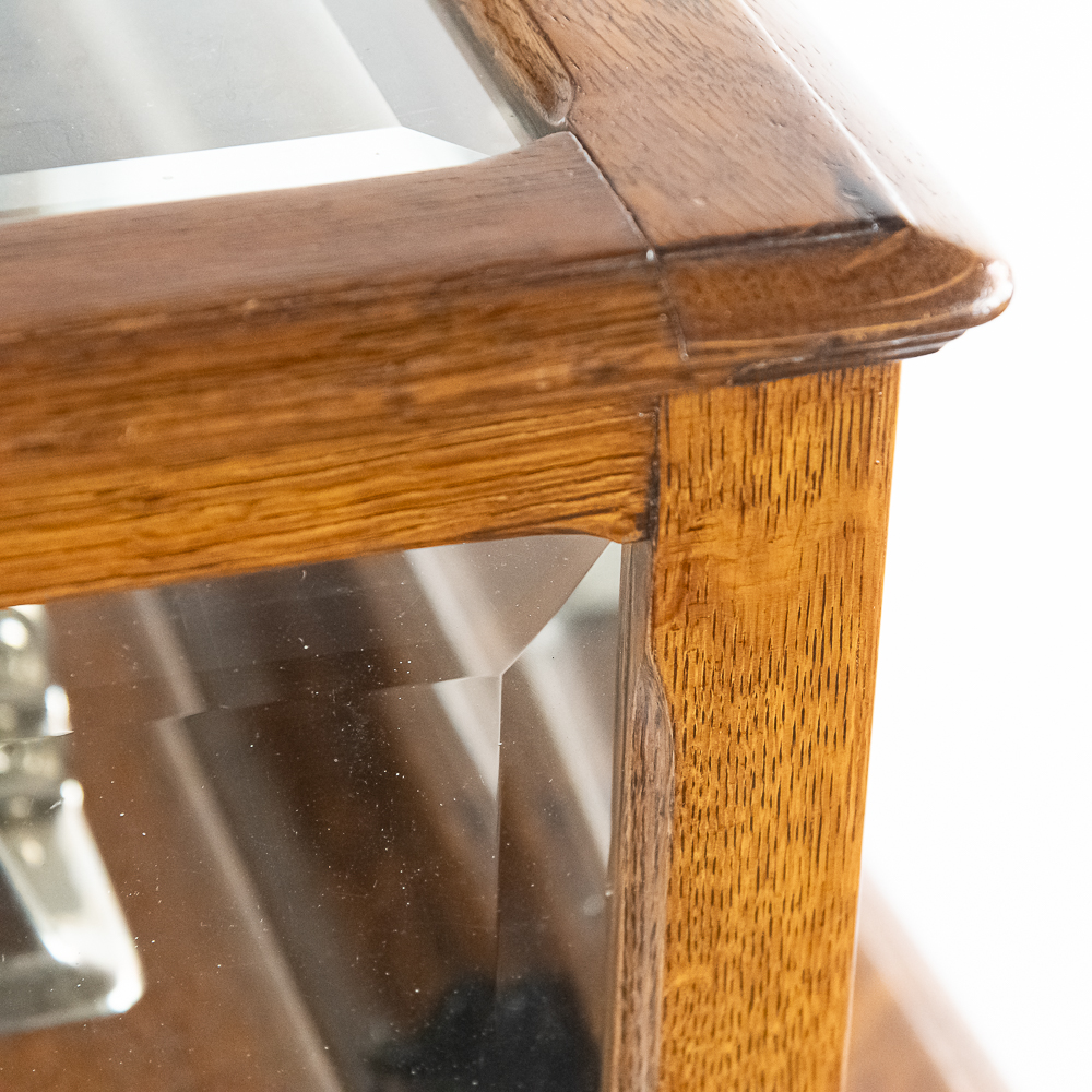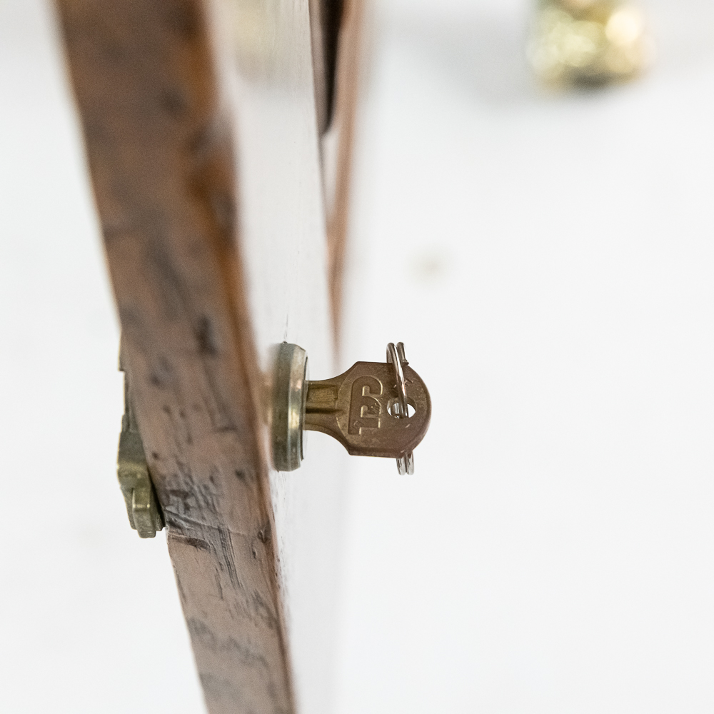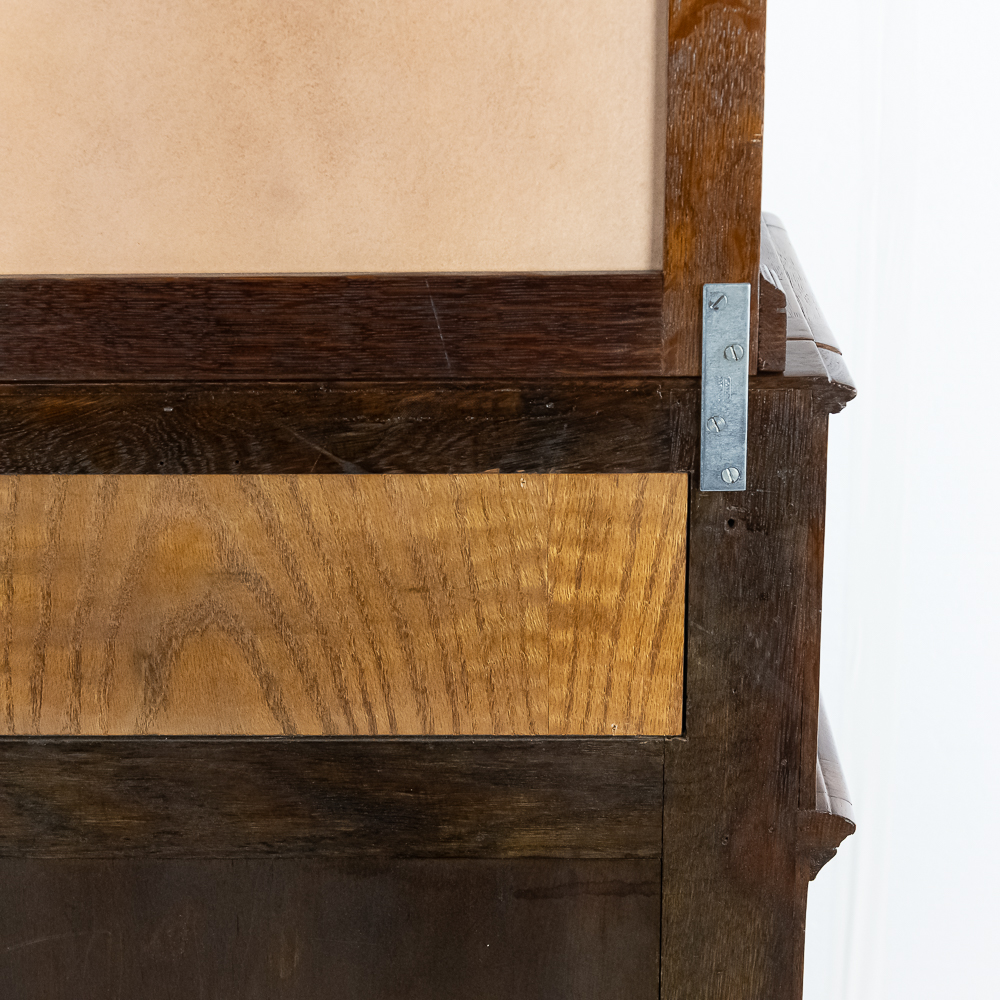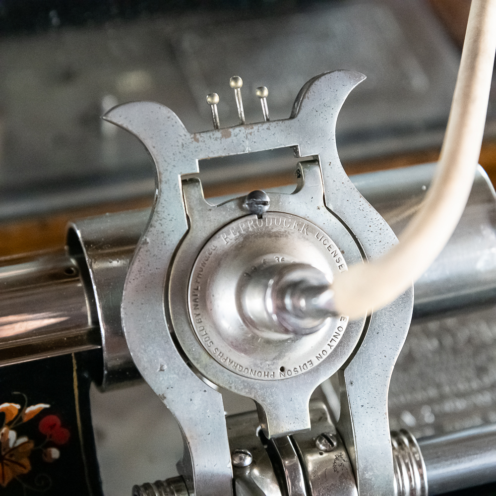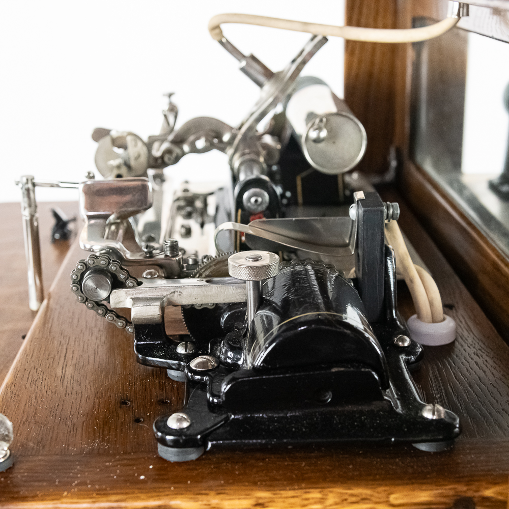 Made by the Rosenfield Mfg. Co. of New York circa 1905 this coin operated phonograph is the forerunner of what would become the juke box industry. Using a Columbia Type AZ 2 minute cylinder phonograph mechanism Rosenfield held several important patents unique to this machine including an electric motor that rewound the spring motor after the record played. The oak cabinet is on cast iron claw foot legs holding glass balls. The glass and oak fame mechanism cover has beveled glass. The oak wood frame original marquee holds an original hand painted poster advertising the record, “She Waits by the Deep Blue Sea” which matches the cylinder on the machine. 1 cent operation and listen through a set of primitive ear phones. The machine has been professionally restored some years ago and presents very well. The original Emerson Electric 110 volt AC motor winds the spring after the record plays. There are only a handful of these machines known to exist and this definitely ranks at the top. Original locks with replacement key. Measures 71.5″ tall to the top of the removable marquee, 25″ wide, 17″ deep.