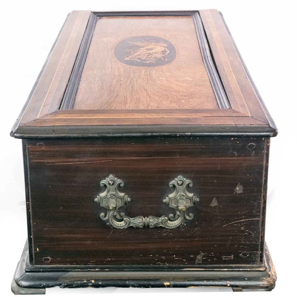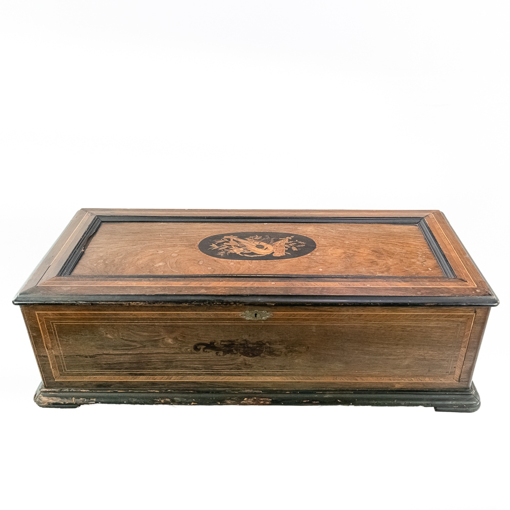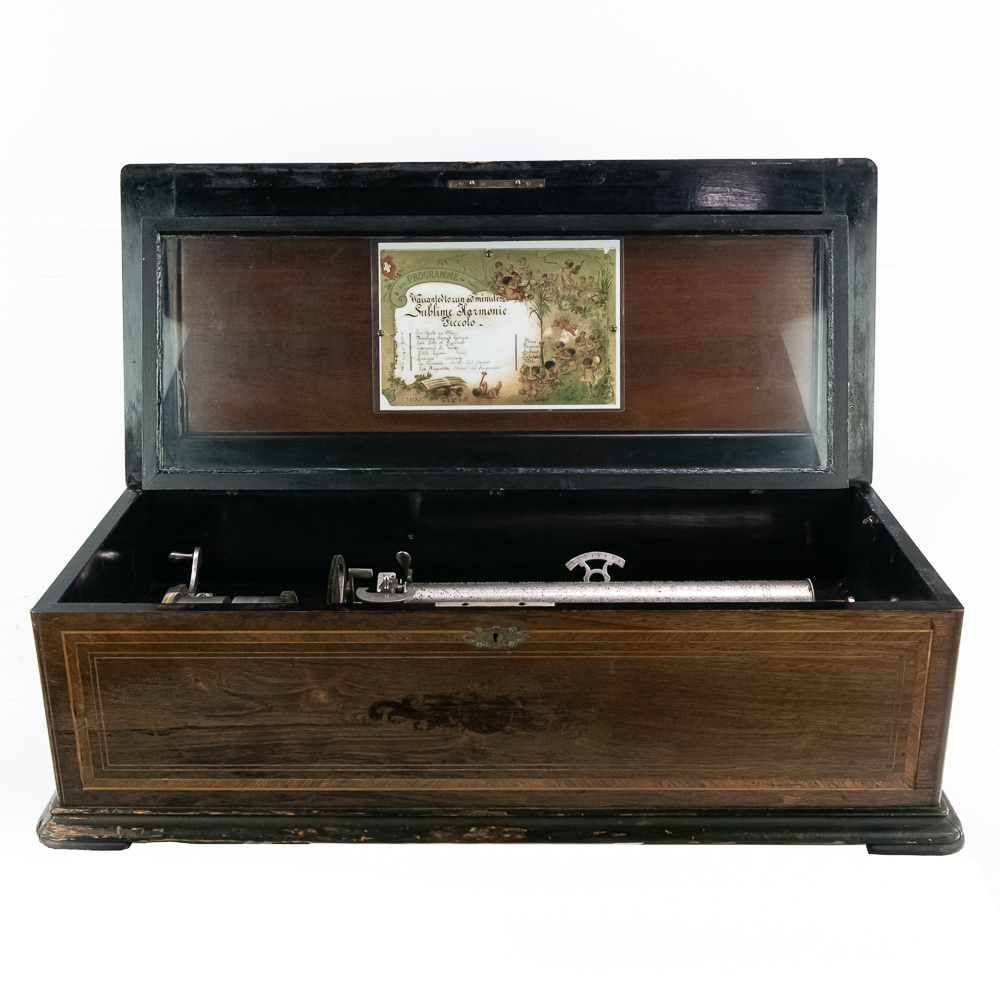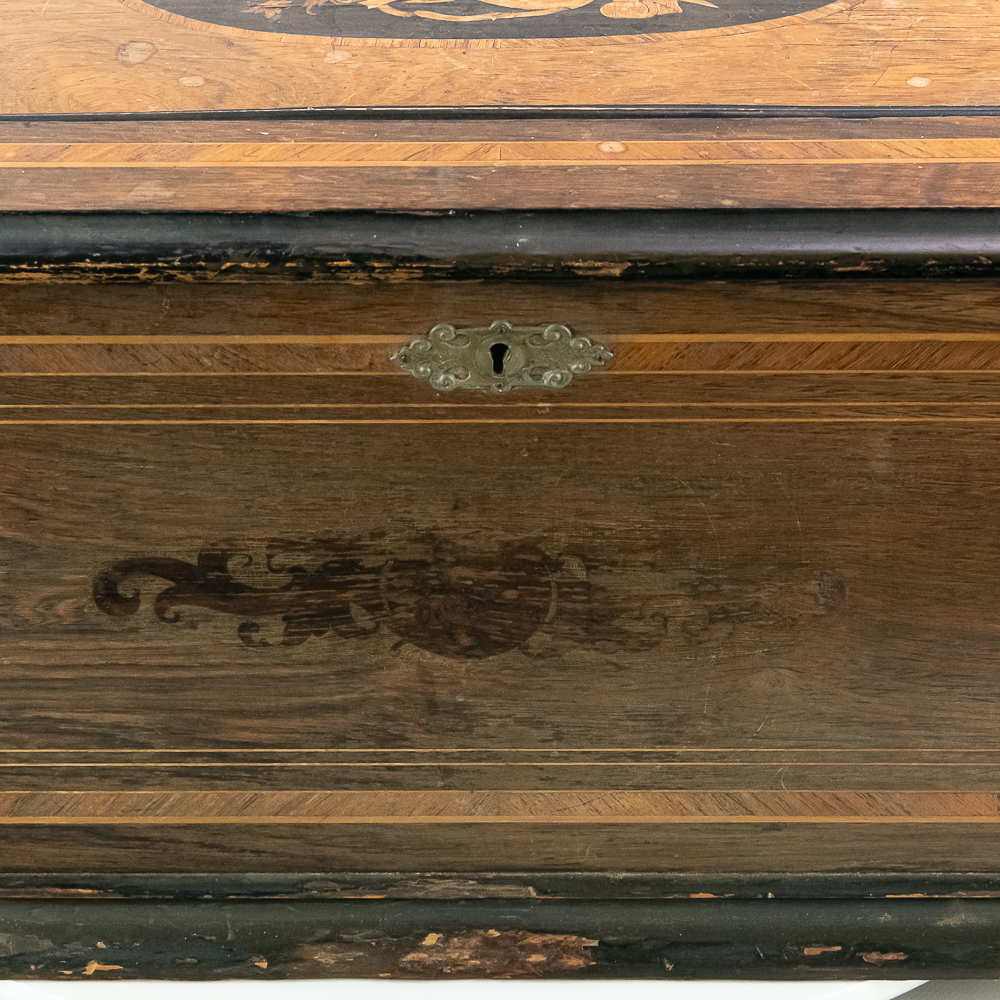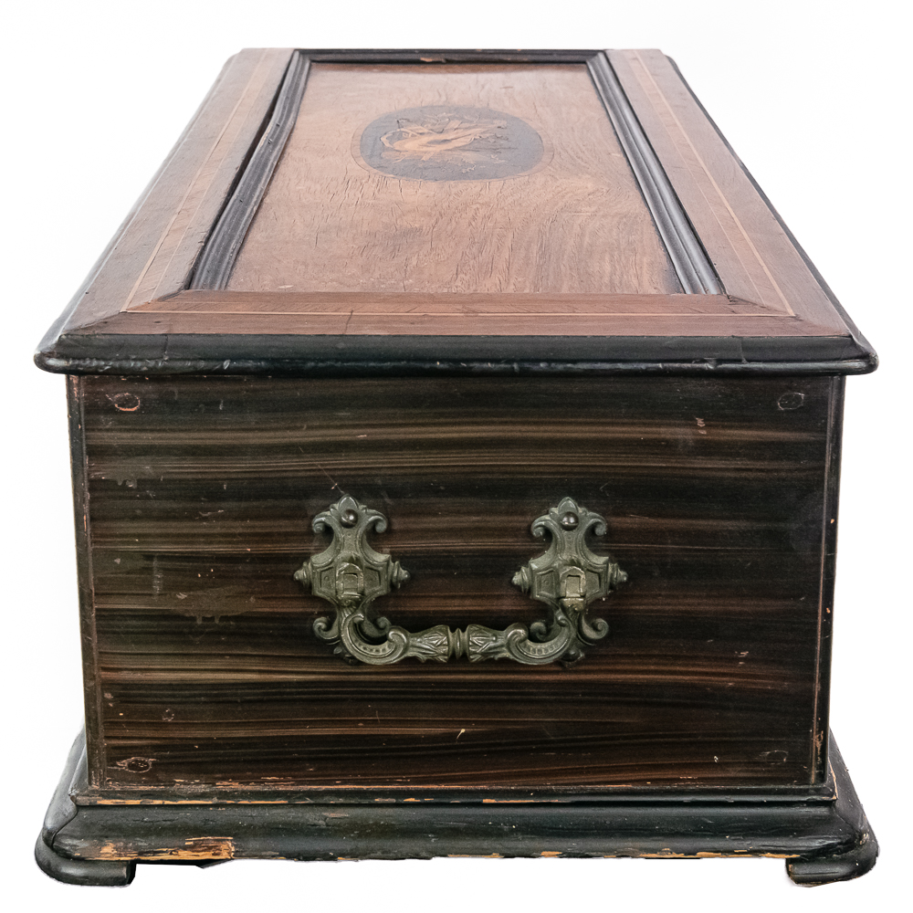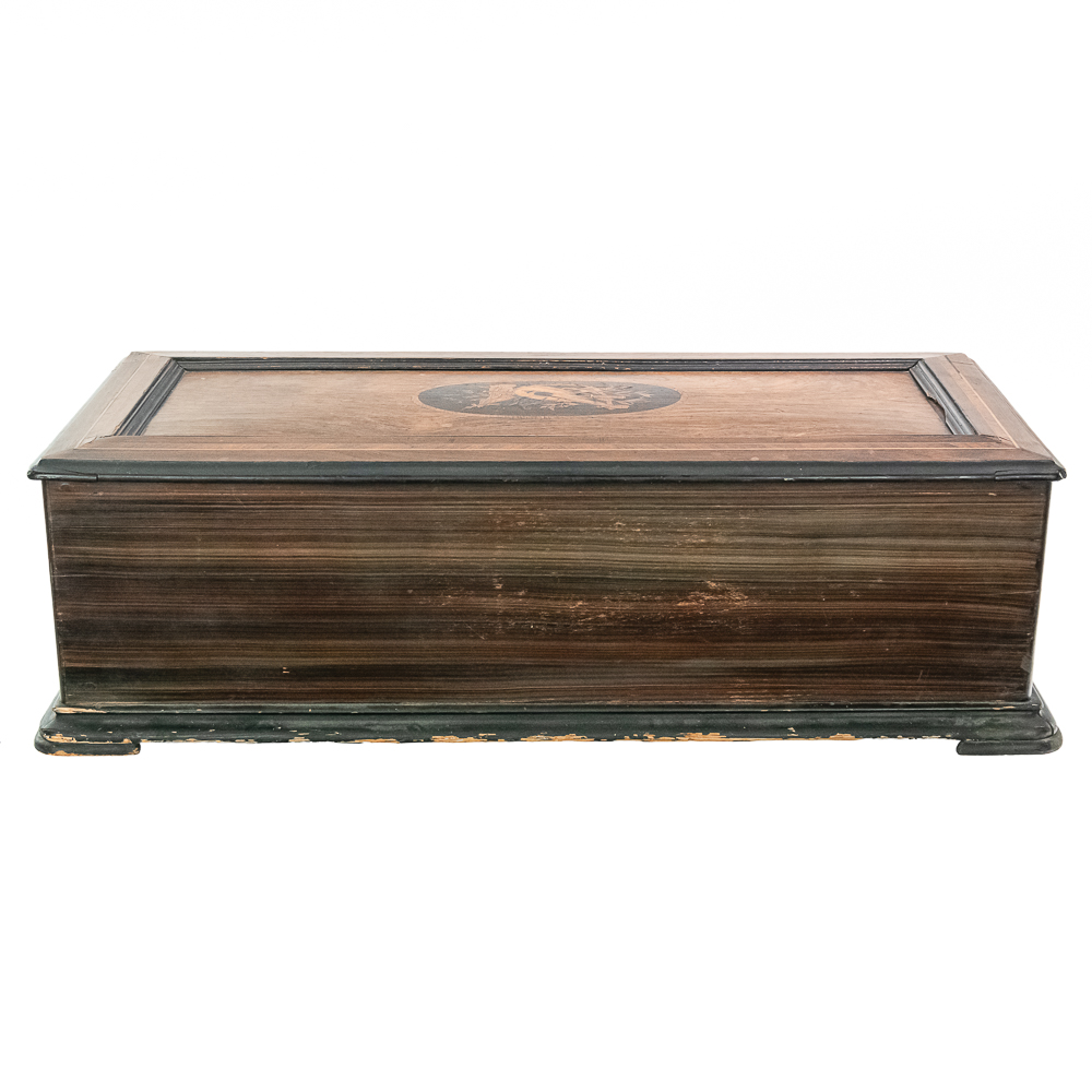 This large impressive cabinet featuring a crossbanded king wood and inlaid with satin wood stringing line and with Ebonized trim. The lid finely inlaid with a musical trophy in varicolored fruitwood within an oval. There is some loose and damaged trim on the top cover as well as nicks, scrapes and dents and some finish loss mainly at the base of the cabinet. See photos. It has 2 large decorative carrying handles. Inside the top cover is a copy of the original tune card. The original tune card is present and has been laminated for safe keeping. The glass dust cover appears to be a replacement. The lever wound two spring mechanism features a 17-1/2″ L cylinder approximately 2-1/2″ diameter. The mechanism has its original nickel plating is a bit dirty in average condition. Combs are a bit dirty with minor surface rust with one visible broken comb tip. The mechanism winds and runs but is a bit temperamental when starting and stopping and is in need of some adjustment. The tune indicator is missing its pointer hand.. The mechanism also has a zither attachment which is missing its pad and has been moved out of the way and no longer functional.