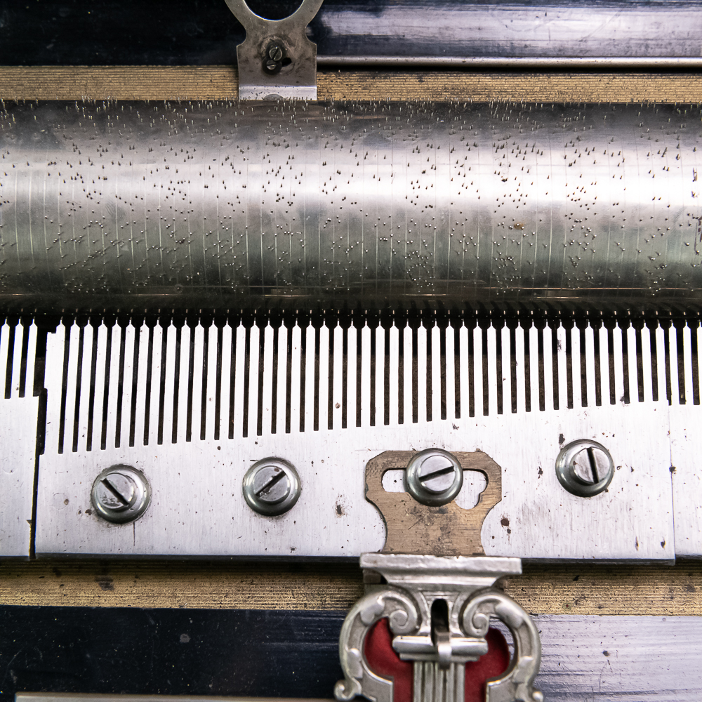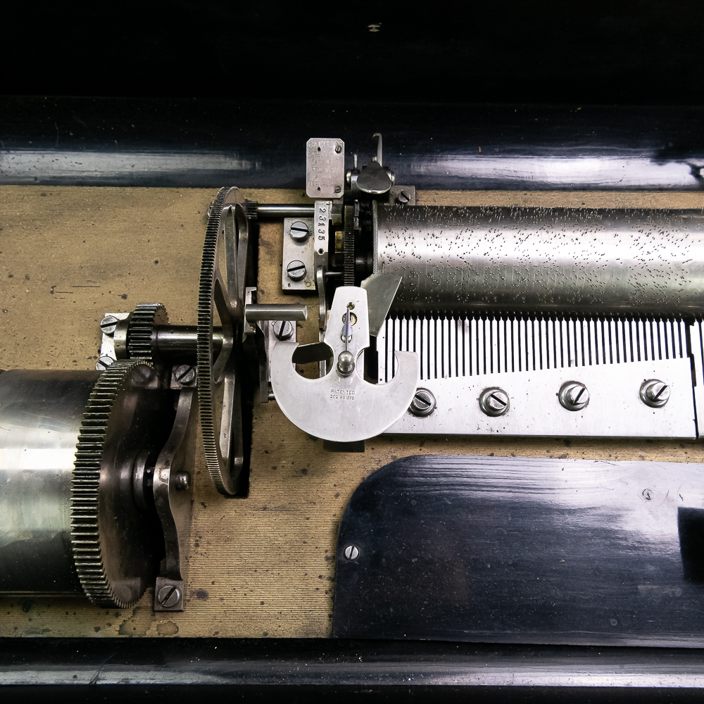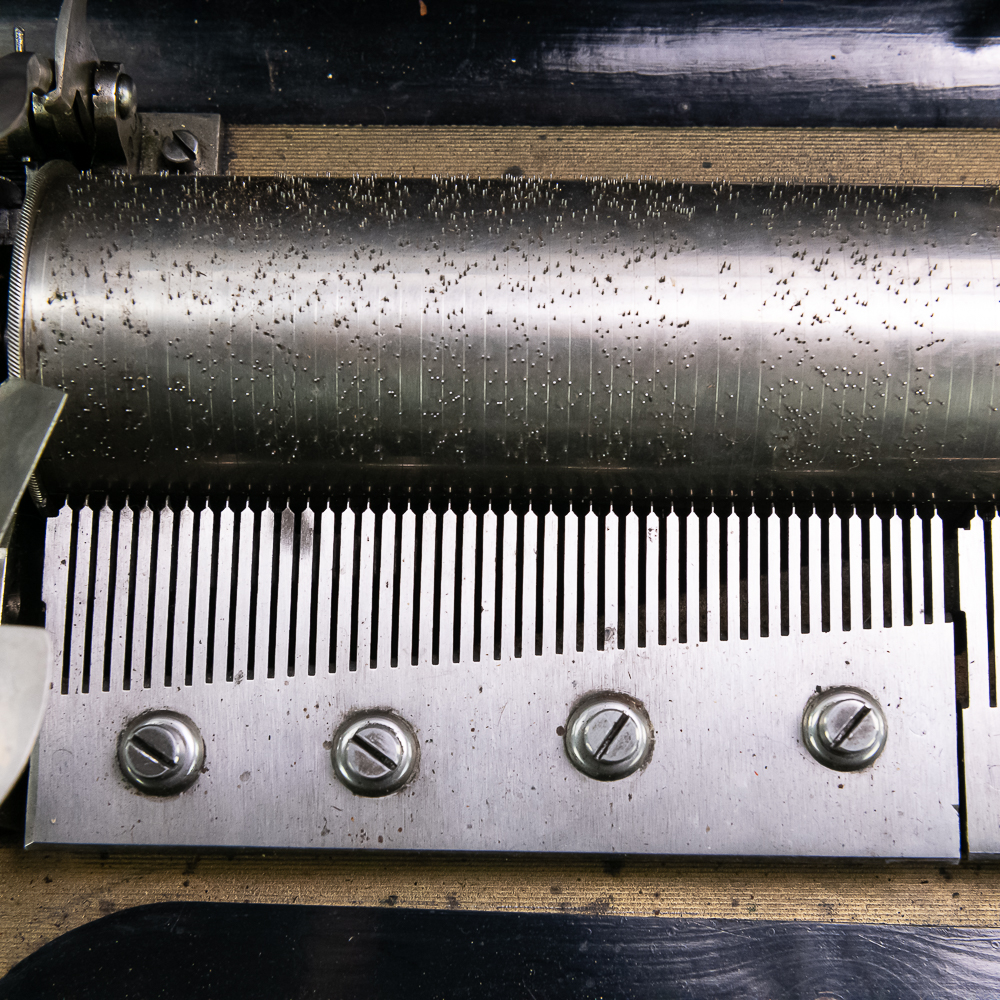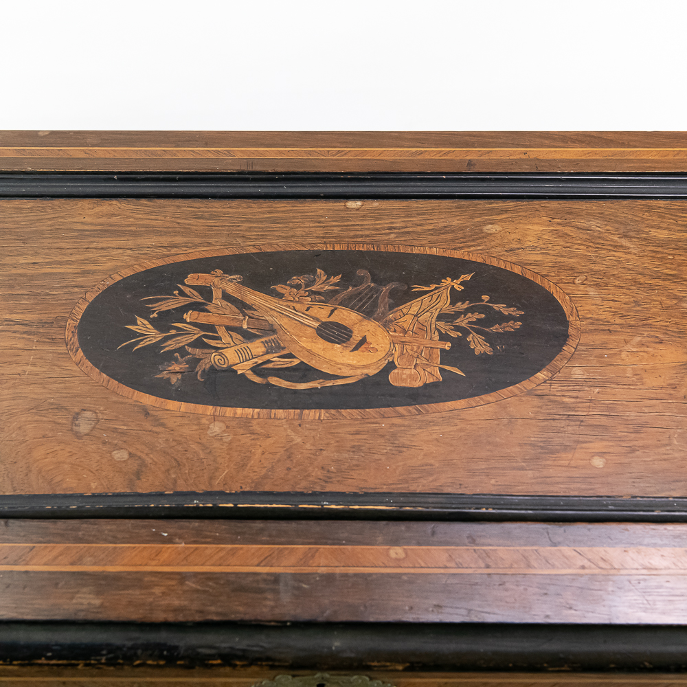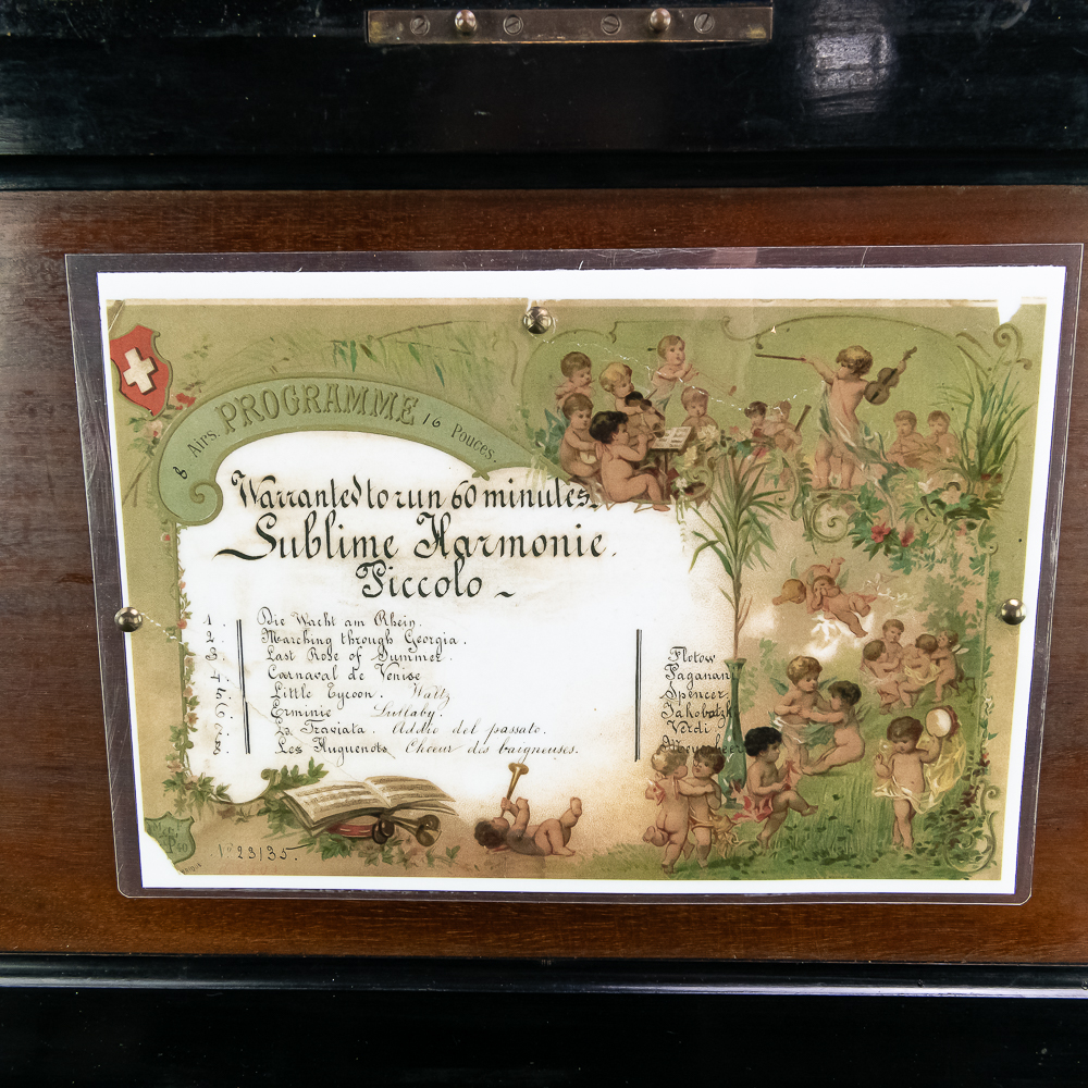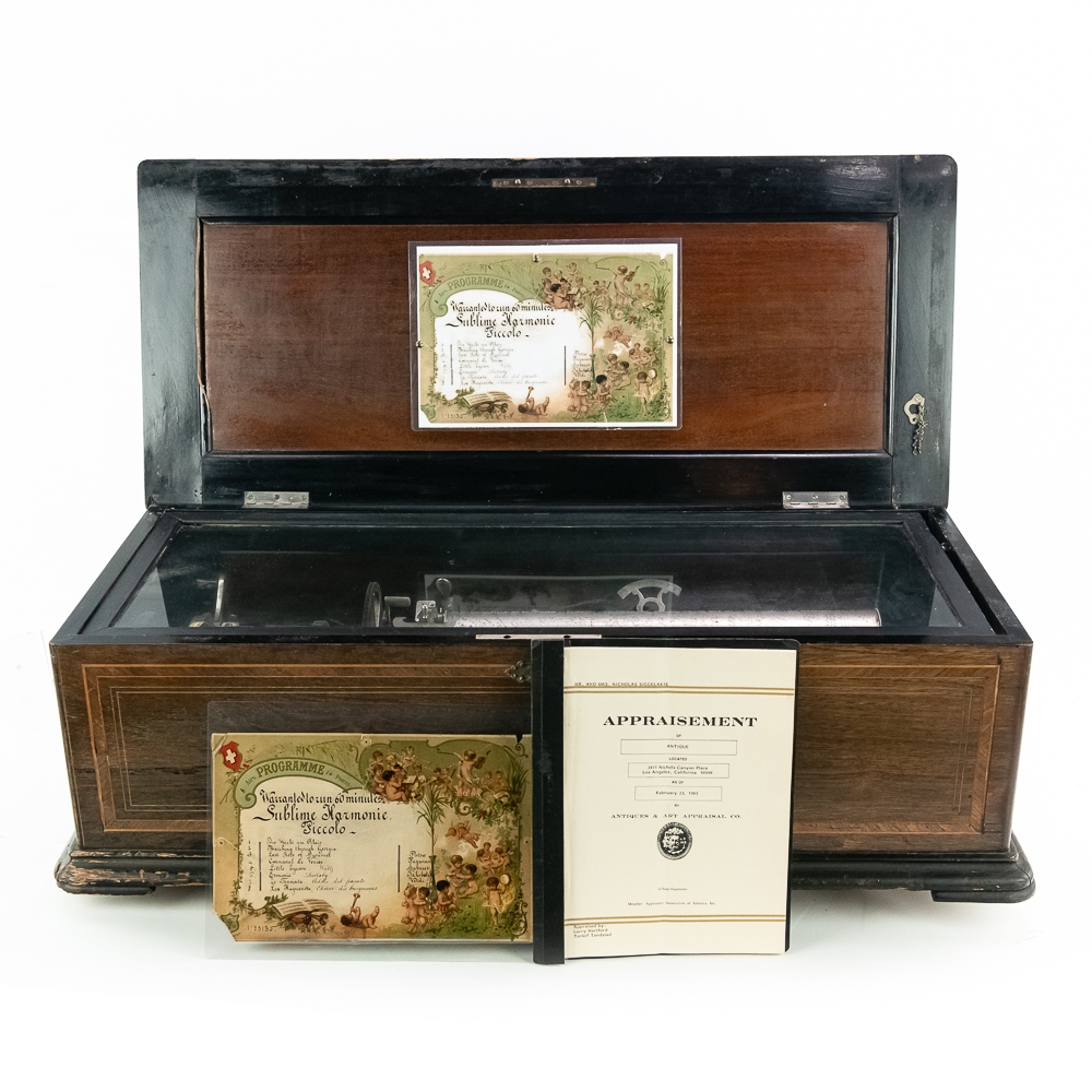This large impressive cabinet featuring a crossbanded king wood and inlaid with satin wood stringing line and with Ebonized trim. The lid finely inlaid with a musical trophy in varicolored fruitwood within an oval. There is some loose and damaged trim on the top cover as well as nicks, scrapes and dents and some finish loss mainly at the base of the cabinet. See photos. It has 2 large decorative carrying handles. Inside the top cover is a copy of the original tune card. The original tune card is present and has been laminated for safe keeping. The glass dust cover appears to be a replacement. The lever wound two spring mechanism features a 17-1/2″ L cylinder approximately 2-1/2″ diameter. The mechanism has its original nickel plating is a bit dirty in average condition. Combs are a bit dirty with minor surface rust with one visible broken comb tip. The mechanism winds and runs but is a bit temperamental when starting and stopping and is in need of some adjustment. The tune indicator is missing its pointer hand.. The mechanism also has a zither attachment which is missing its pad and has been moved out of the way and no longer functional.