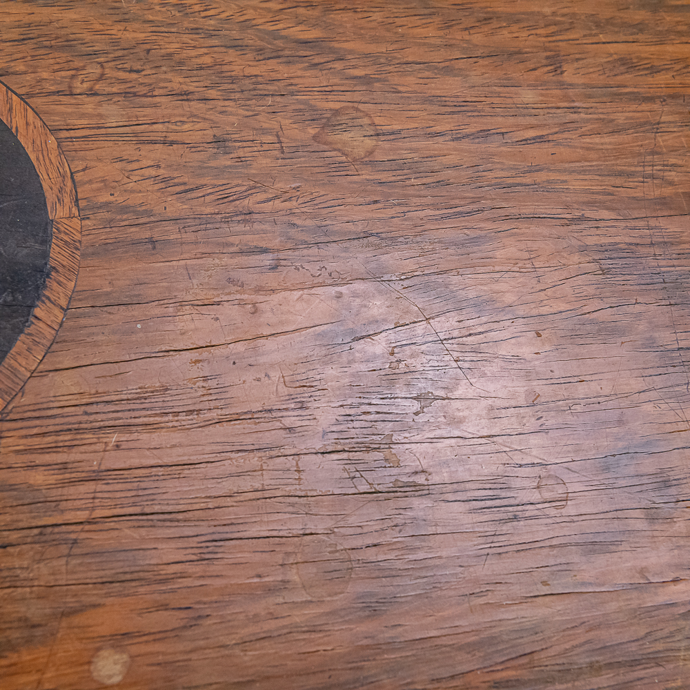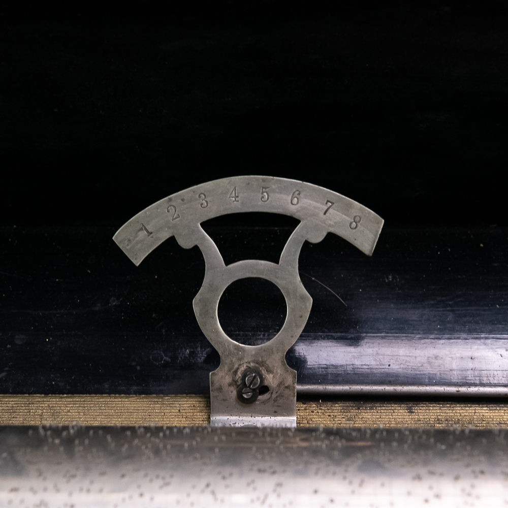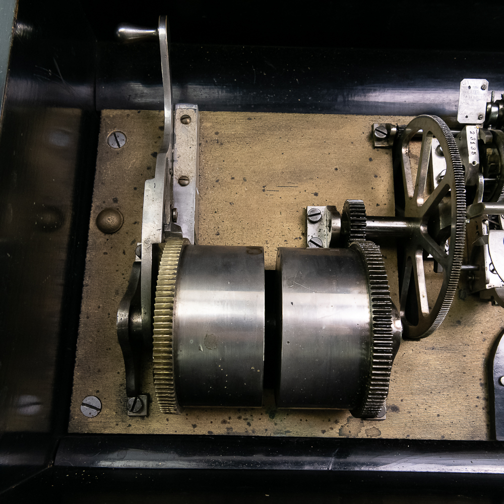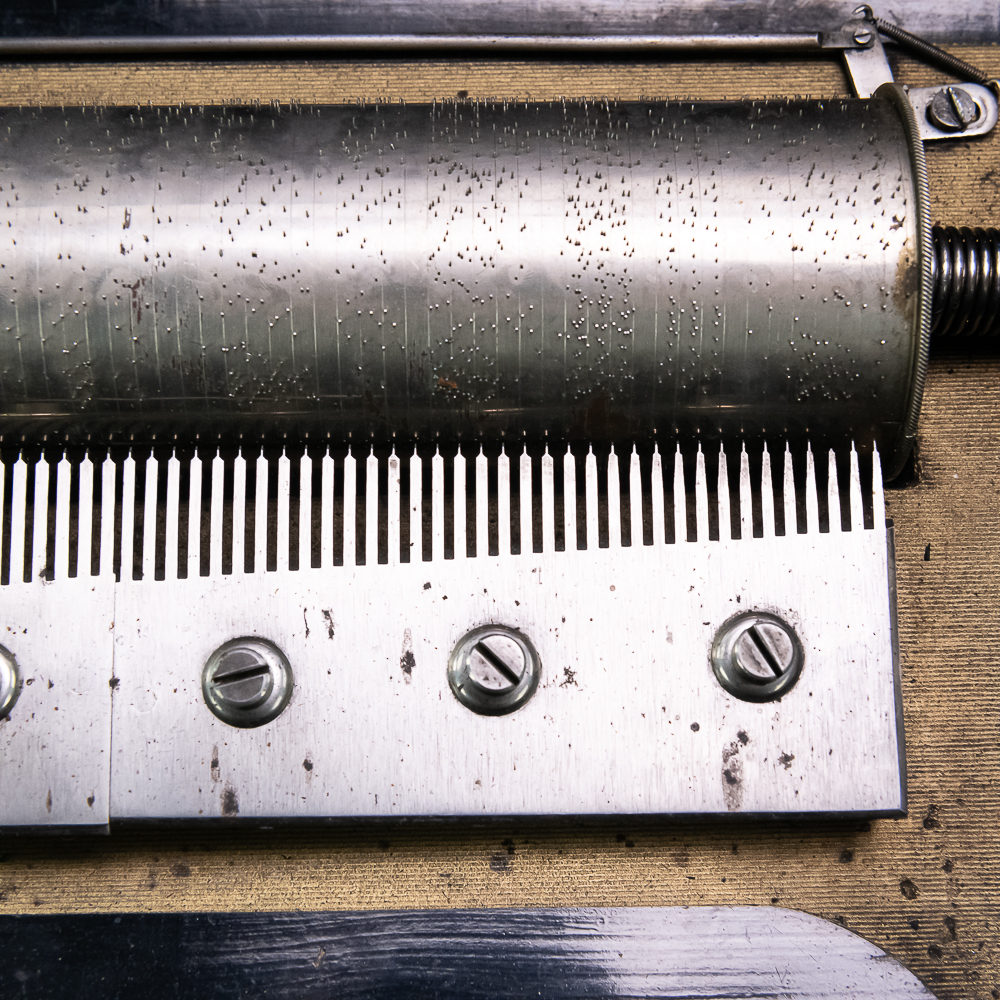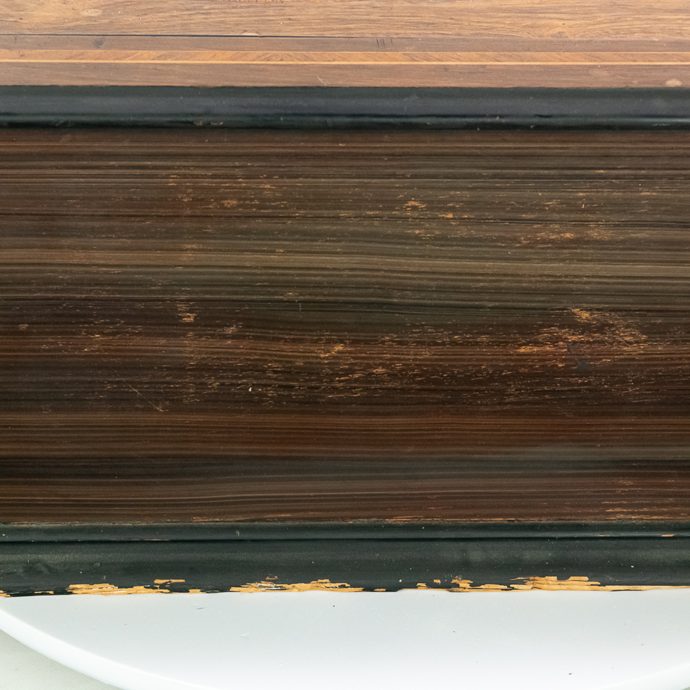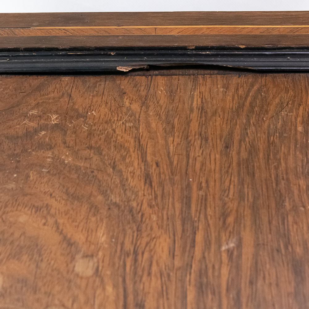 This large impressive cabinet featuring a crossbanded king wood and inlaid with satin wood stringing line and with Ebonized trim. The lid finely inlaid with a musical trophy in varicolored fruitwood within an oval. There is some loose and damaged trim on the top cover as well as nicks, scrapes and dents and some finish loss mainly at the base of the cabinet. See photos. It has 2 large decorative carrying handles. Inside the top cover is a copy of the original tune card. The original tune card is present and has been laminated for safe keeping. The glass dust cover appears to be a replacement. The lever wound two spring mechanism features a 17-1/2″ L cylinder approximately 2-1/2″ diameter. The mechanism has its original nickel plating is a bit dirty in average condition. Combs are a bit dirty with minor surface rust with one visible broken comb tip. The mechanism winds and runs but is a bit temperamental when starting and stopping and is in need of some adjustment. The tune indicator is missing its pointer hand.. The mechanism also has a zither attachment which is missing its pad and has been moved out of the way and no longer functional.