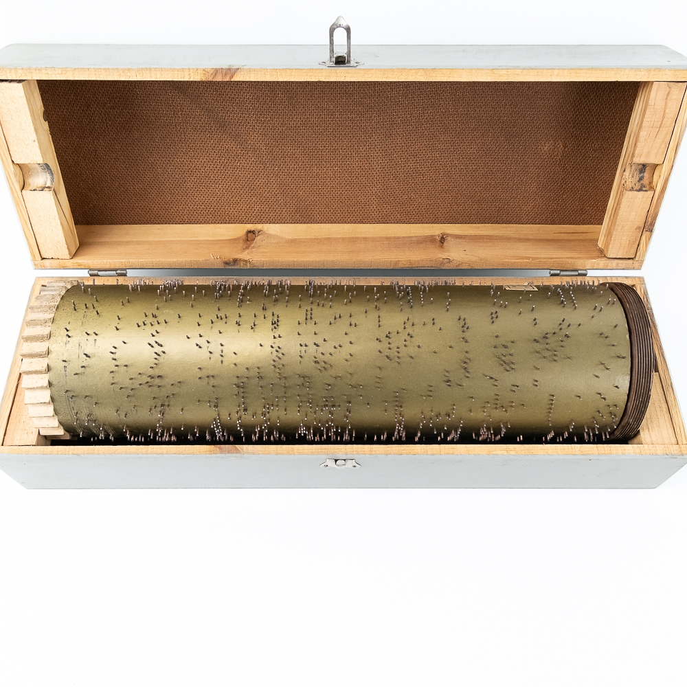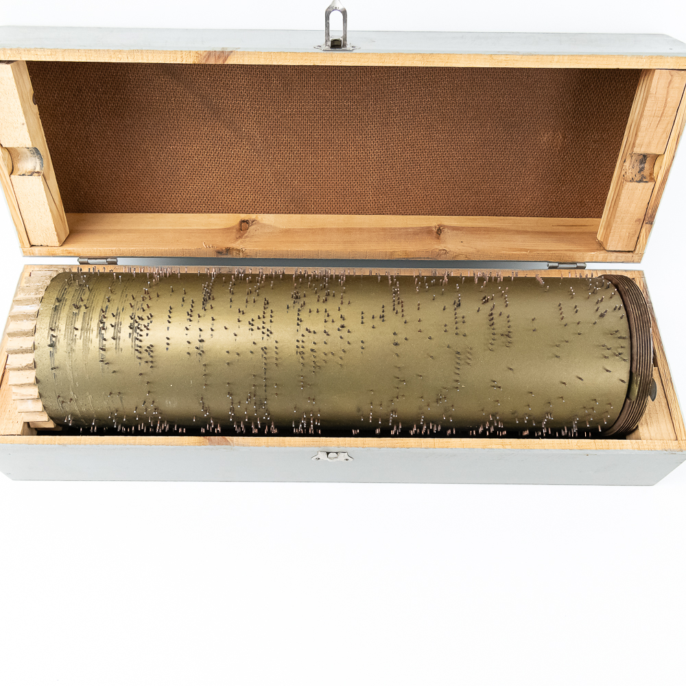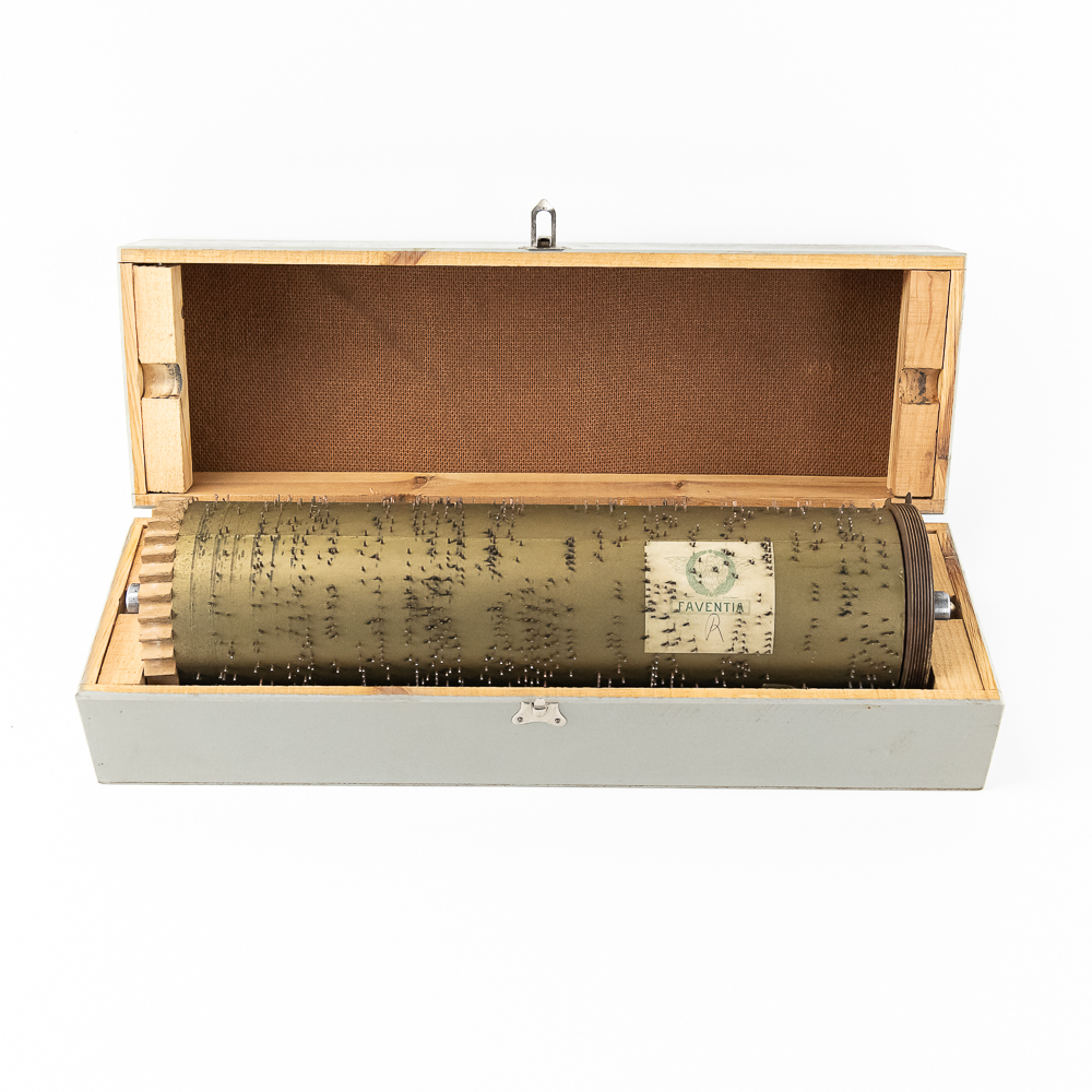 Hard to come by Faventia barrel organ roll for the Vincente Llinares “hurdy gurdy” children’s barrel organ. Showcased inside orange wood box and made in Spain. In very good overall condition, approximately 19.5″ long. Please use photos to judge condition and bid accordingly.