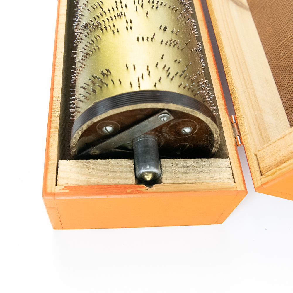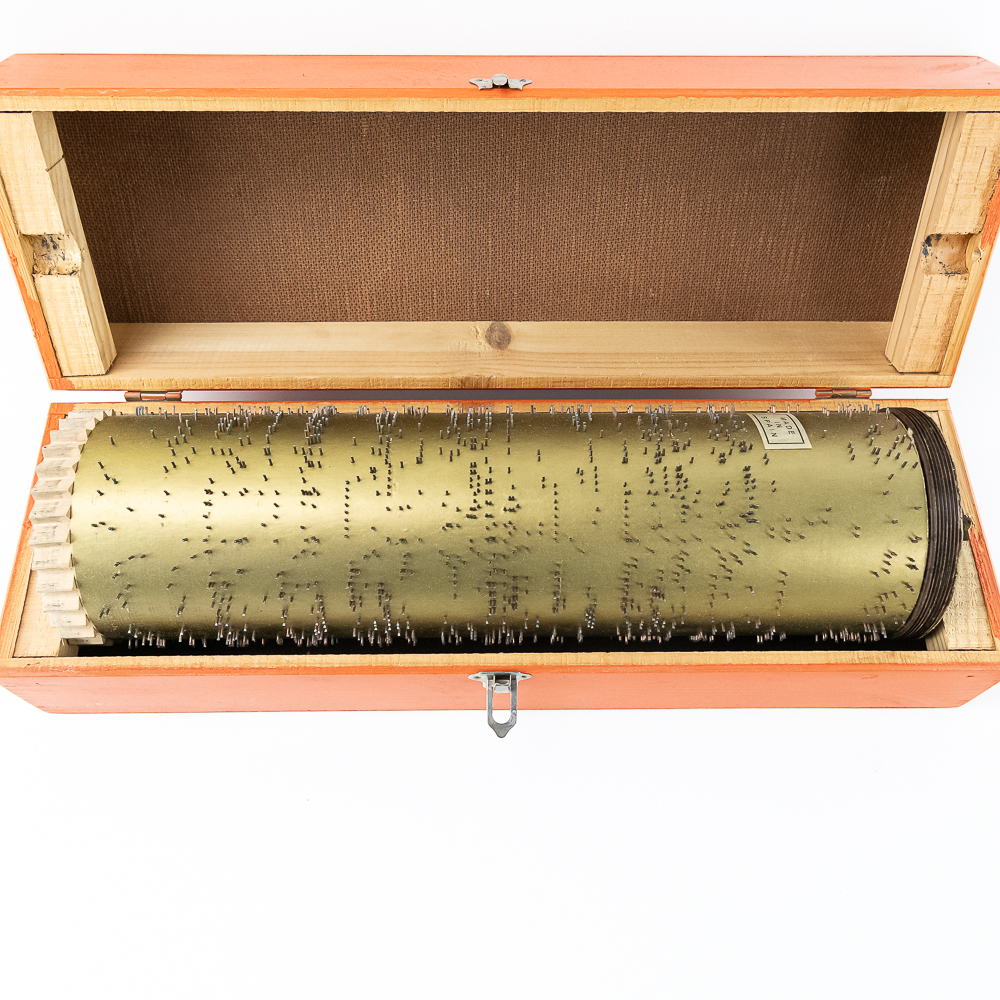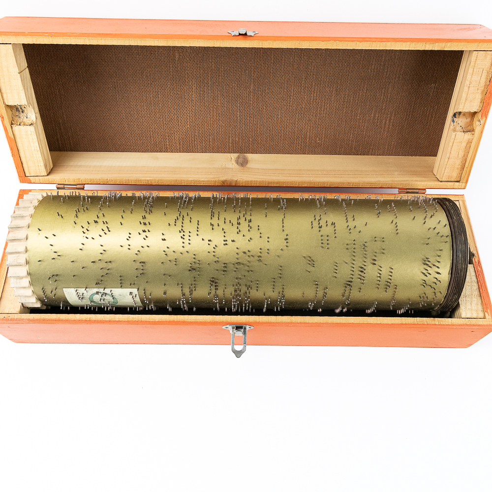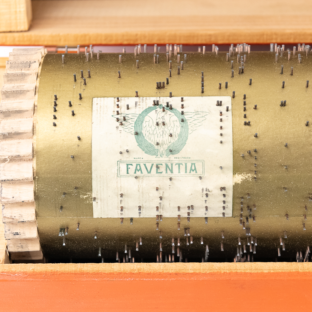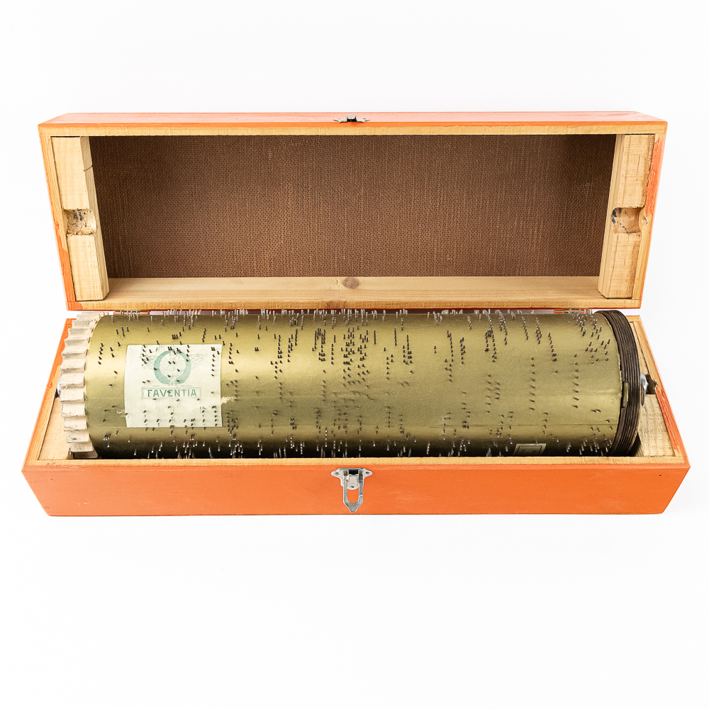 Hard to come by Faventia barrel organ roll for the Vincente Llinares children’s barrel organ. Showcased inside orange wood box and made in Spain. In very good overall condition, approximately 19.5″ long. Please use photos to judge condition and bid accordingly.