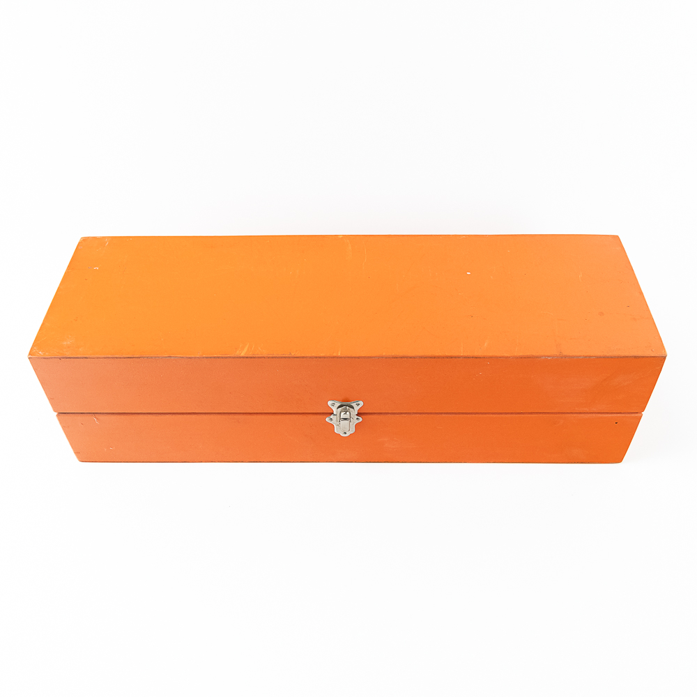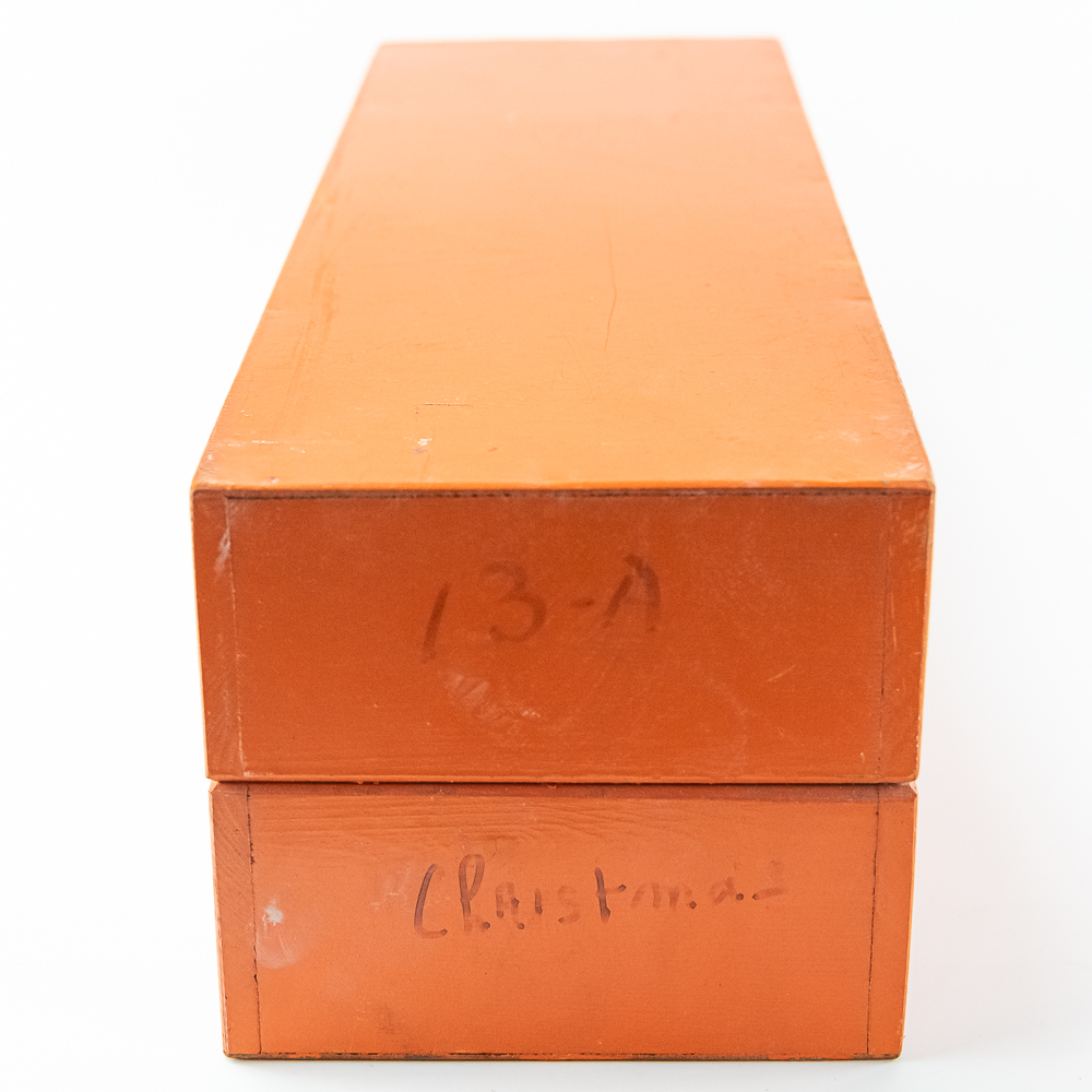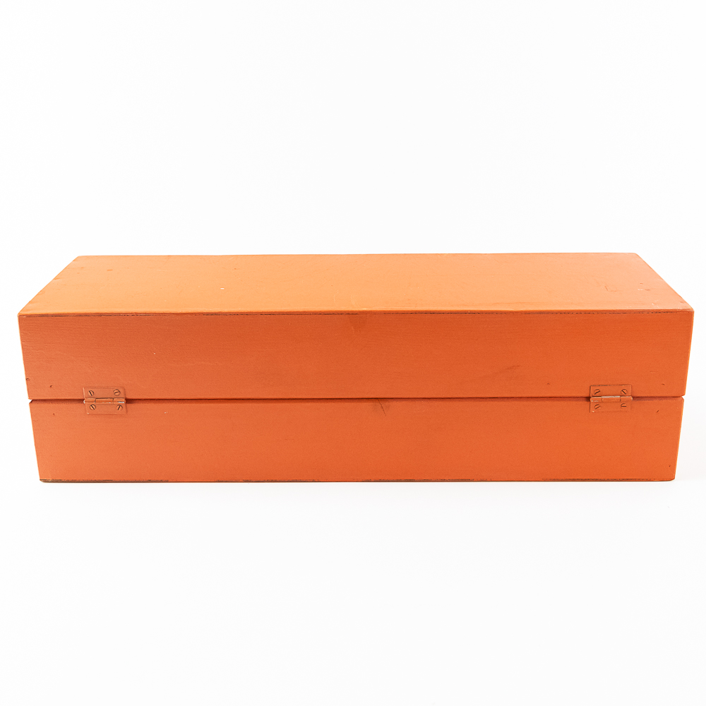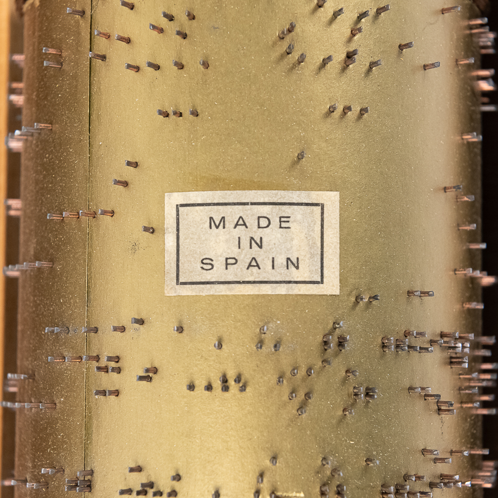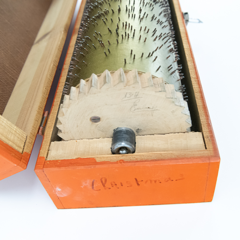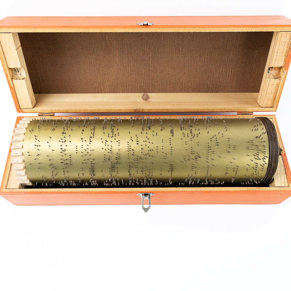 Hard to come by Faventia barrel organ roll for the Vincente Llinares children’s barrel organ. Showcased inside orange wood box and made in Spain. In very good overall condition, approximately 19.5″ long. Please use photos to judge condition and bid accordingly.