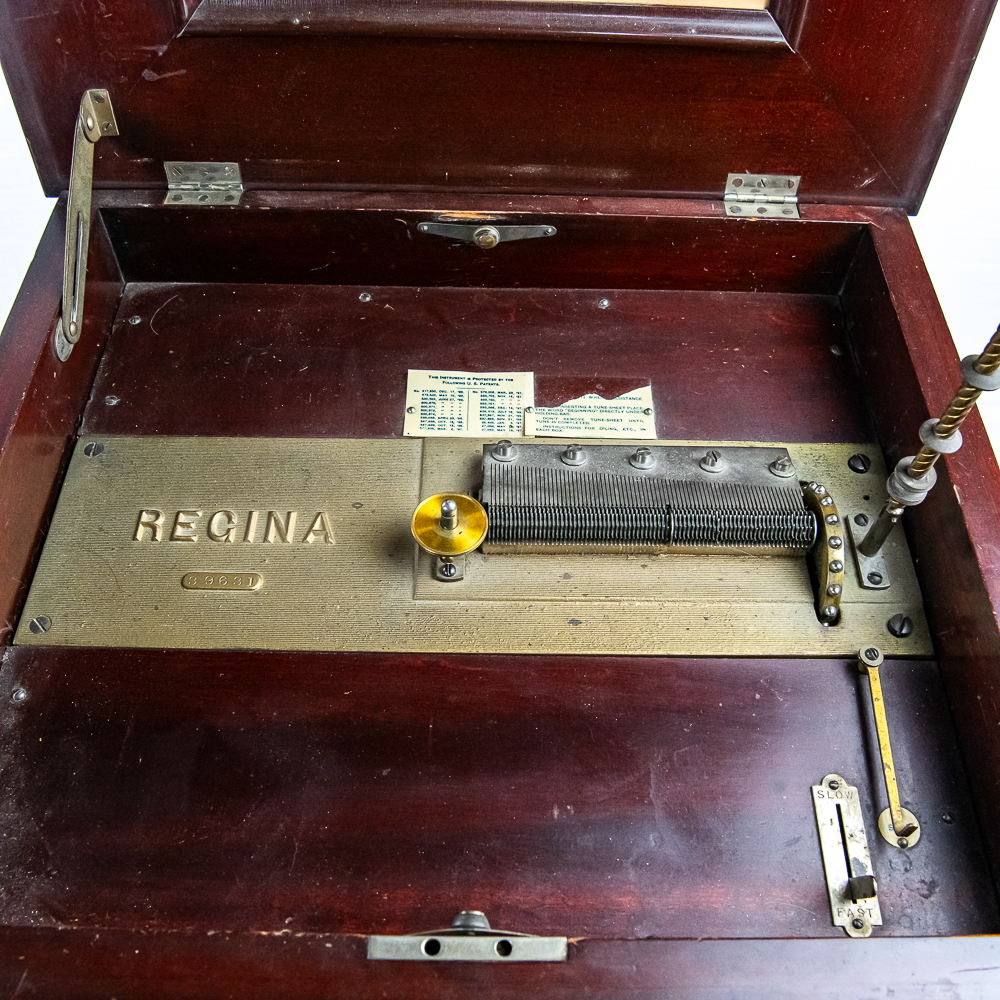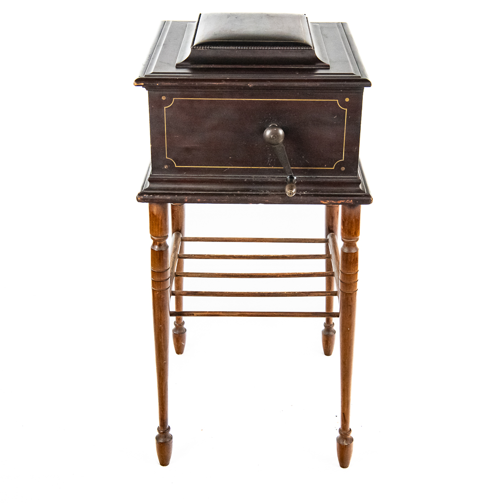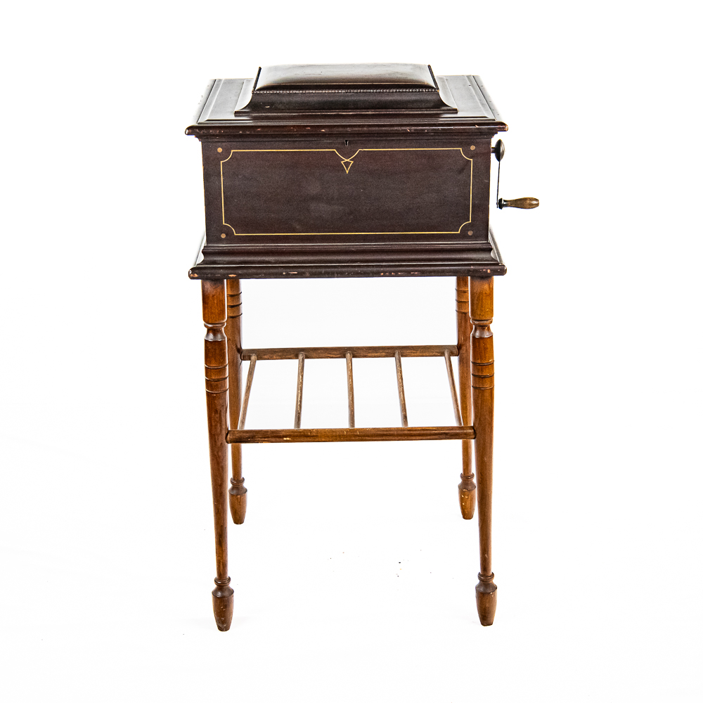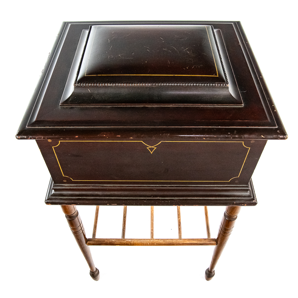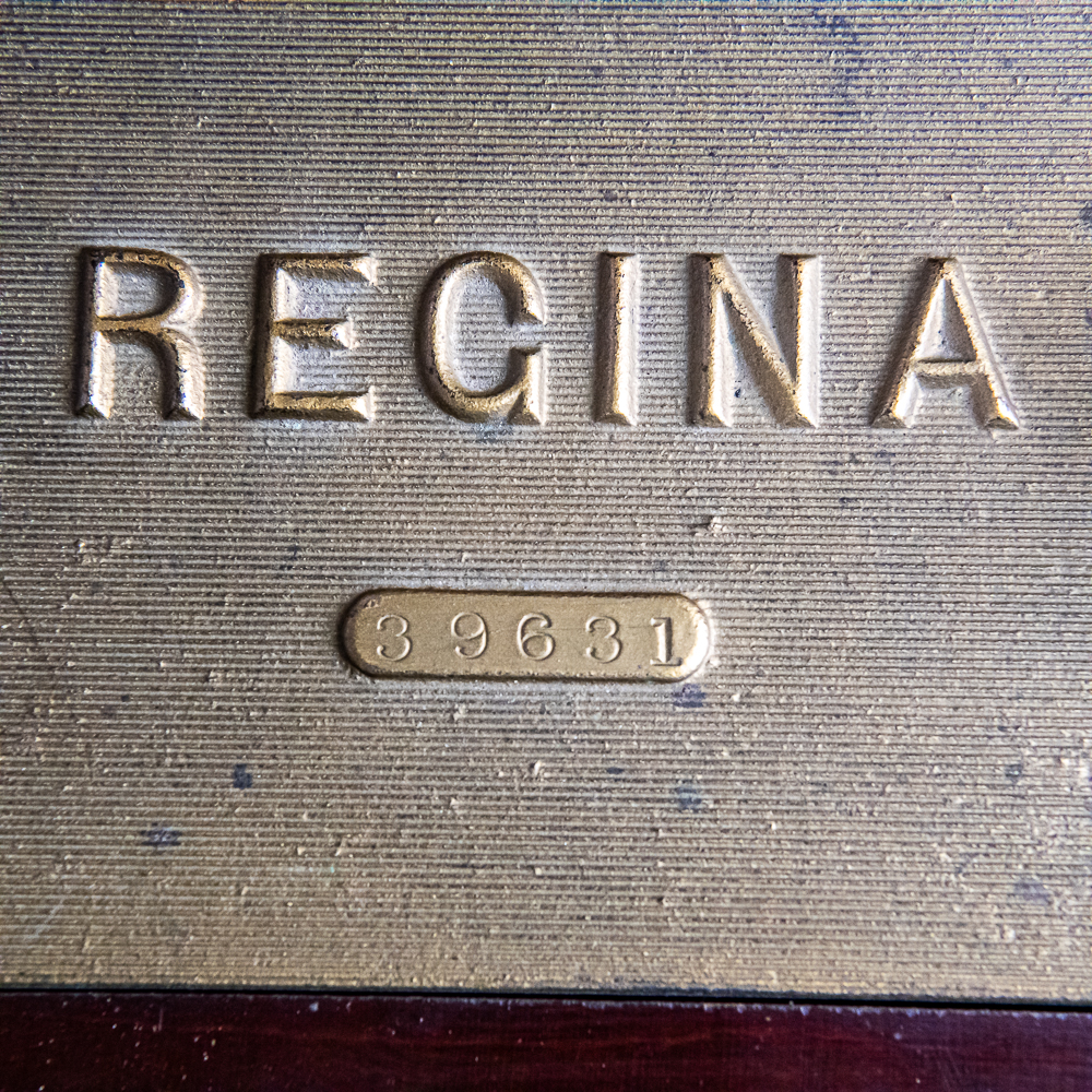 This machine in its mahogany cabinet has its original finish with scrapes and abrasions on all sides featuring gold pinstripes on three sides and the top cover. A portion of the decorative beading molding is missing on the top cover. Inside the top cover it has its original Regina paper insert featuring the Regina trademark and it is slightly discolored with some staining. The single comb long bed plate mechanism appears to be in average unrestored playing condition. The comb has no visible evidence of broken tips or teeth. Has two tiny rust spots. Has its original winding crank and the mechanism winds, runs, plays, starts and stops as it should. This could use to be lubricated. The music box has been married to and attached to an old end table some time ago. Music box measures 22″ W X 20″ D X 13″ T. with the add on legs it measures 40″ T.