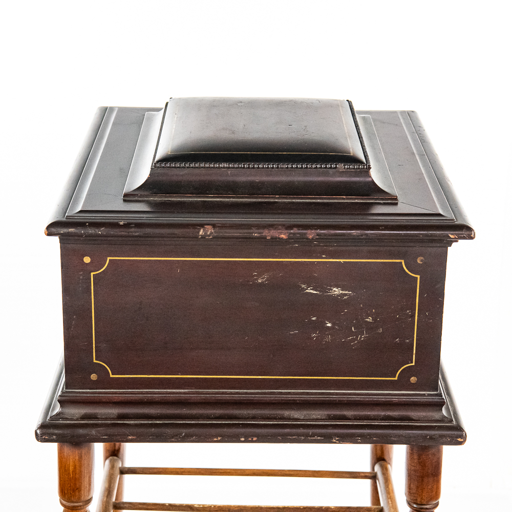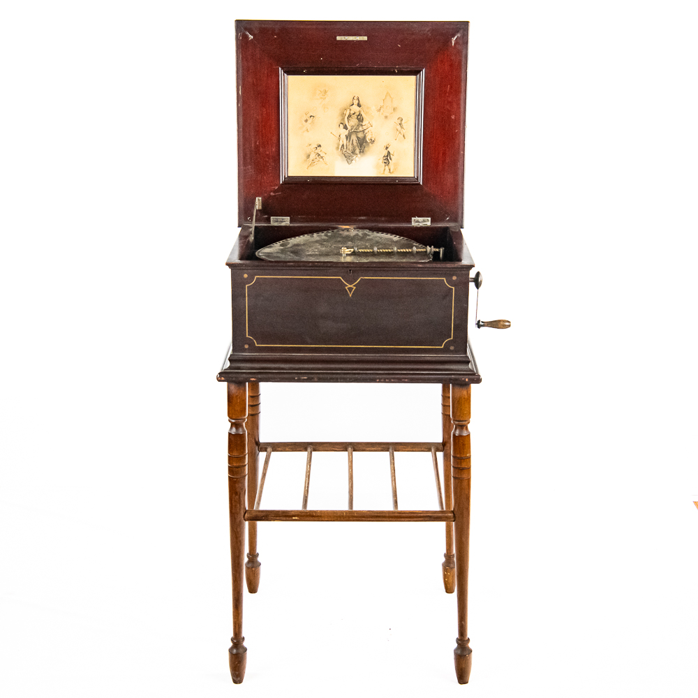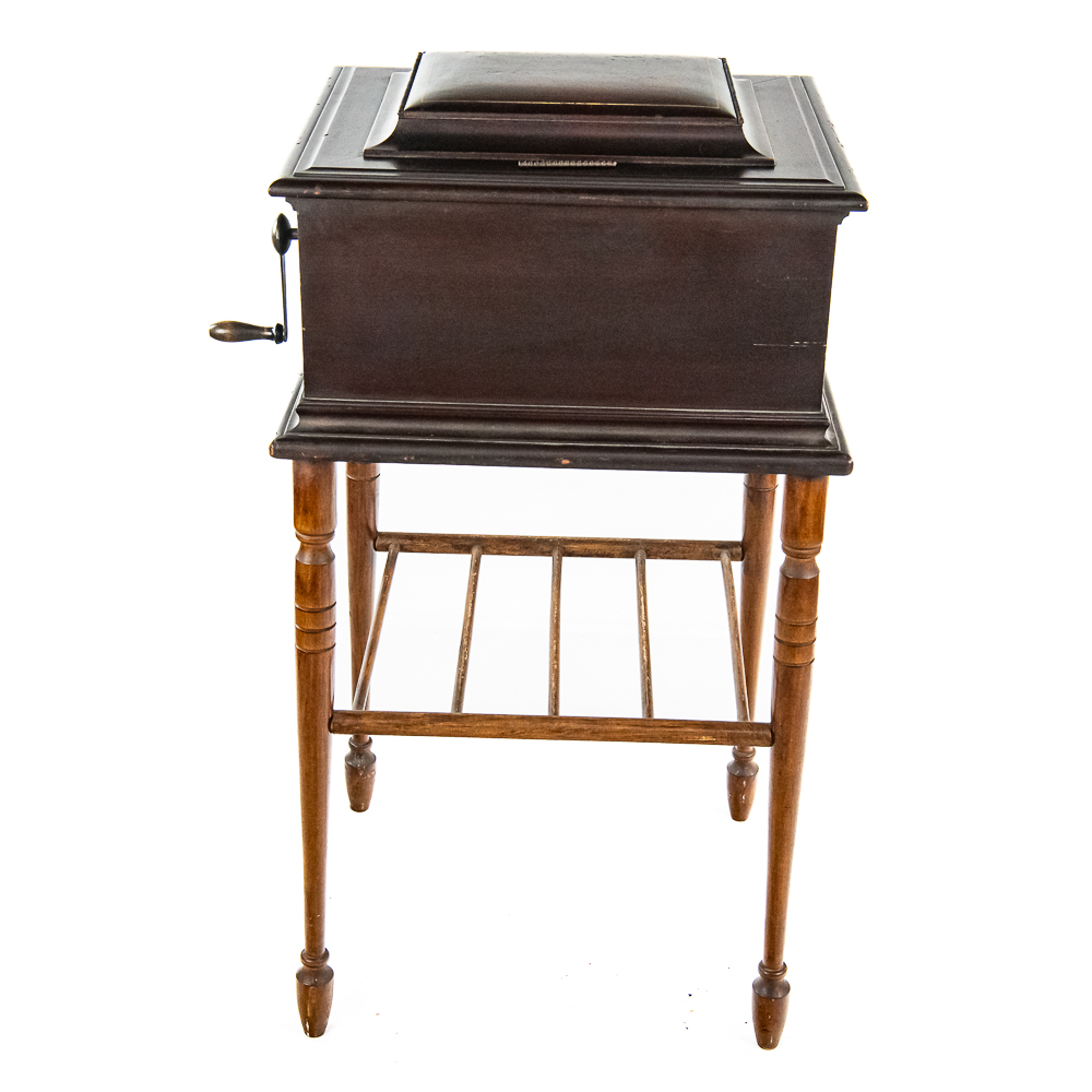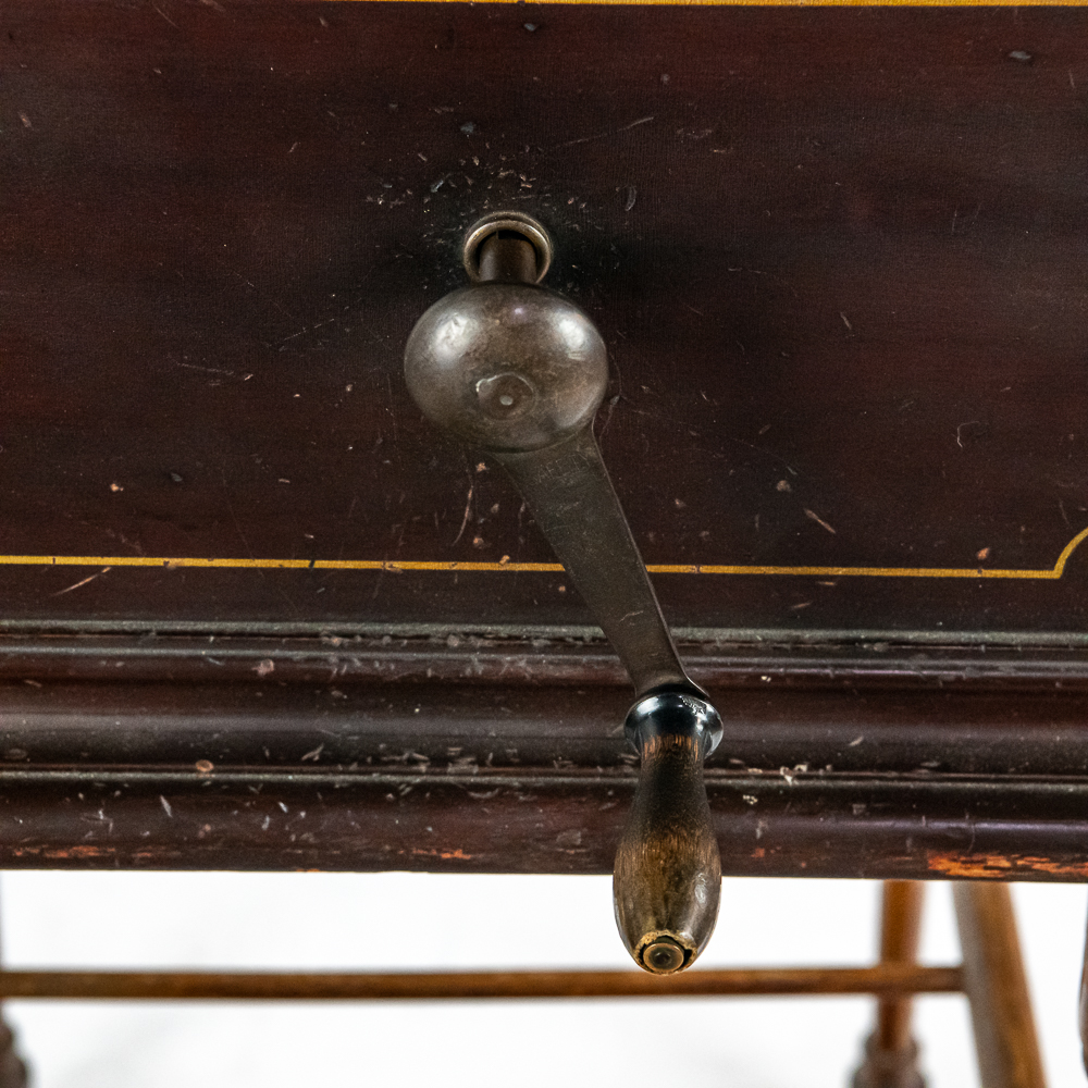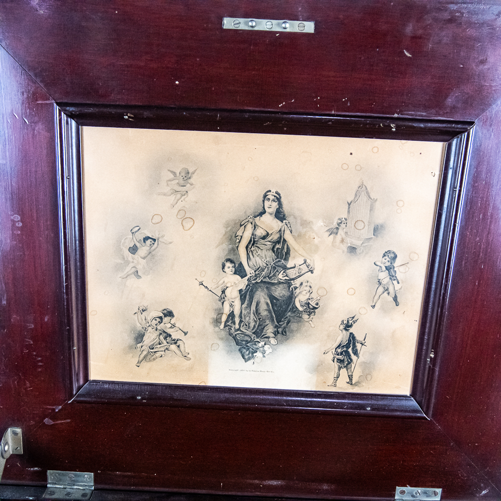 This machine in its mahogany cabinet has its original finish with scrapes and abrasions on all sides featuring gold pinstripes on three sides and the top cover. A portion of the decorative beading molding is missing on the top cover. Inside the top cover it has its original Regina paper insert featuring the Regina trademark and it is slightly discolored with some staining. The single comb long bed plate mechanism appears to be in average unrestored playing condition. The comb has no visible evidence of broken tips or teeth. Has two tiny rust spots. Has its original winding crank and the mechanism winds, runs, plays, starts and stops as it should. This could use to be lubricated. The music box has been married to and attached to an old end table some time ago. Music box measures 22″ W X 20″ D X 13″ T. with the add on legs it measures 40″ T.