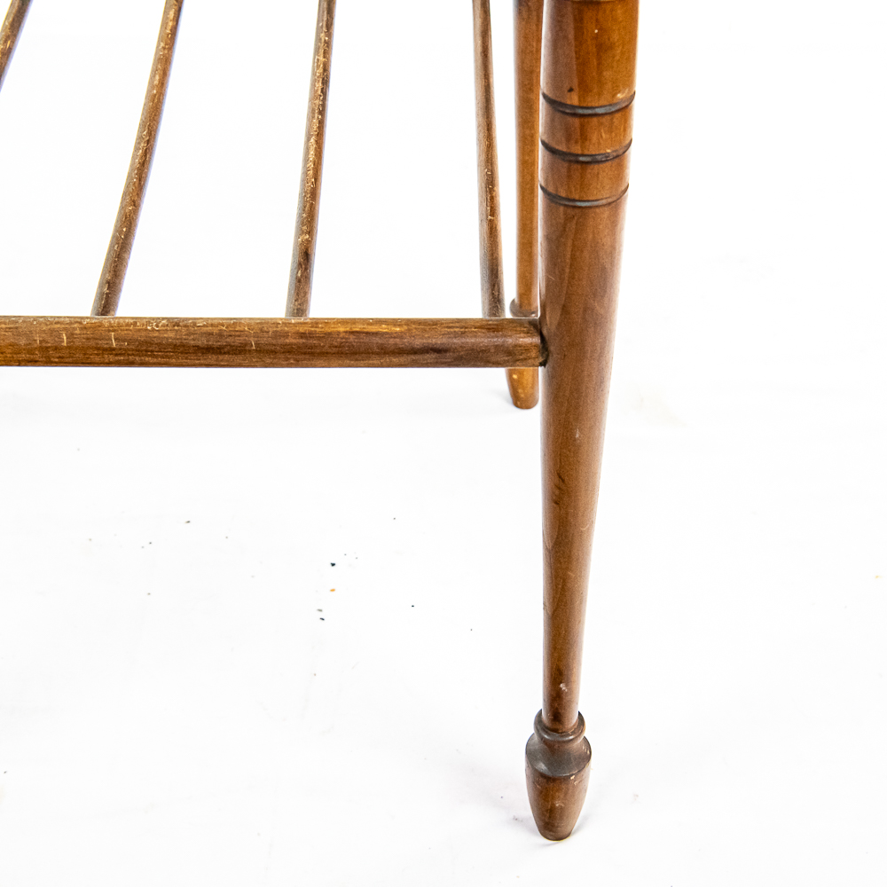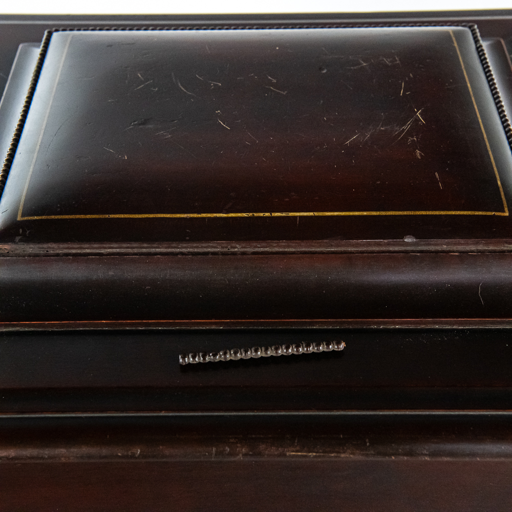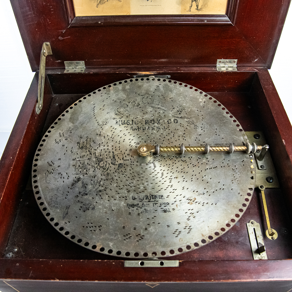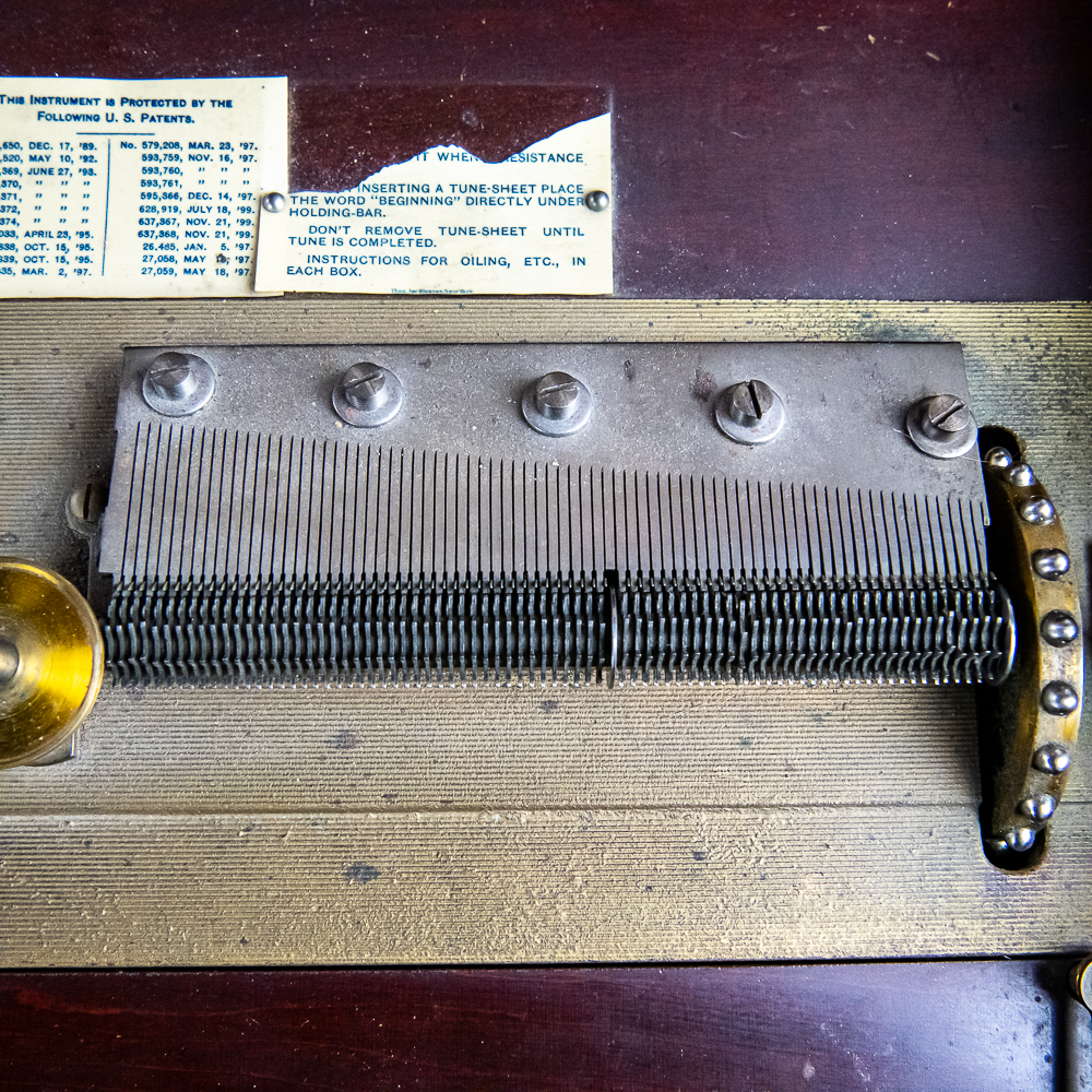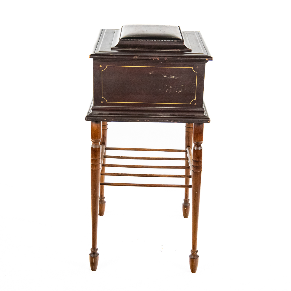 This machine in its mahogany cabinet has its original finish with scrapes and abrasions on all sides featuring gold pinstripes on three sides and the top cover. A portion of the decorative beading molding is missing on the top cover. Inside the top cover it has its original Regina paper insert featuring the Regina trademark and it is slightly discolored with some staining. The single comb long bed plate mechanism appears to be in average unrestored playing condition. The comb has no visible evidence of broken tips or teeth. Has two tiny rust spots. Has its original winding crank and the mechanism winds, runs, plays, starts and stops as it should. This could use to be lubricated. The music box has been married to and attached to an old end table some time ago. Music box measures 22″ W X 20″ D X 13″ T. with the add on legs it measures 40″ T.