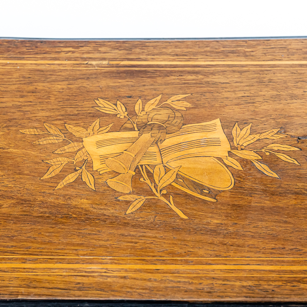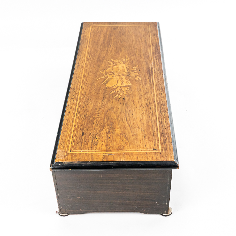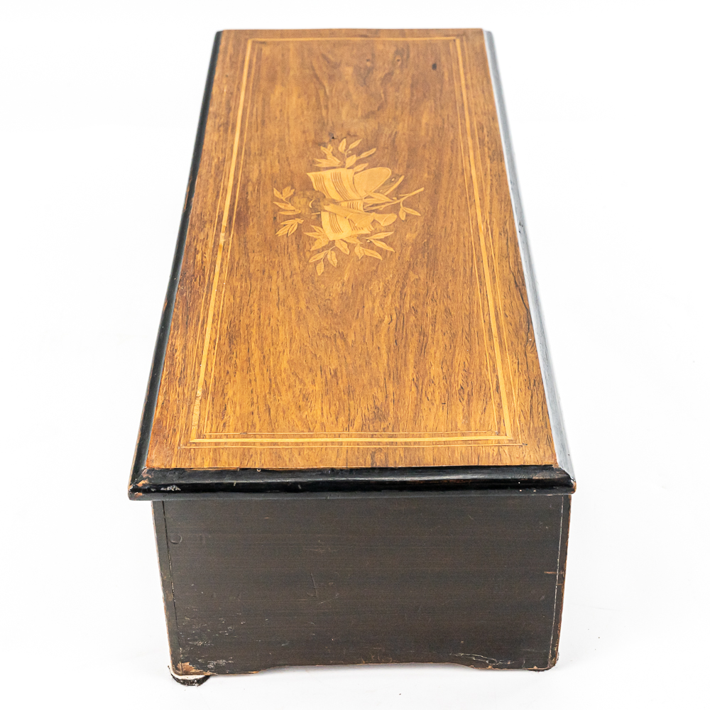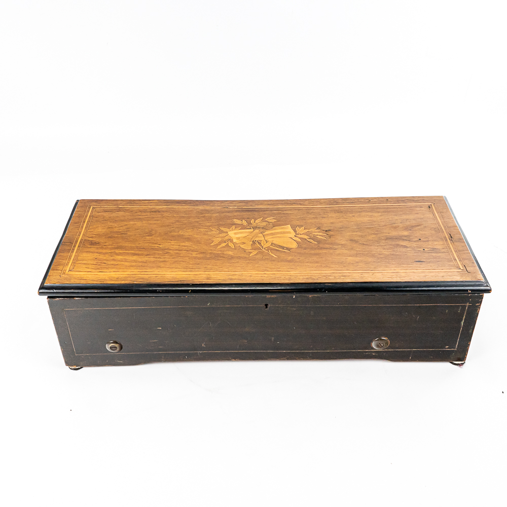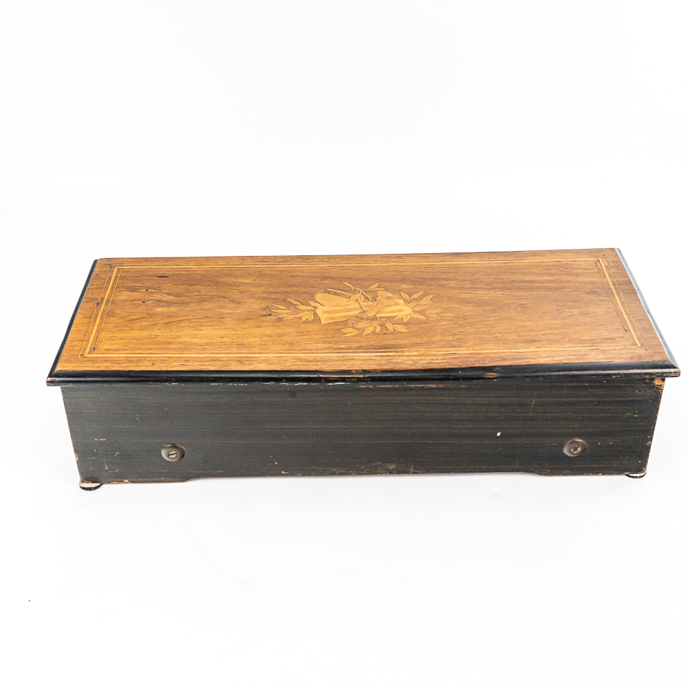 Plays multi tunes in inlaid case. Winds and plays. Has multiple chipped and broken teeth on comb. Missing tune card. Lid has been refinished. No key for lid. Measures 22.75″ wide, 8.5″ deep, 5.75″ tall.