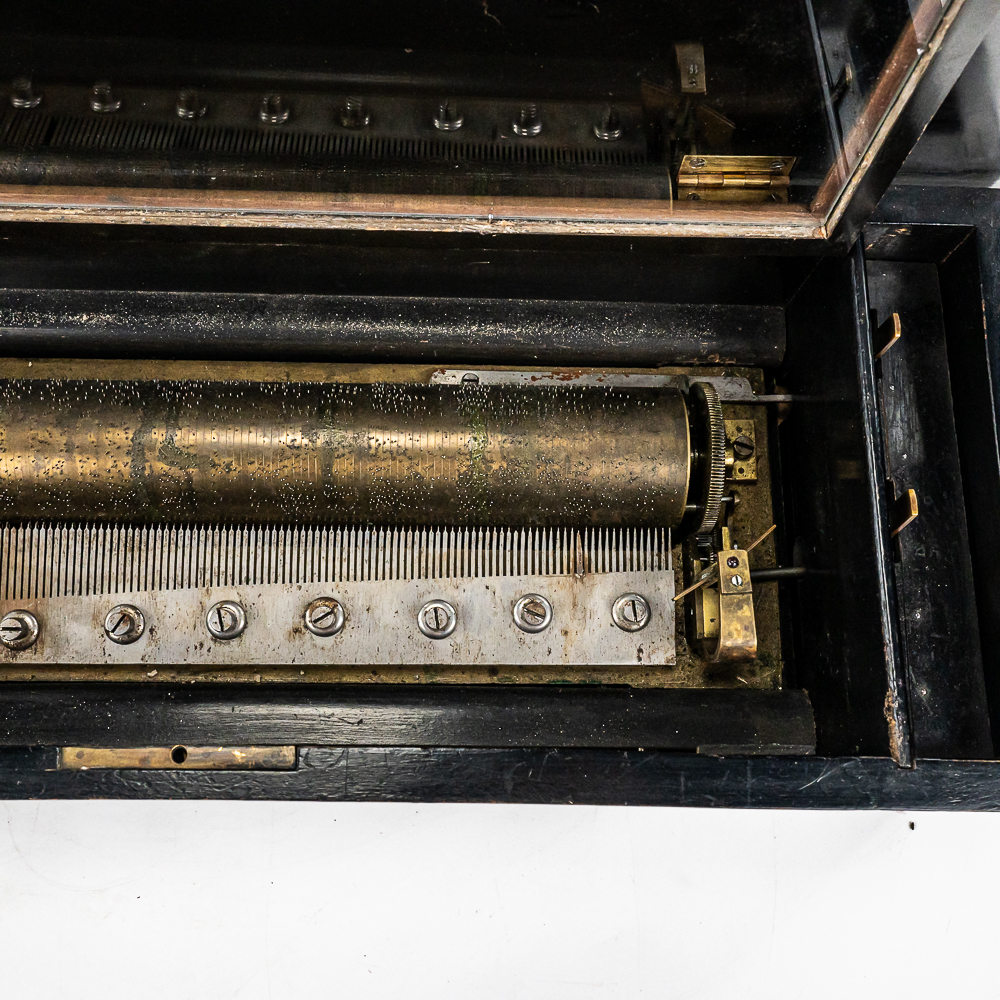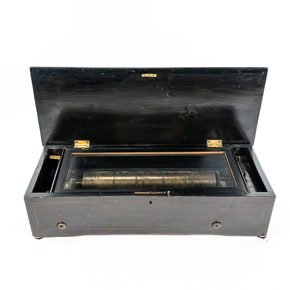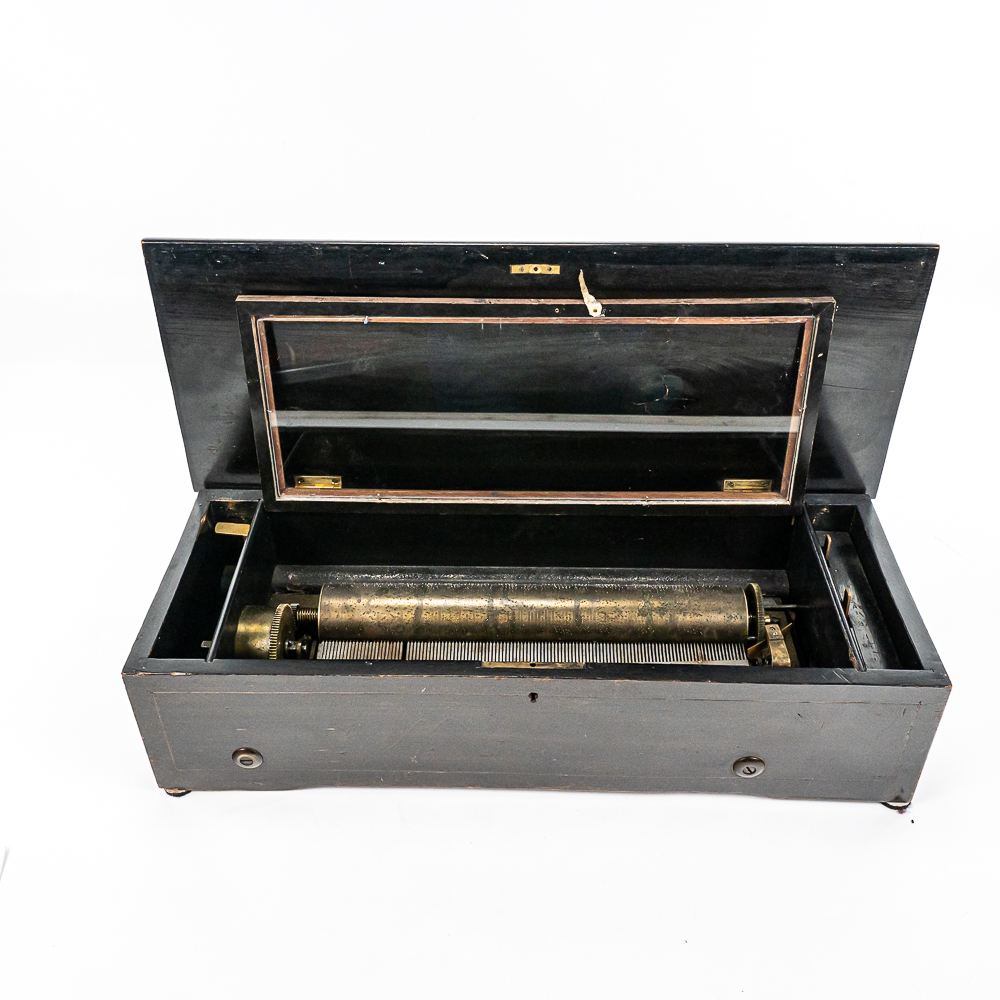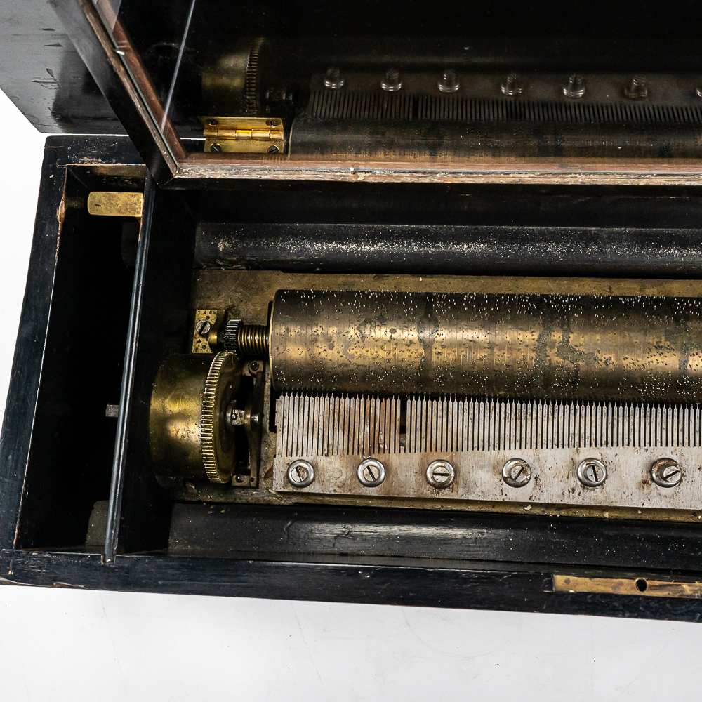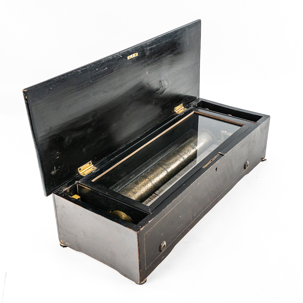 Plays multi tunes in inlaid case. Winds and plays. Has multiple chipped and broken teeth on comb. Missing tune card. Lid has been refinished. No key for lid. Measures 22.75″ wide, 8.5″ deep, 5.75″ tall.