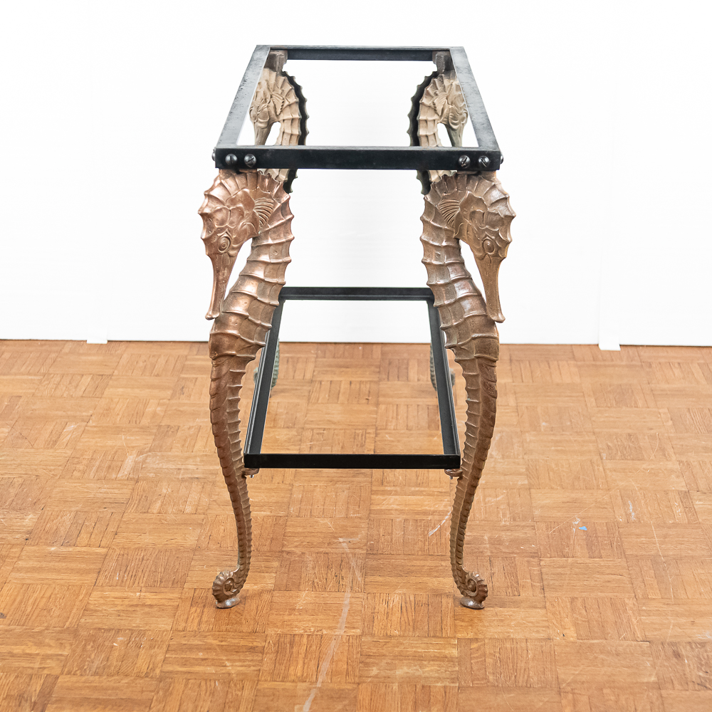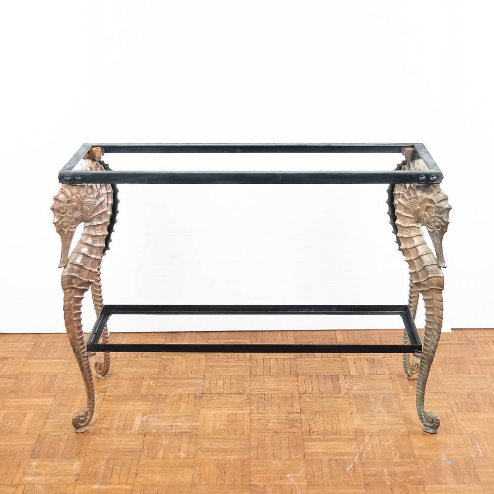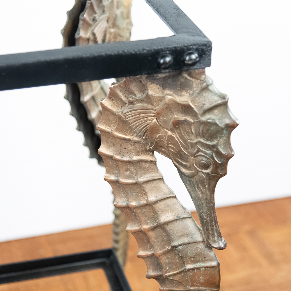 This item is designed to be the base of a sea horse aquarium but the glass aquarium is missing. It would make an interesting table by adding a glass or marble top. Made of steel angle iron with cast sea horse legs. The full aquariums routinely sell for upwards of $8,000. Measures 30″ tall, 41″ wide, 17″ deep.