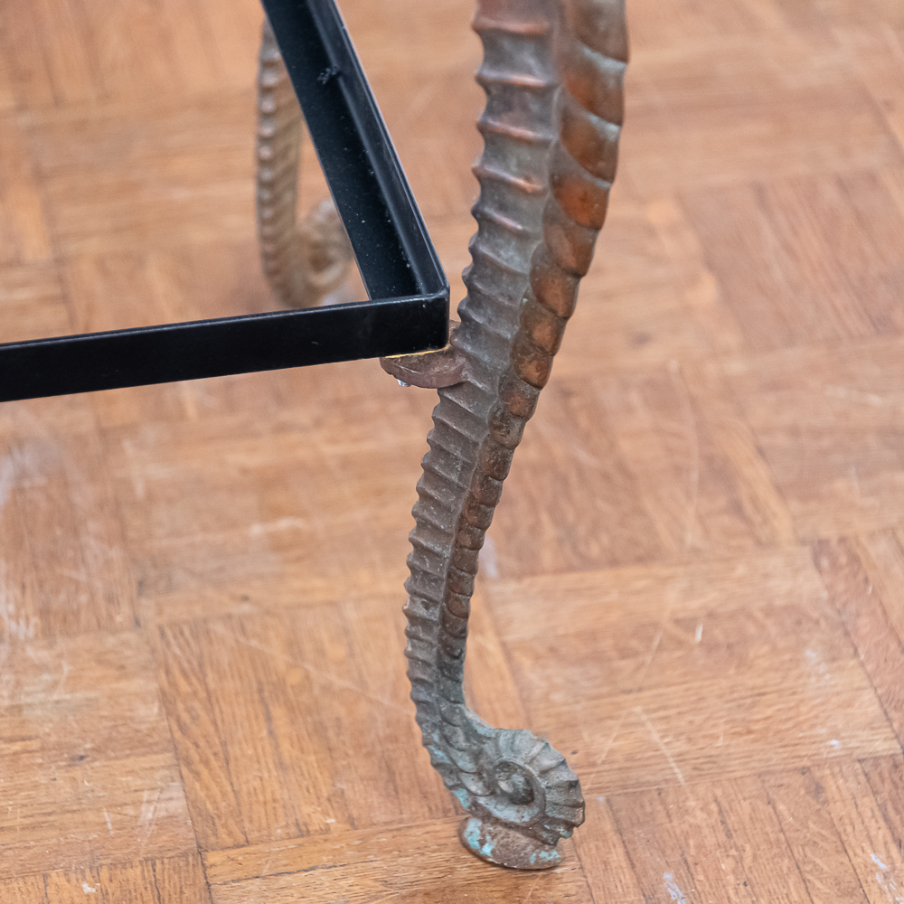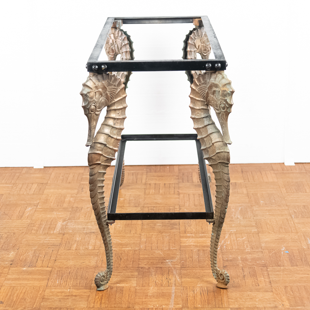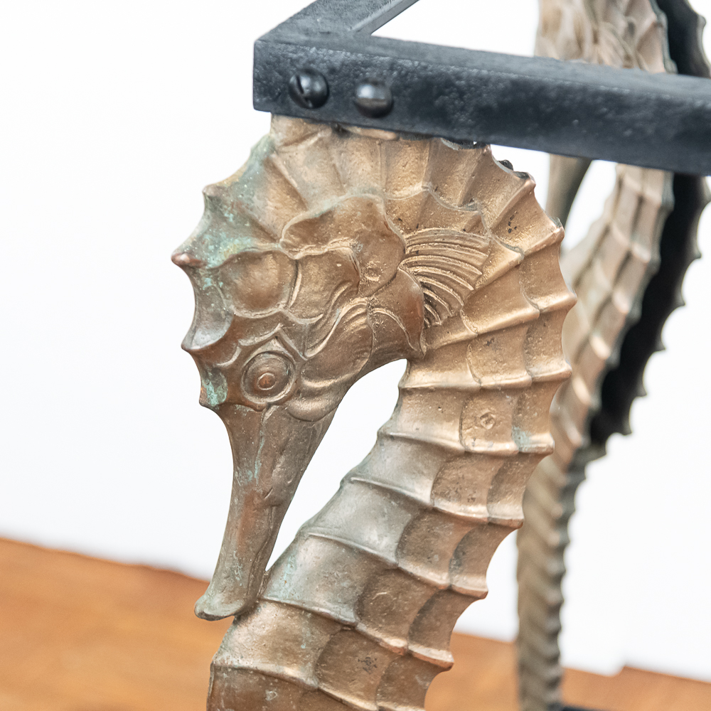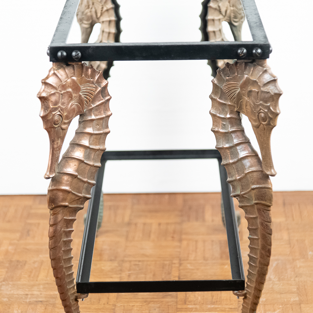 This item is designed to be the base of a sea horse aquarium but the glass aquarium is missing. It would make an interesting table by adding a glass or marble top. Made of steel angle iron with cast sea horse legs. The full aquariums routinely sell for upwards of $8,000. Measures 30″ tall, 41″ wide, 17″ deep.
