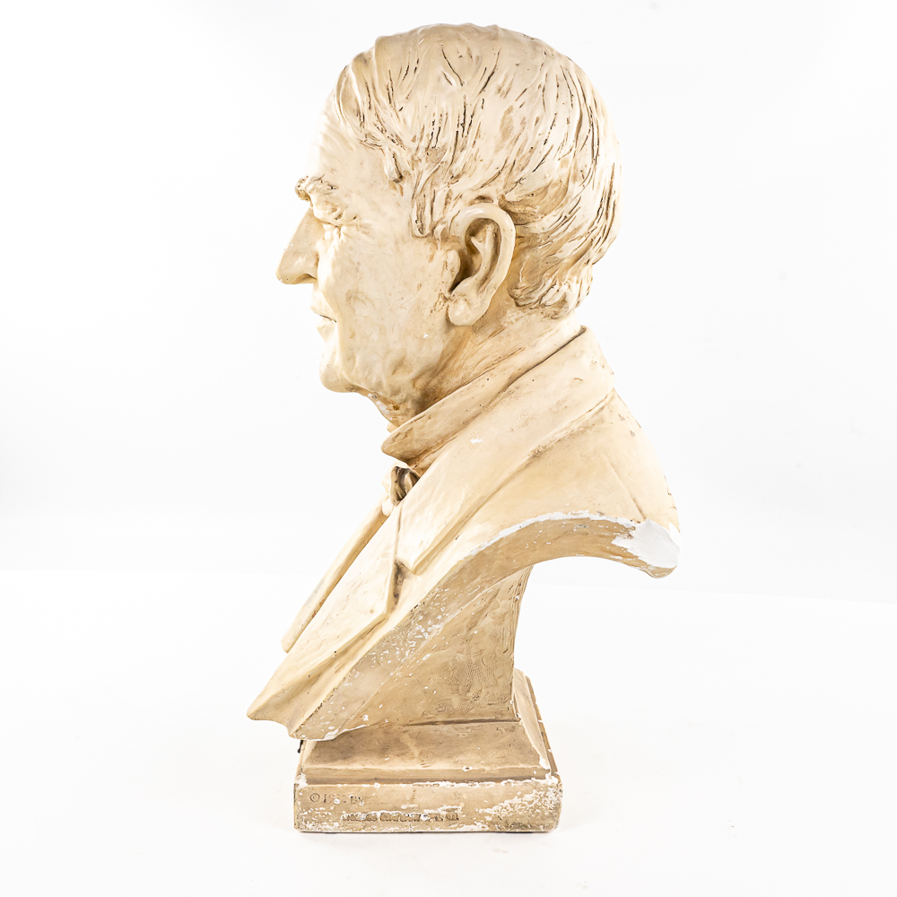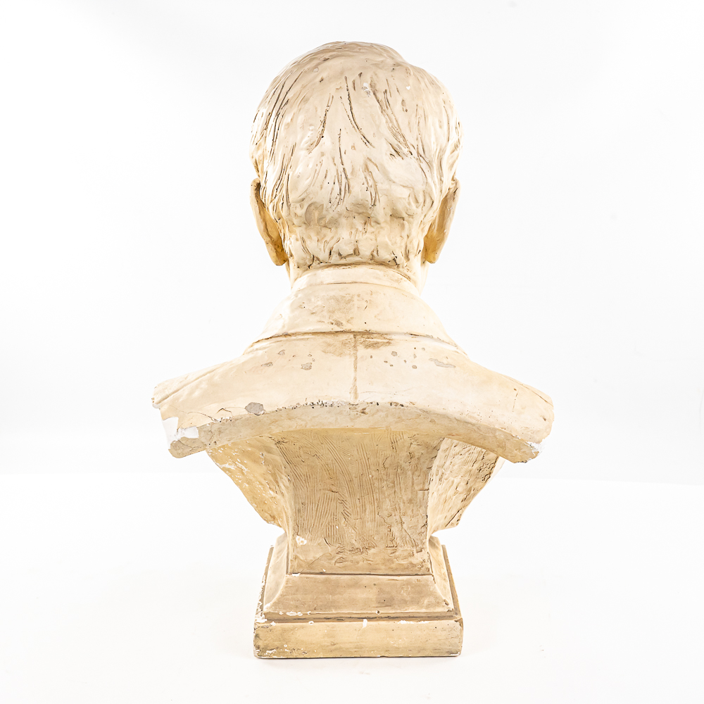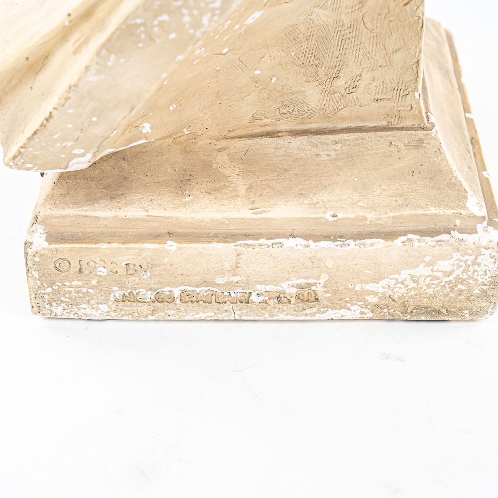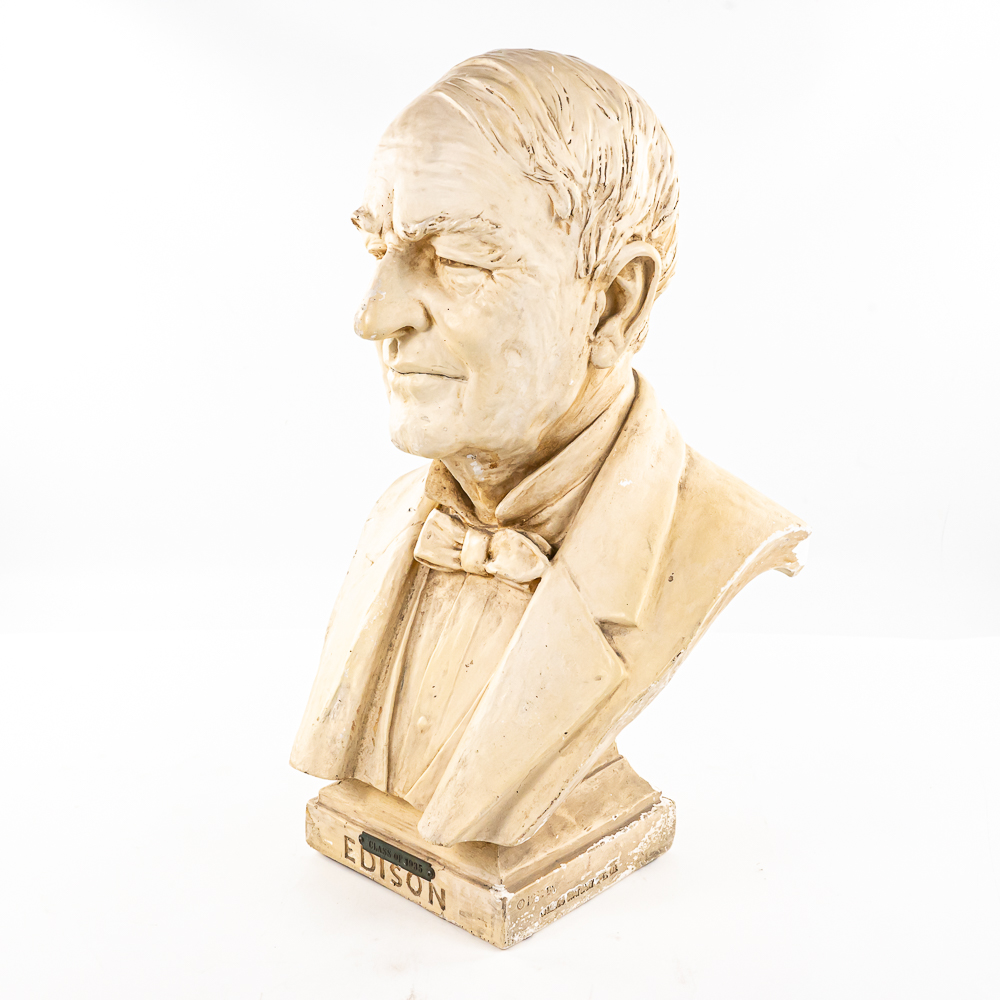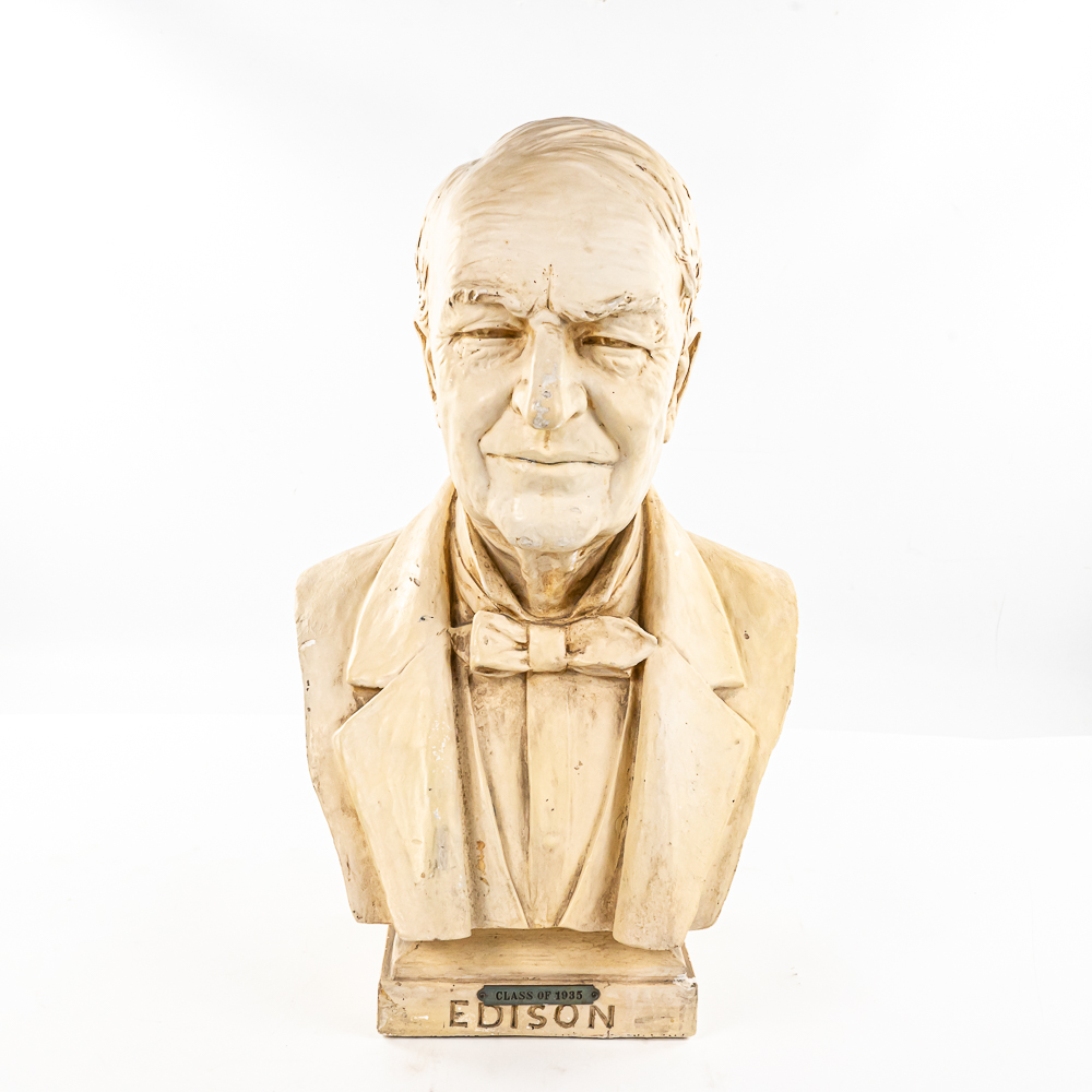 Plaster bust of inventor Thomas A. Edison in VG condition. Signed 1932 by HC Statuary Co. In good condition with a heavy chip on the left shoulder. Measures 22″ tall 14″ wide, 11″ deep. Came from a Wisconsin High school. Brass tag on front reads, Class of 1935. On side of base marked 1932 The C.S. Statuary Co.