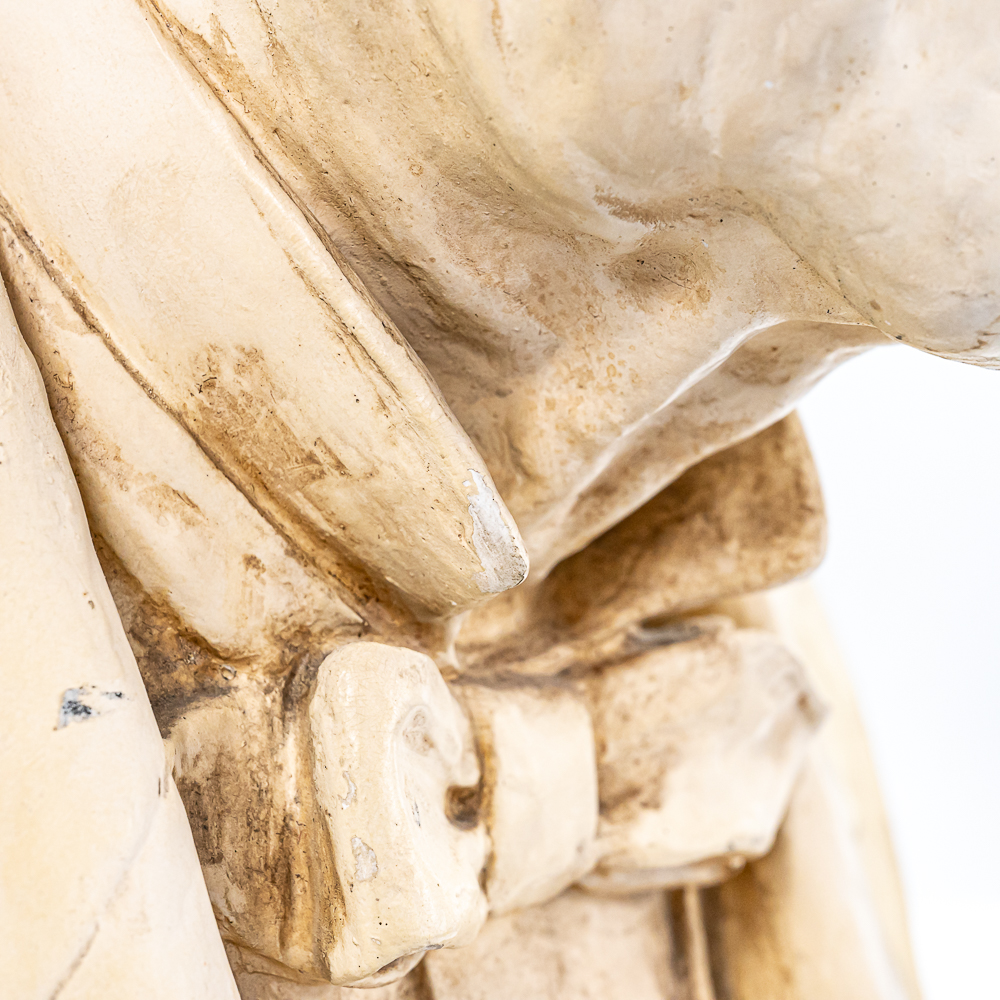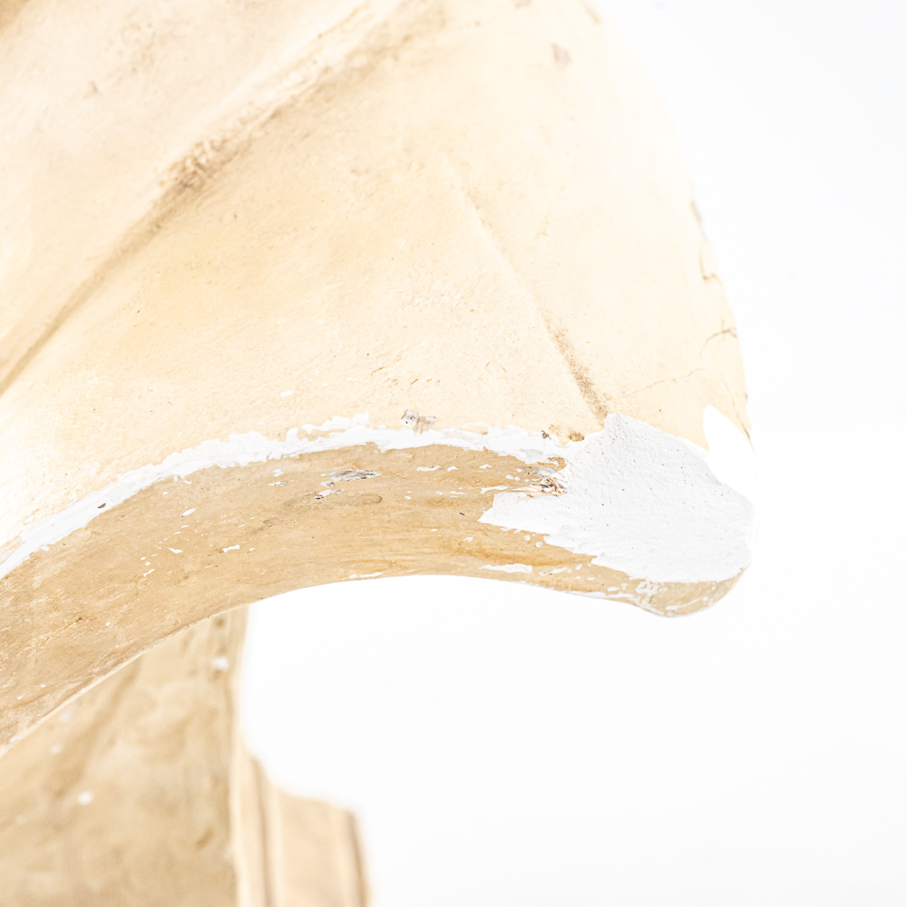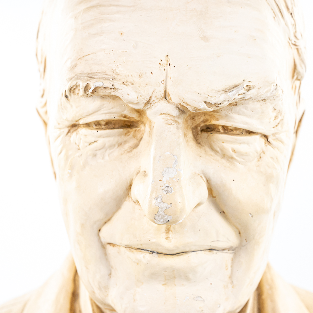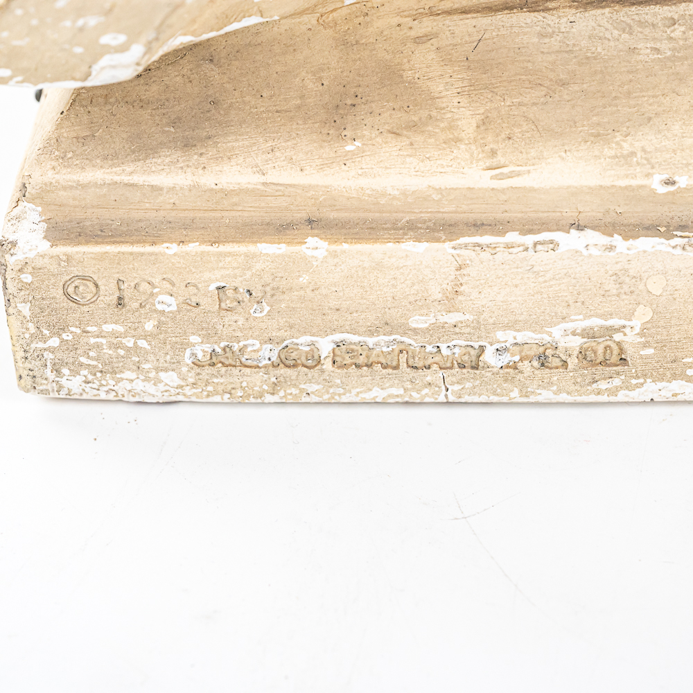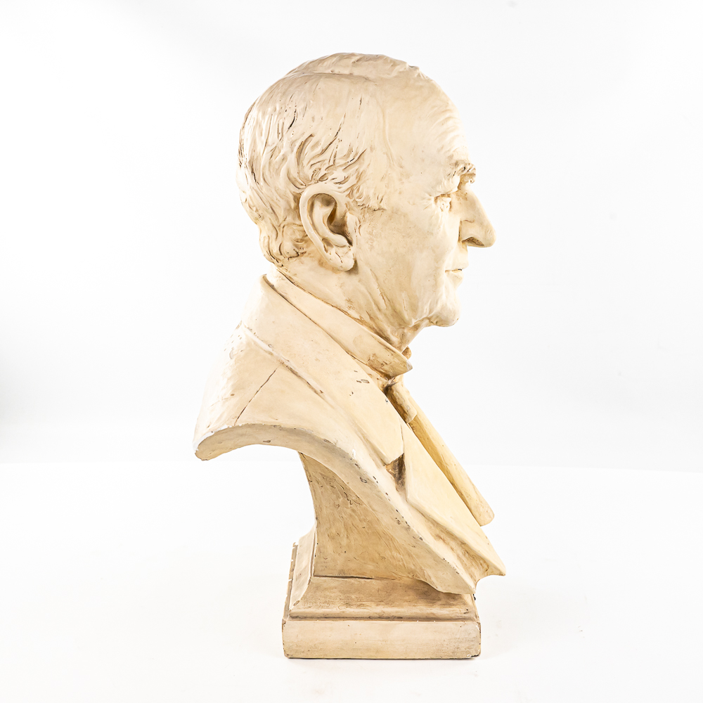 Plaster bust of inventor Thomas A. Edison in VG condition. Signed 1932 by HC Statuary Co. In good condition with a heavy chip on the left shoulder. Measures 22″ tall 14″ wide, 11″ deep. Came from a Wisconsin High school. Brass tag on front reads, Class of 1935. On side of base marked 1932 The C.S. Statuary Co.