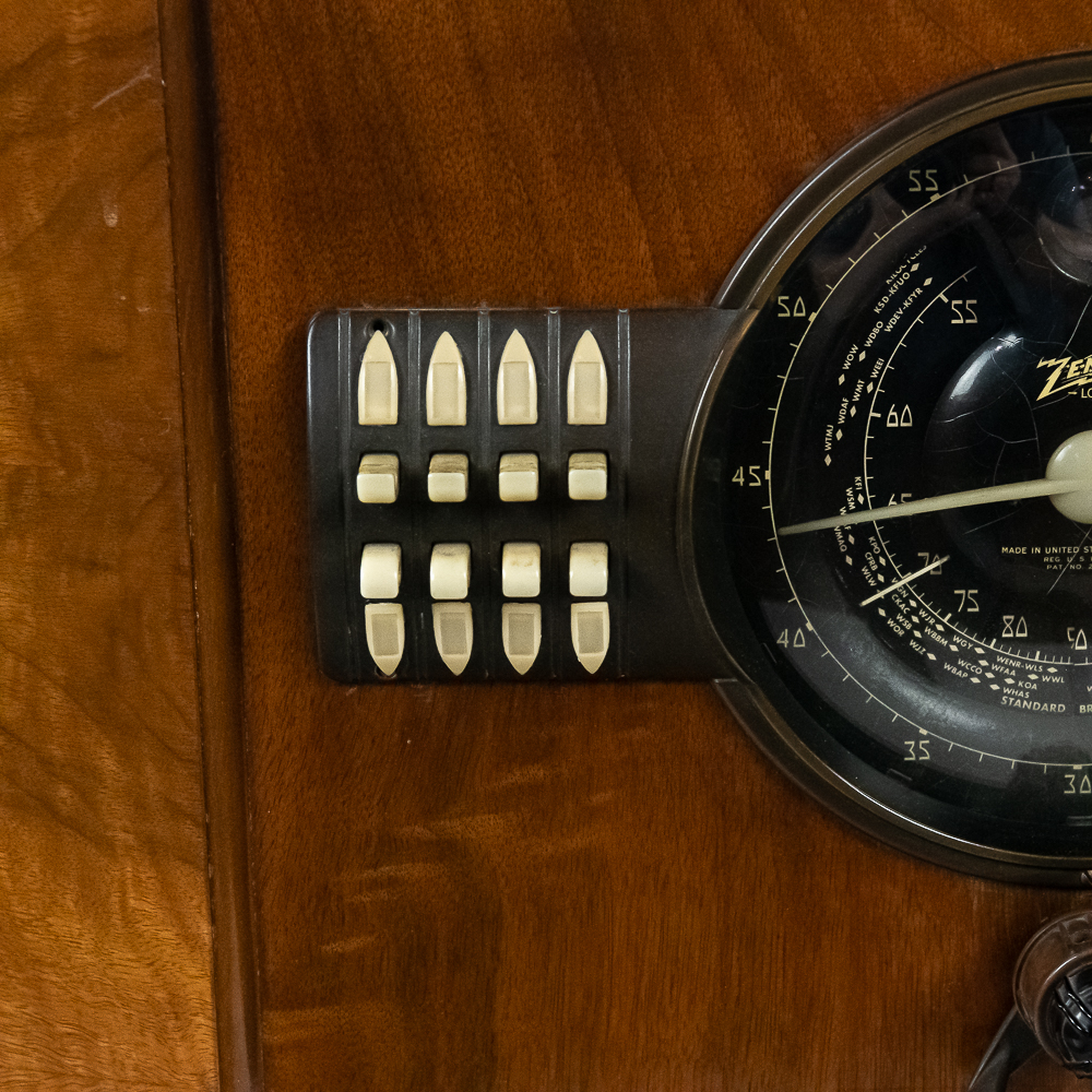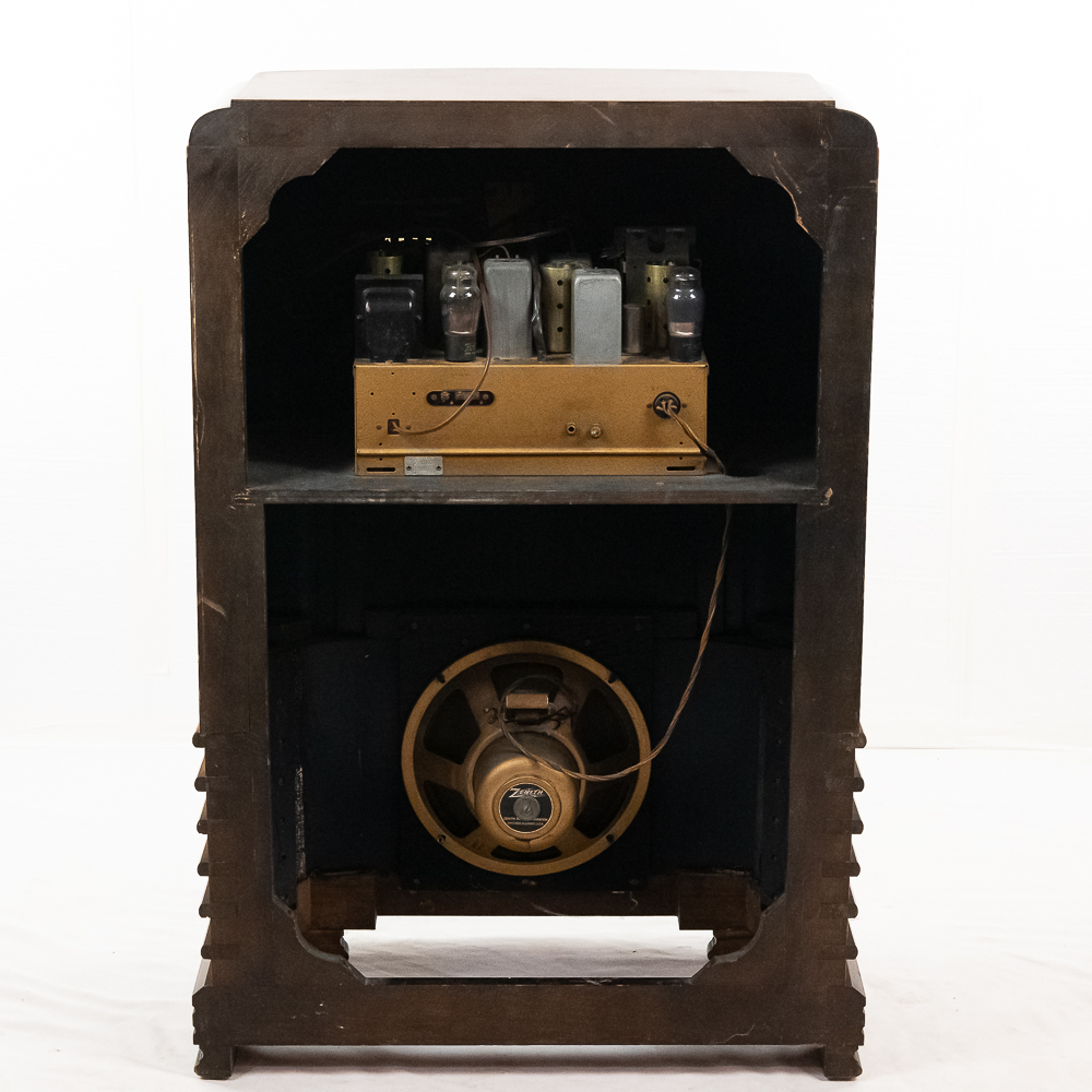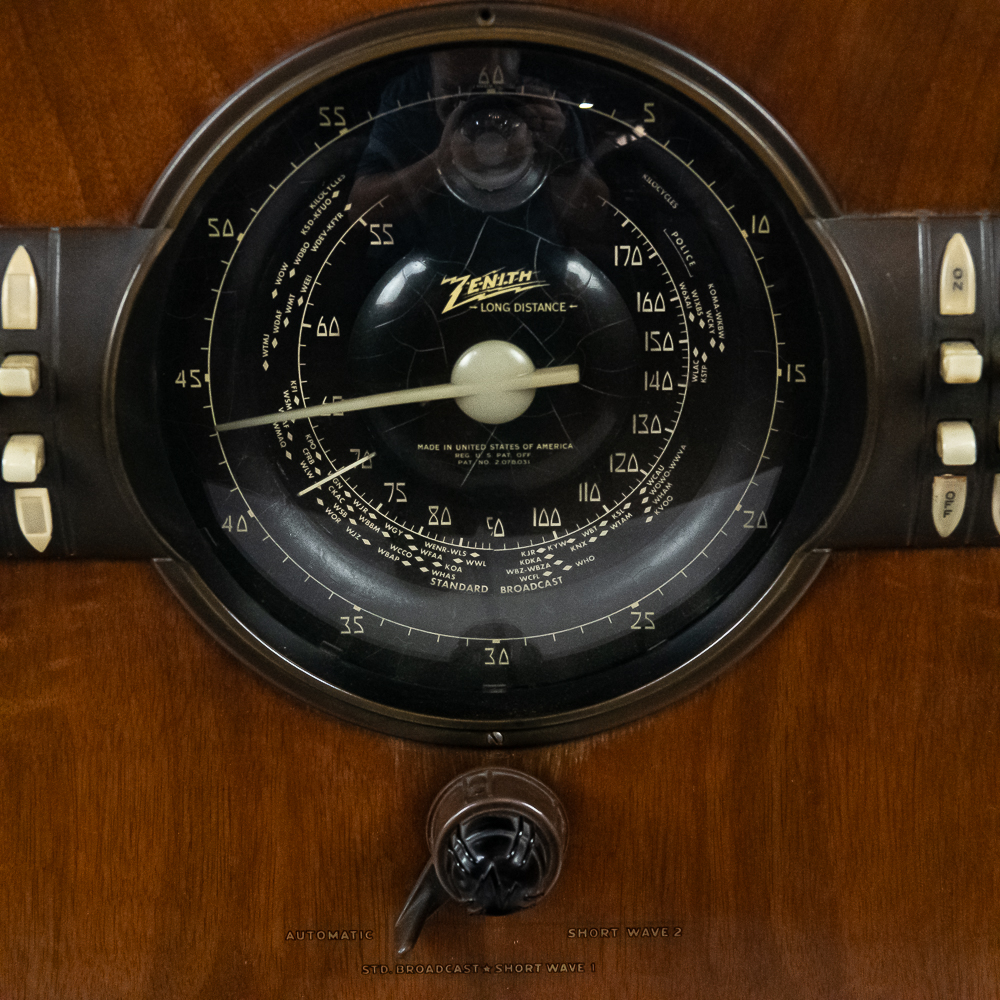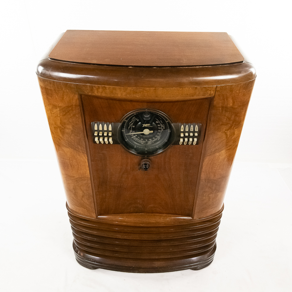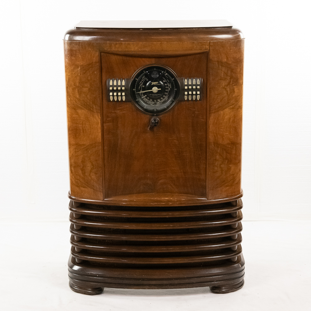 Very nice 1939 Zenith ZEPHYR Shutter dial/Robot dial 9S-367 console tube radio. Original finish cabinet in VG condition. All buttons and knobs in VG original condition. You will not find a nicer all original radio. Measures 43.5″ tall, 28″ wide, 15″ deep.