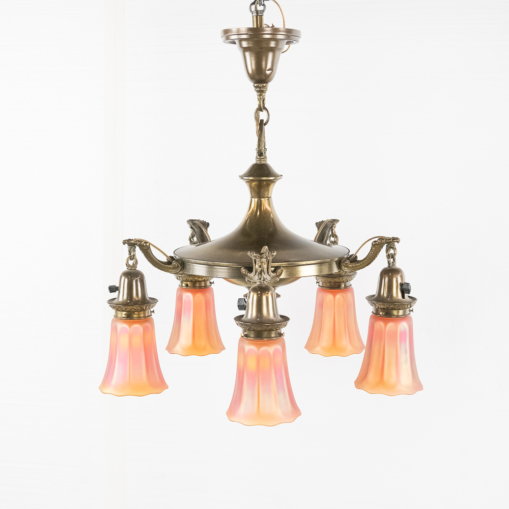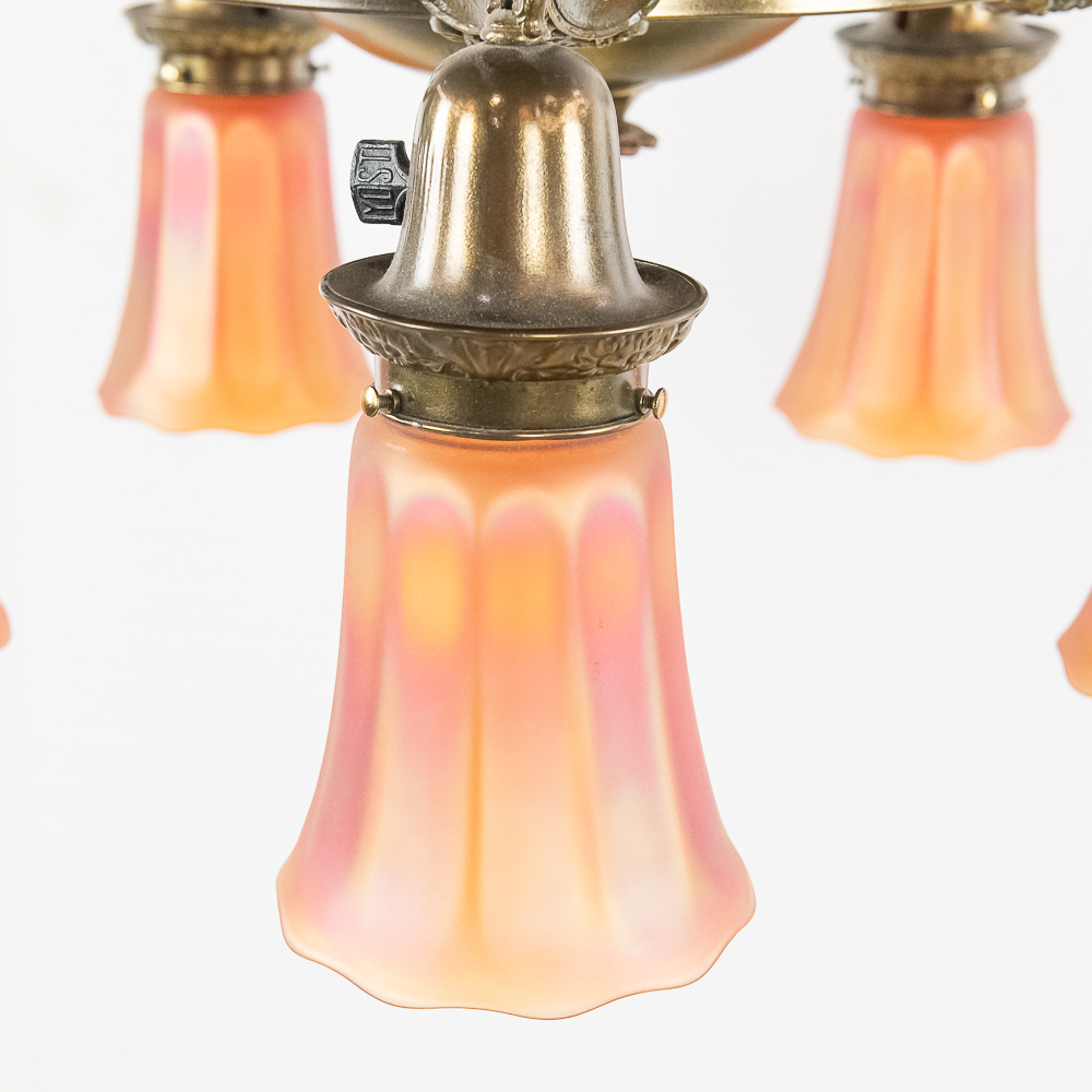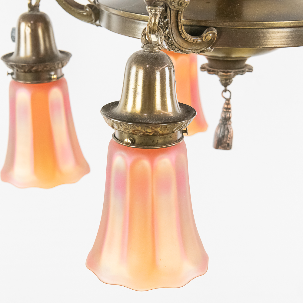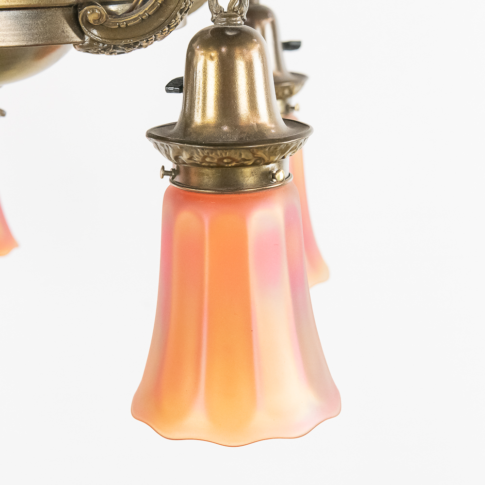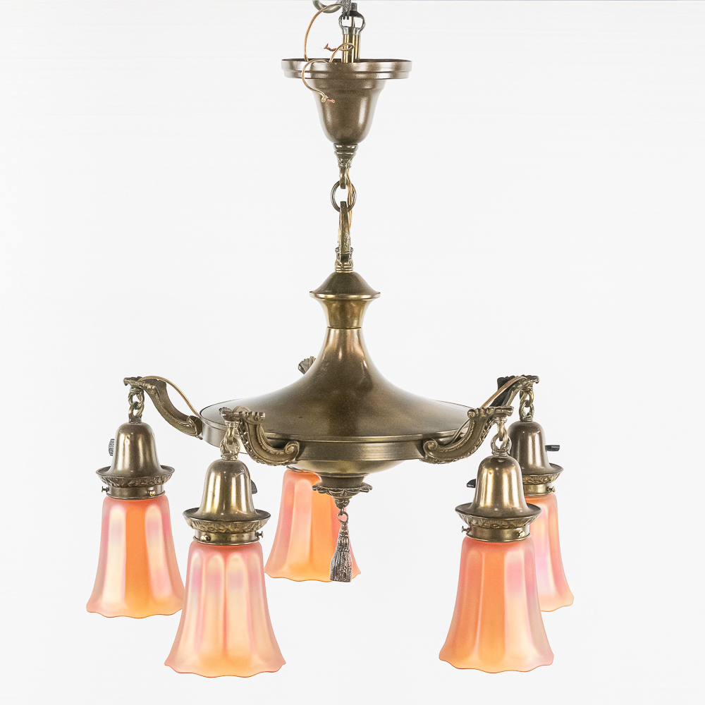 Nice vintage 5 arm brass hanging light fixture with carnival glass shades. Shades measure 5.5″ tall, 4.5″ bell, 2.25 fitter end. Each standard base lamp socket is individually switched. In VG condition. Measures 24″ in diameter with a 22″ drop.