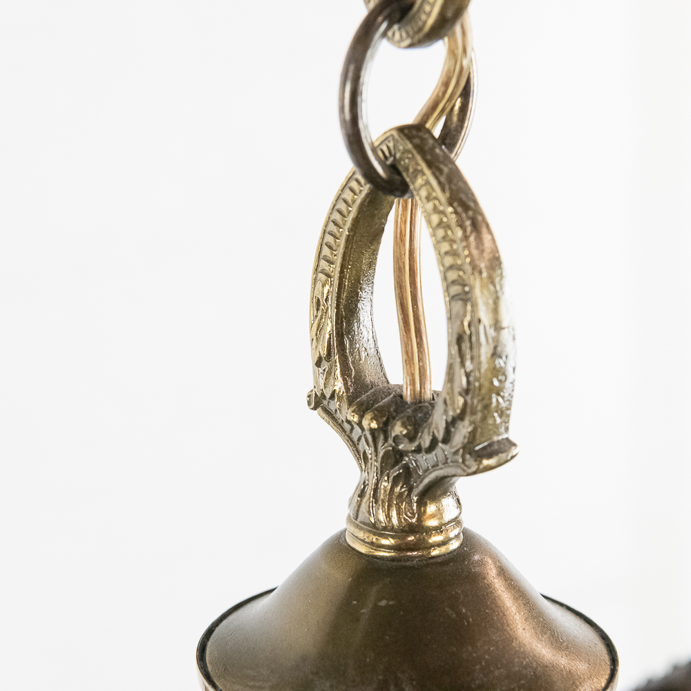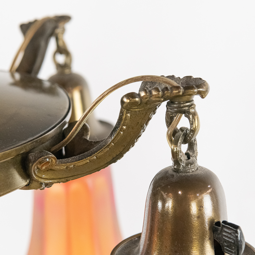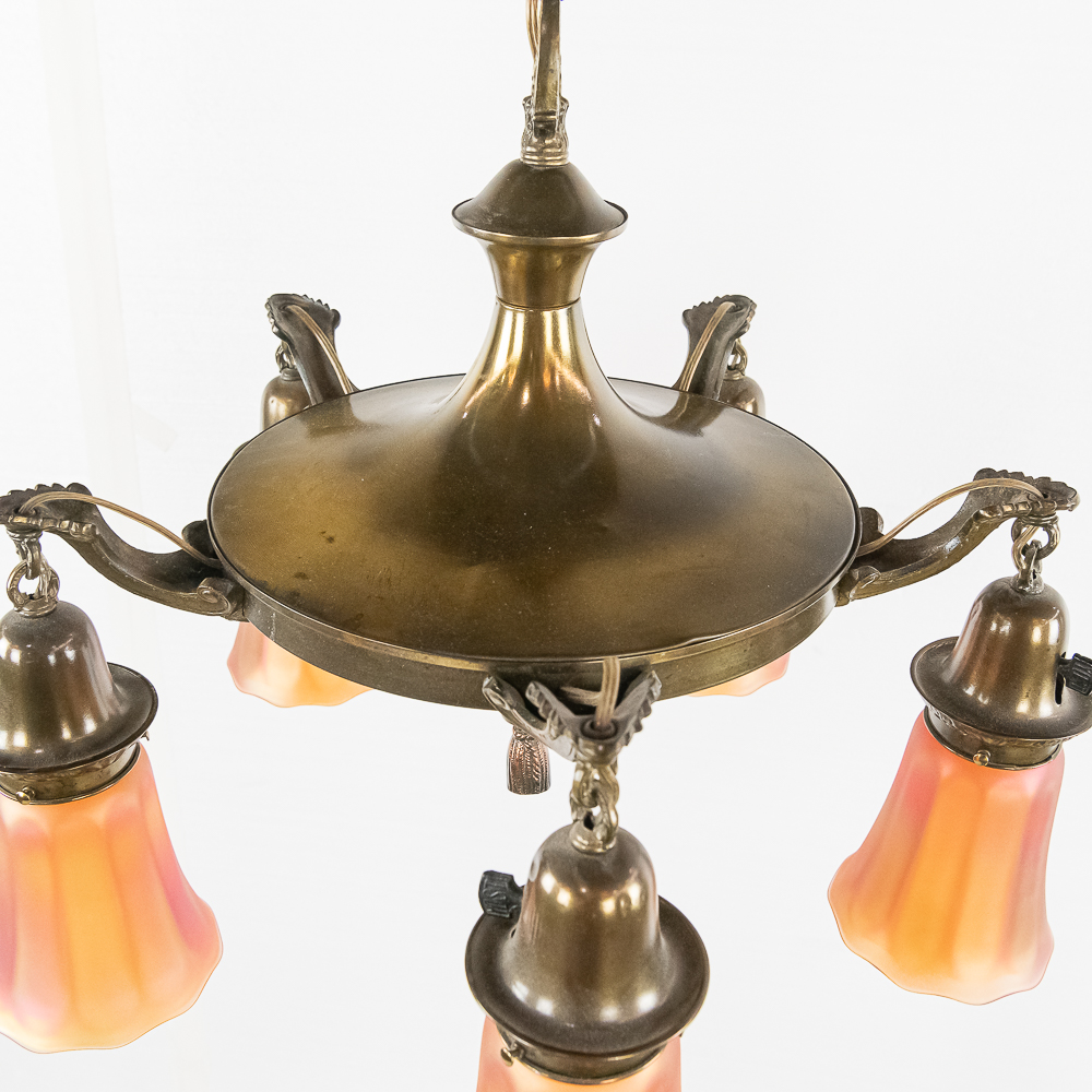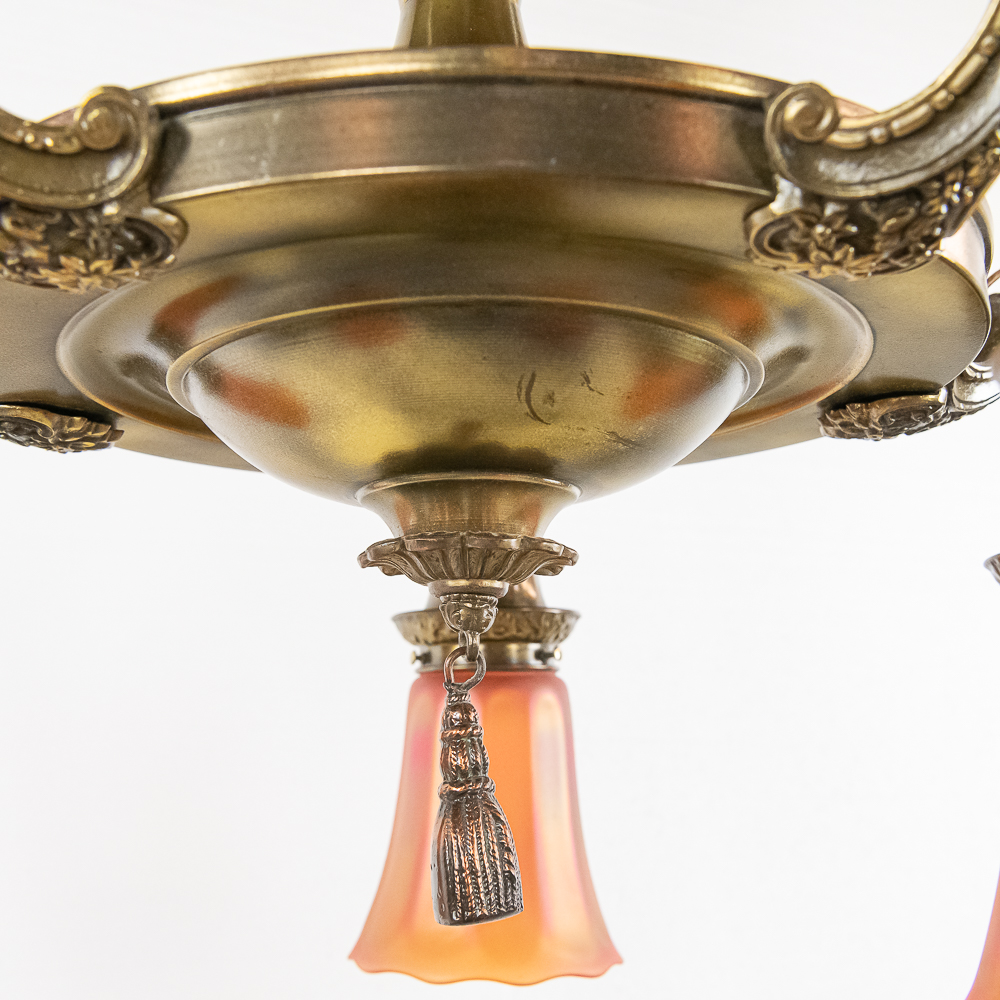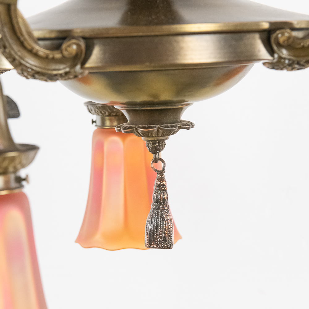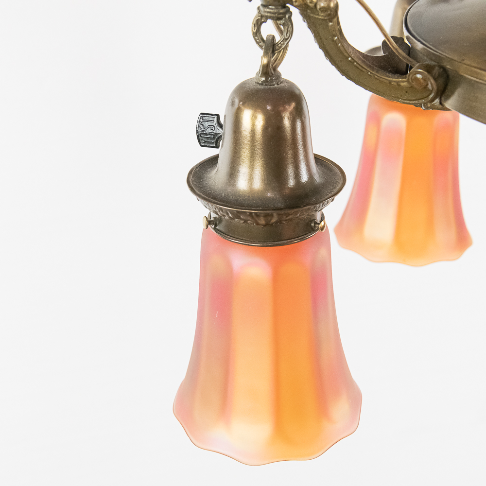 Nice vintage 5 arm brass hanging light fixture with carnival glass shades. Shades measure 5.5″ tall, 4.5″ bell, 2.25 fitter end. Each standard base lamp socket is individually switched. In VG condition. Measures 24″ in diameter with a 22″ drop.
