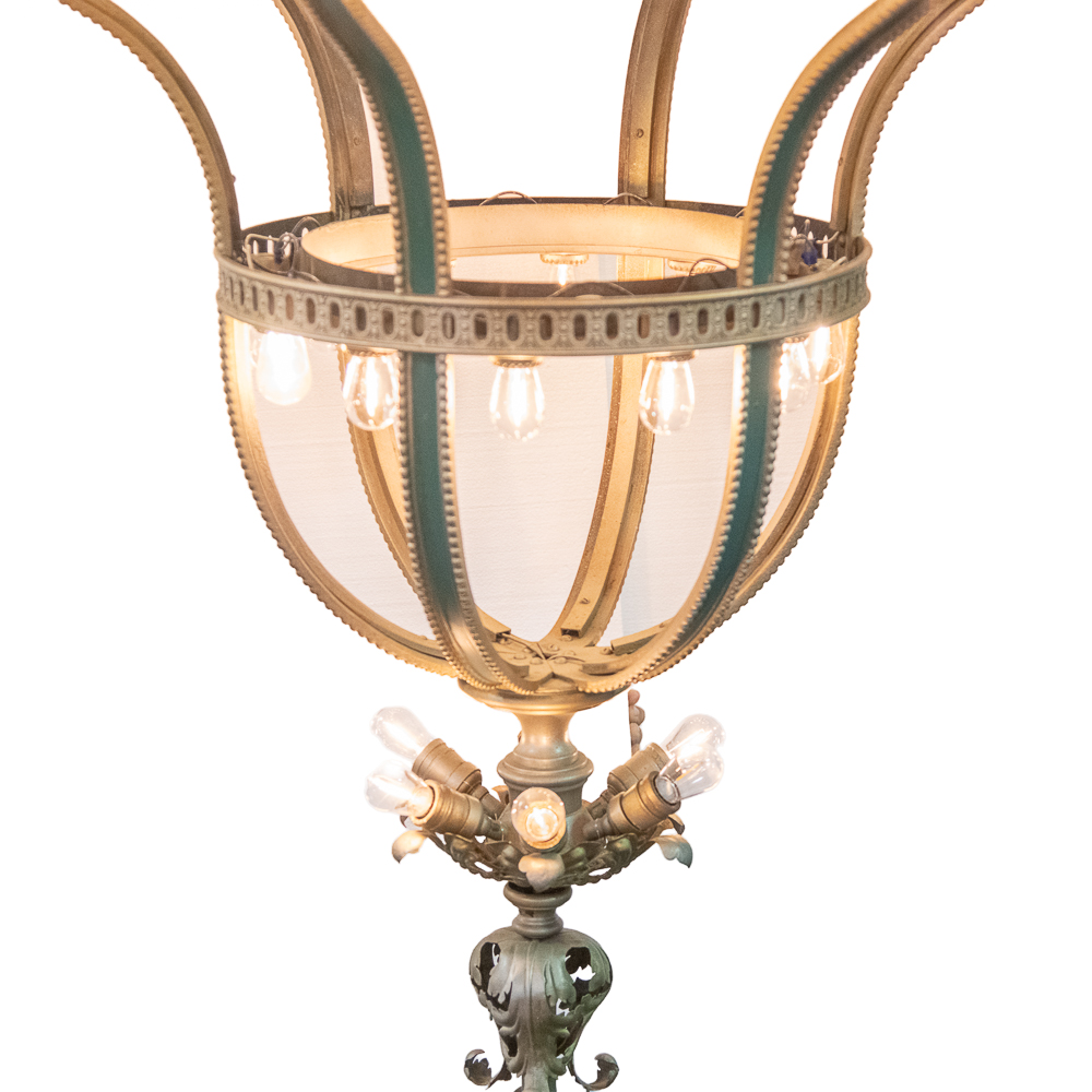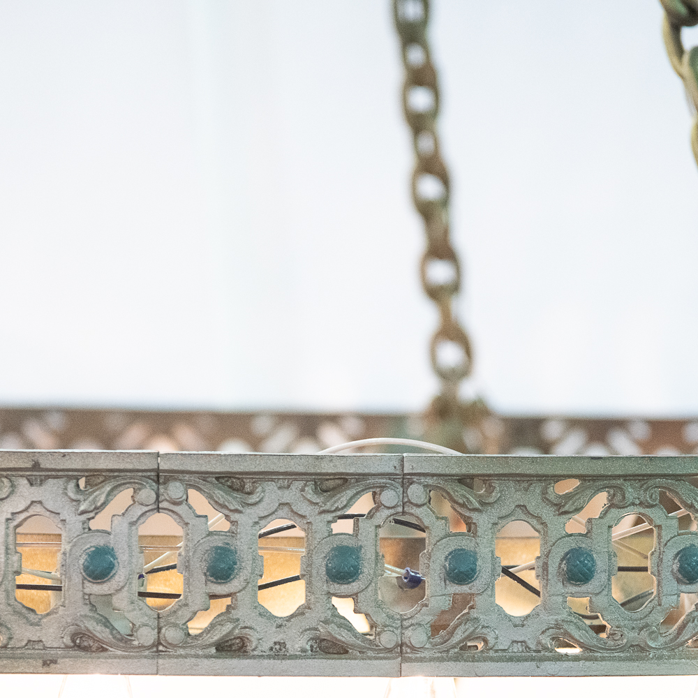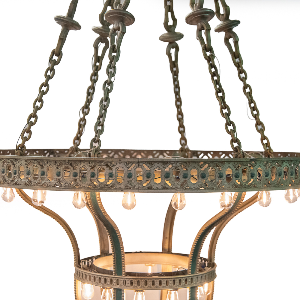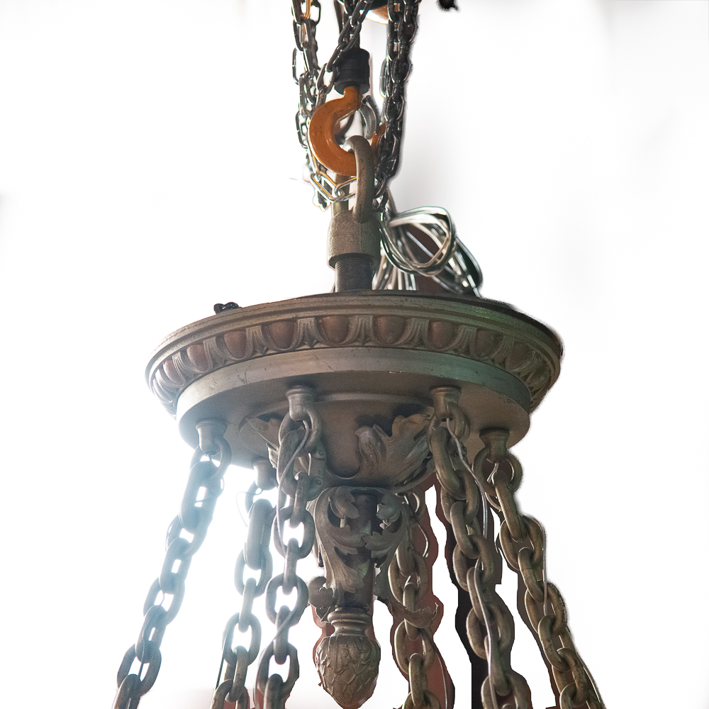 This magnificent chandelier is one of six matching fixtures that were installed in the Goodman Auditorium located in Virginia, Minnesota, in 1920. There are 2 of the six in this auction. The 1500 seat Goodman was called the Carnegie Hall of the midwest because of its excellent acoustics. The last performance was held on May 20, 2023. The building is currently being readied for demolition. The chandelier is a classic pre depression 3 tier type found in large auditoriums, movie palaces, and large commercial buildings. The iron and steel structure is hung from 6 heavy cascading chains with each chain having an ornamental break in the center. The top tier has a pierced ornamental gallery with 24 standard base lamps and measures 56″ in diameter. The second tier has 8 standard base lamps and measures 22″ in diameter. The bottom tier has a 6 standard base cluster with a 10″ finial of formed metal acanthus leaves. Overall height of the fixture is 106″. This does not include the 10″ ceiling canopy or the hoist pipe which is included. The chandelier can have a longer drop by adding chain between the canopy ring and the fixture ring. The fixture has recently been rewired and is ready to go. The weight is estimated at 300 lbs. The 2nd fixture from the Goodman Auditorium is in the previous lot. Seldom do these fixtures ever come up for sale as most of these buildings are now landmarked and the cost to reproduce a chandelier of this quality and size would be out of the question. No shipping on this item. Customer pickup or 3rd party transport only.
