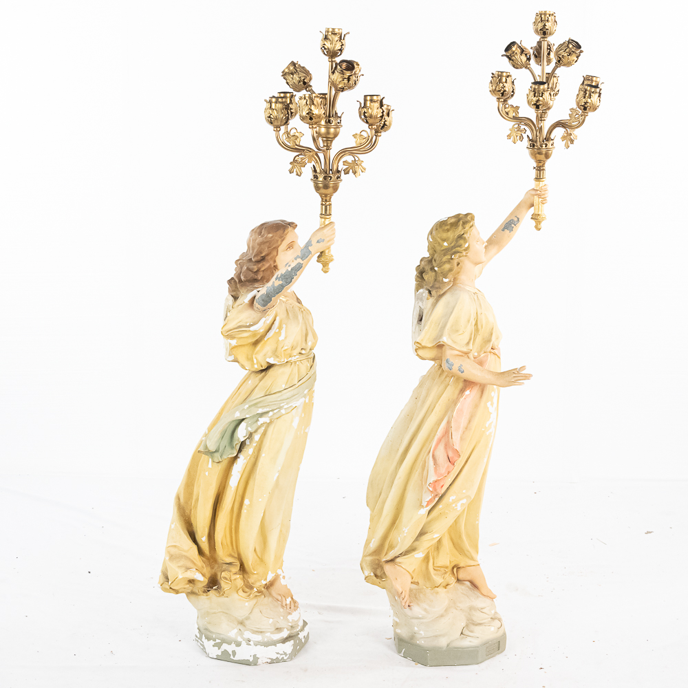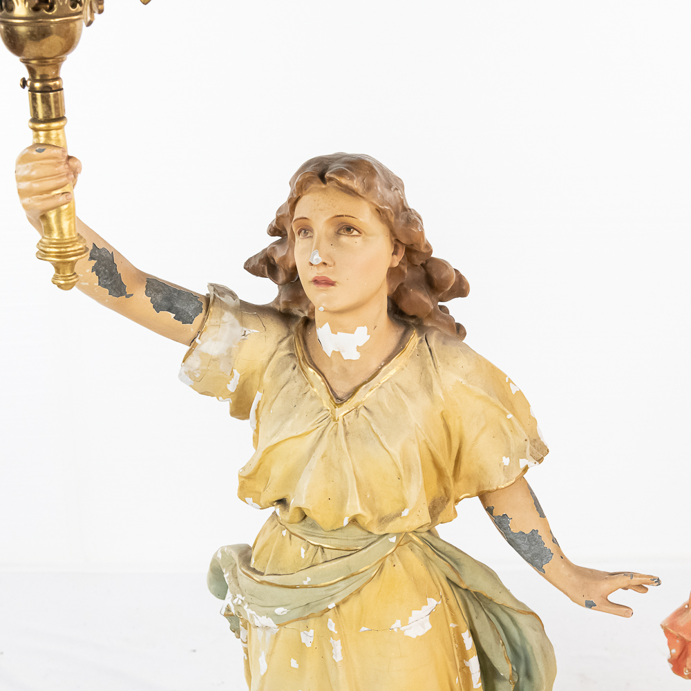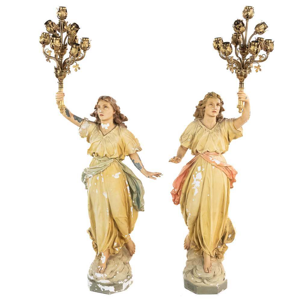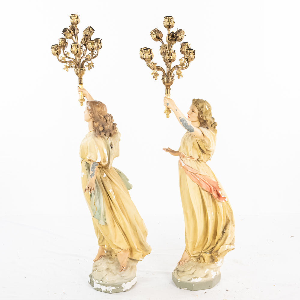 2 matching but opposing plaster statues of standing angels holding 10 light brass torchiere light fixtures aloft. The angels arms are made of zinc. One finger is broken off of one of the angels hands. The angels are missing their wings. The torchieres use Edison base (standard) lamps. In overall good condition with some paint loss. Both statue/lamps need to be rewired. The bases are stamped Copyright 1916 by Daprato Statuary Co. Chicago – New York. Measure 53″ tall each to the top of the light fixtures.