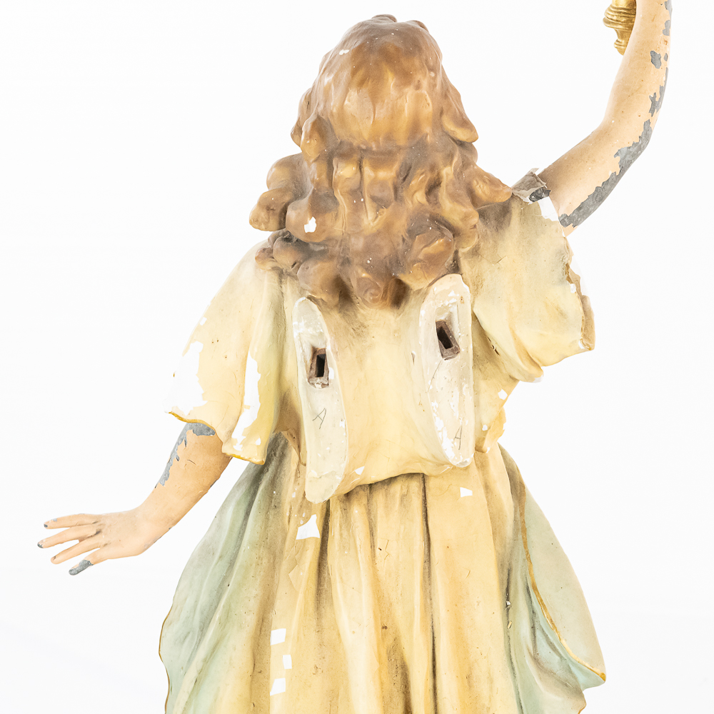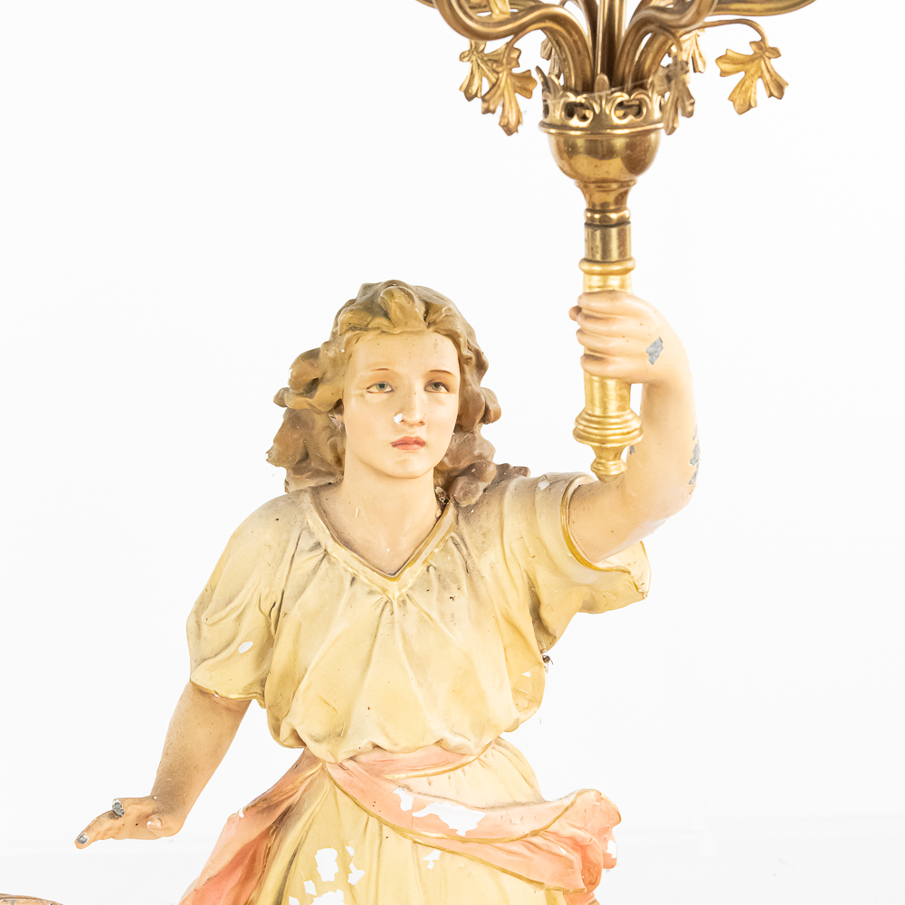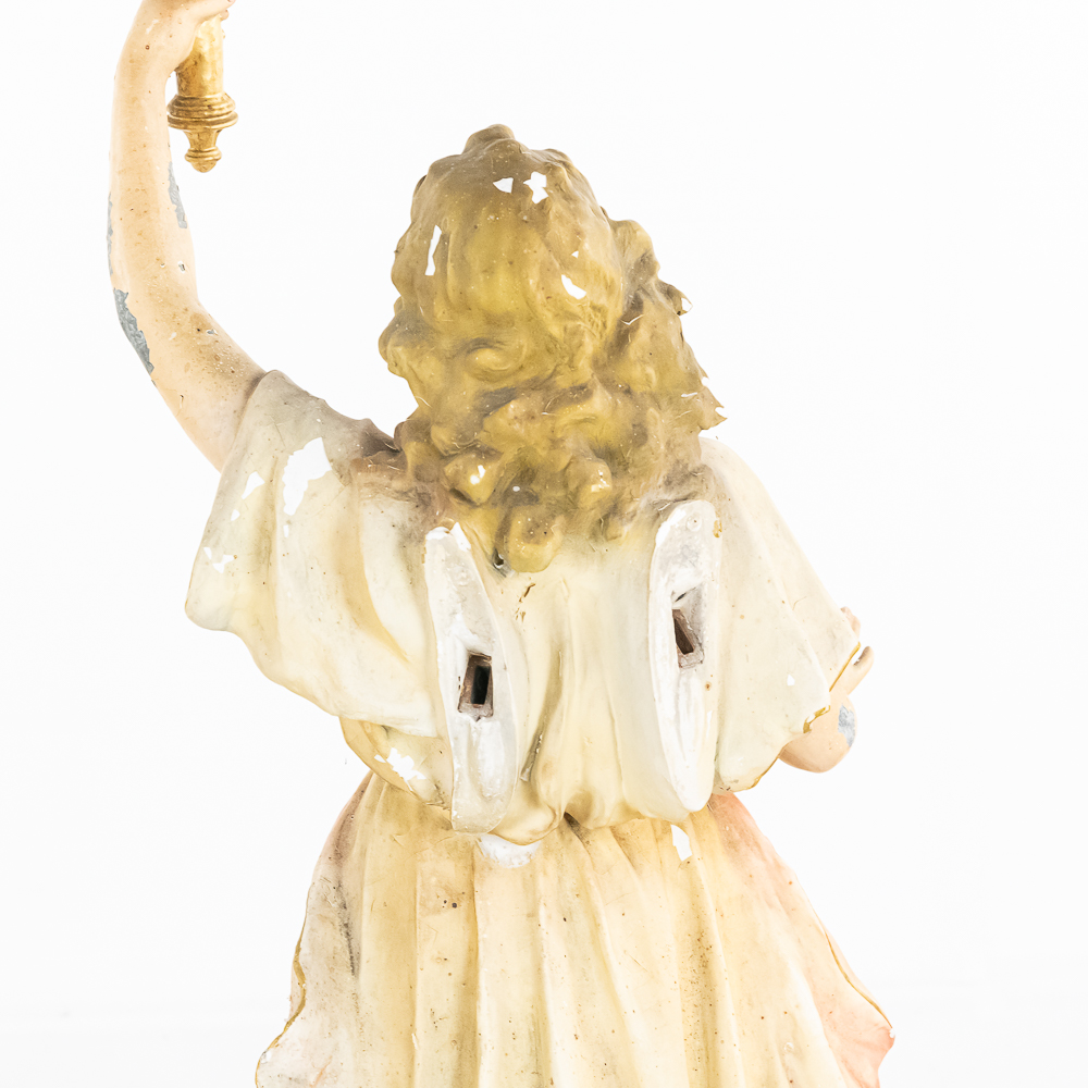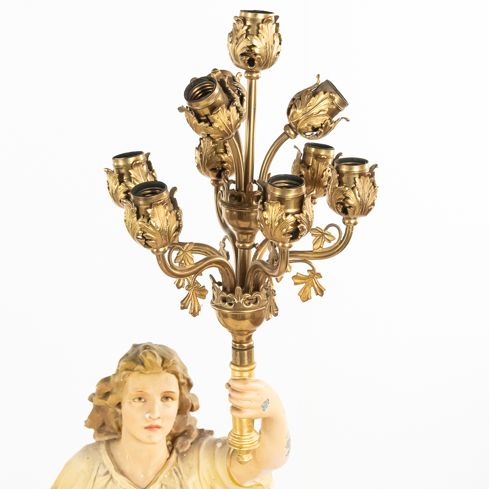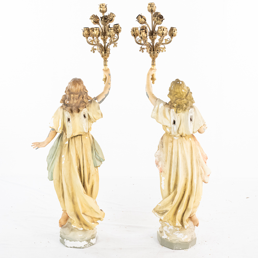 2 matching but opposing plaster statues of standing angels holding 10 light brass torchiere light fixtures aloft. The angels arms are made of zinc. One finger is broken off of one of the angels hands. The angels are missing their wings. The torchieres use Edison base (standard) lamps. In overall good condition with some paint loss. Both statue/lamps need to be rewired. The bases are stamped Copyright 1916 by Daprato Statuary Co. Chicago – New York. Measure 53″ tall each to the top of the light fixtures.