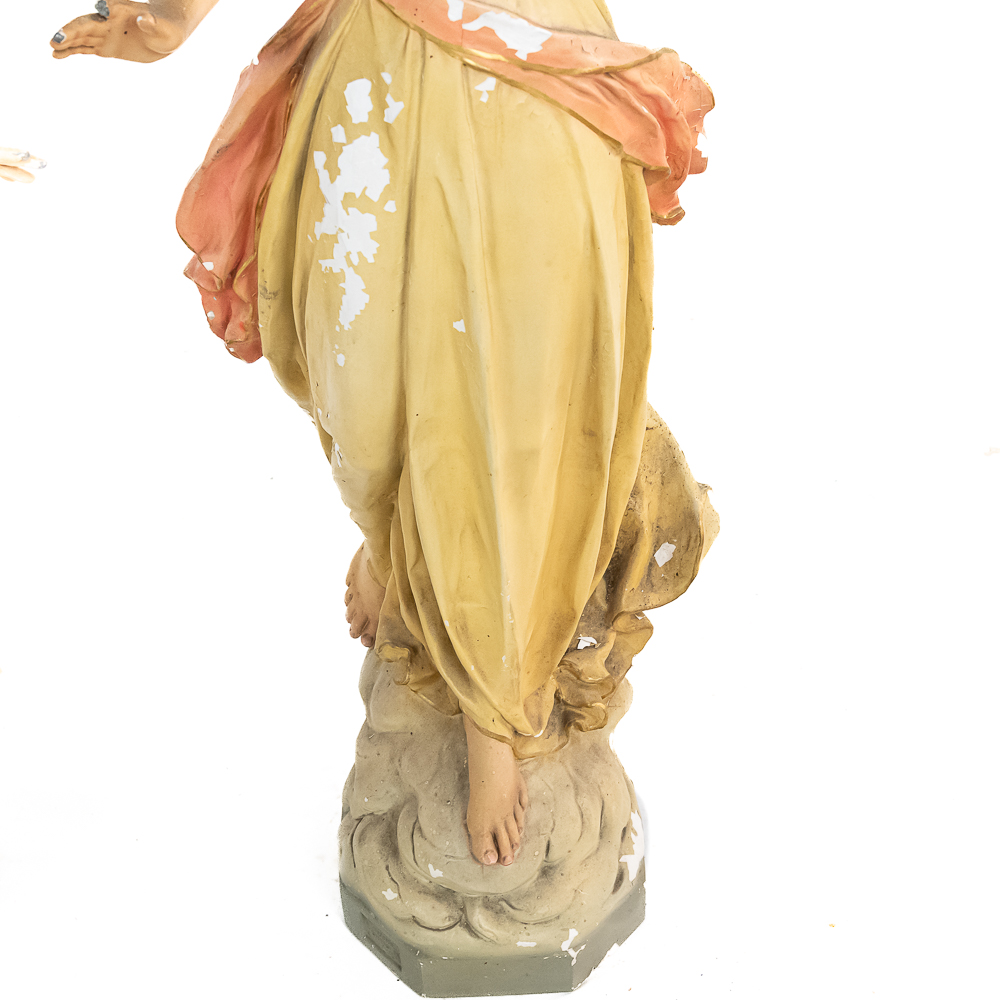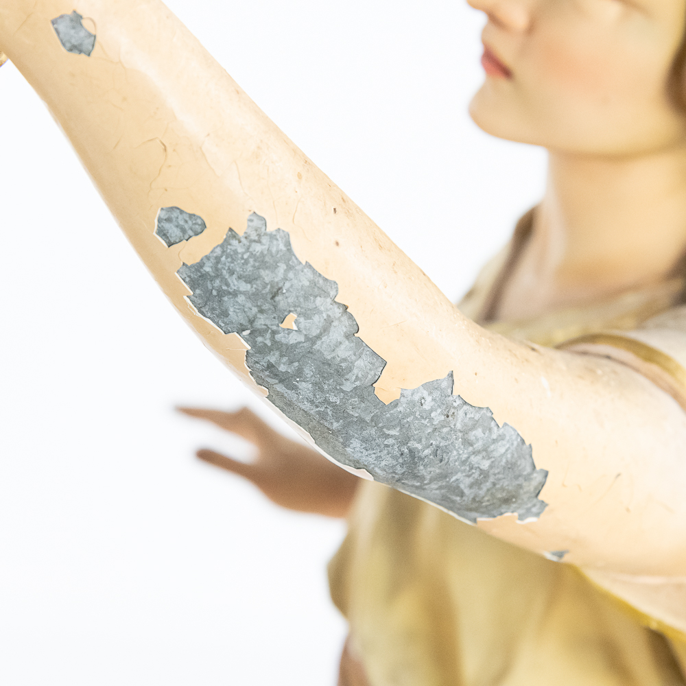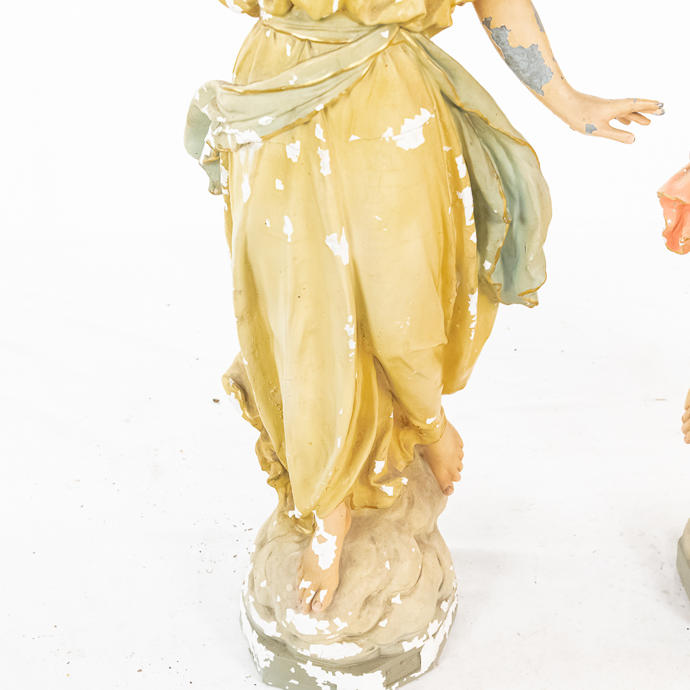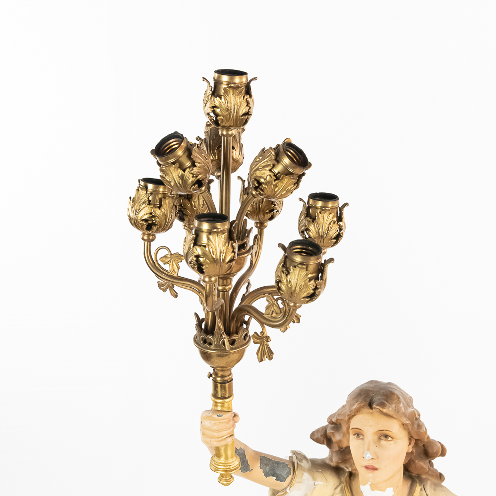 2 matching but opposing plaster statues of standing angels holding 10 light brass torchiere light fixtures aloft. The angels arms are made of zinc. One finger is broken off of one of the angels hands. The angels are missing their wings. The torchieres use Edison base (standard) lamps. In overall good condition with some paint loss. Both statue/lamps need to be rewired. The bases are stamped Copyright 1916 by Daprato Statuary Co. Chicago – New York. Measure 53″ tall each to the top of the light fixtures.
