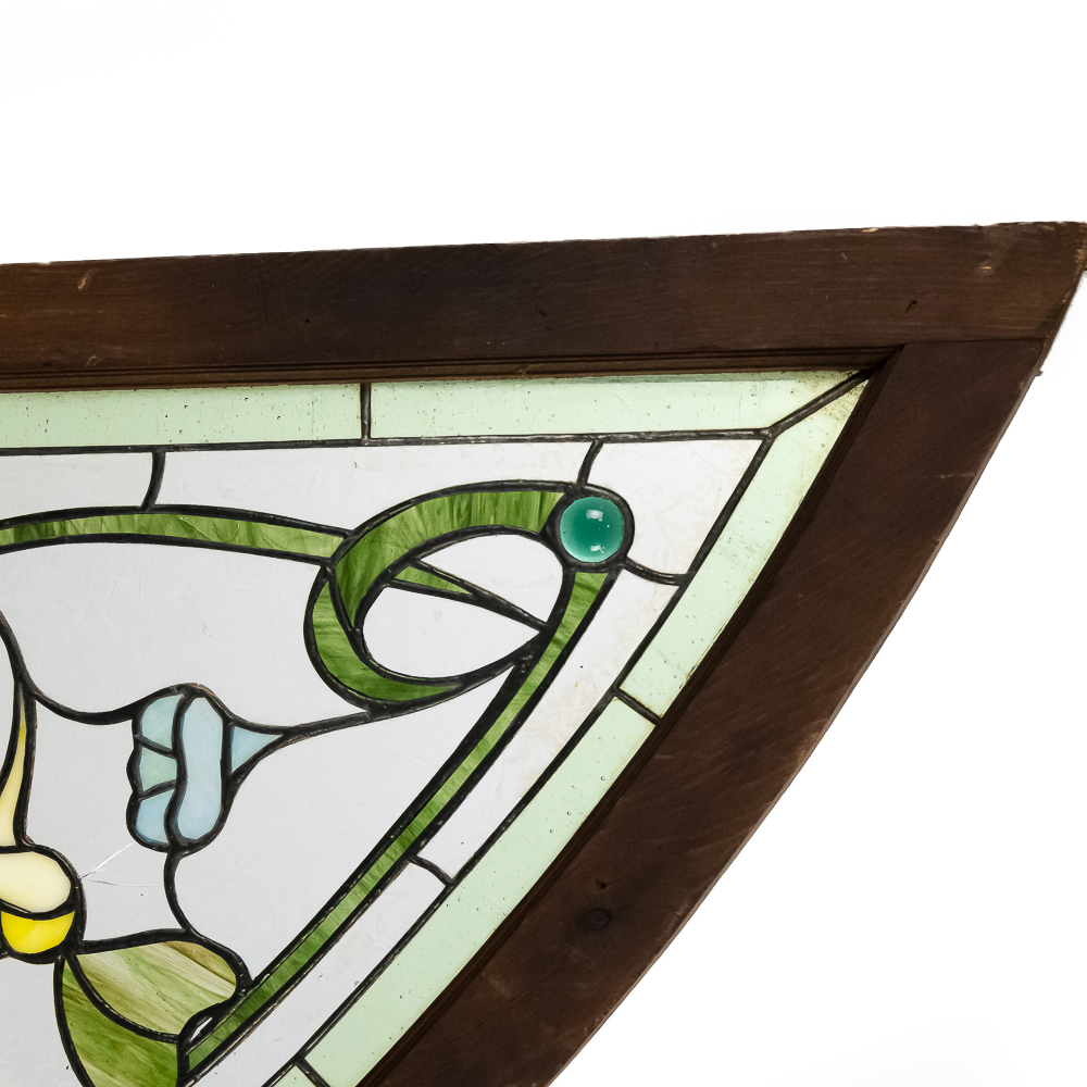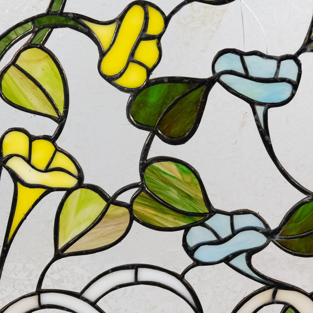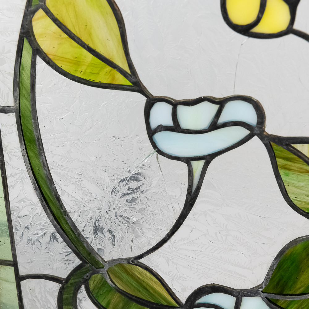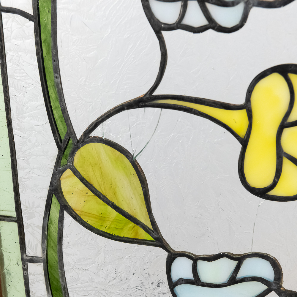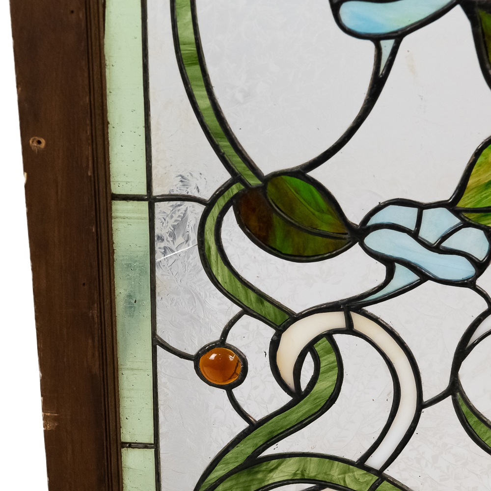 Lot of 2: Lily design stained glass left and right panels in wood frames. The lily design is surrounded by beautiful floral design etched glass and multi-colored jewels. Overall in good condition with just a few cracks throughout.