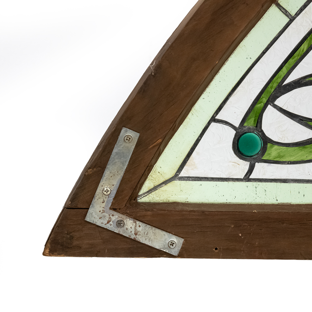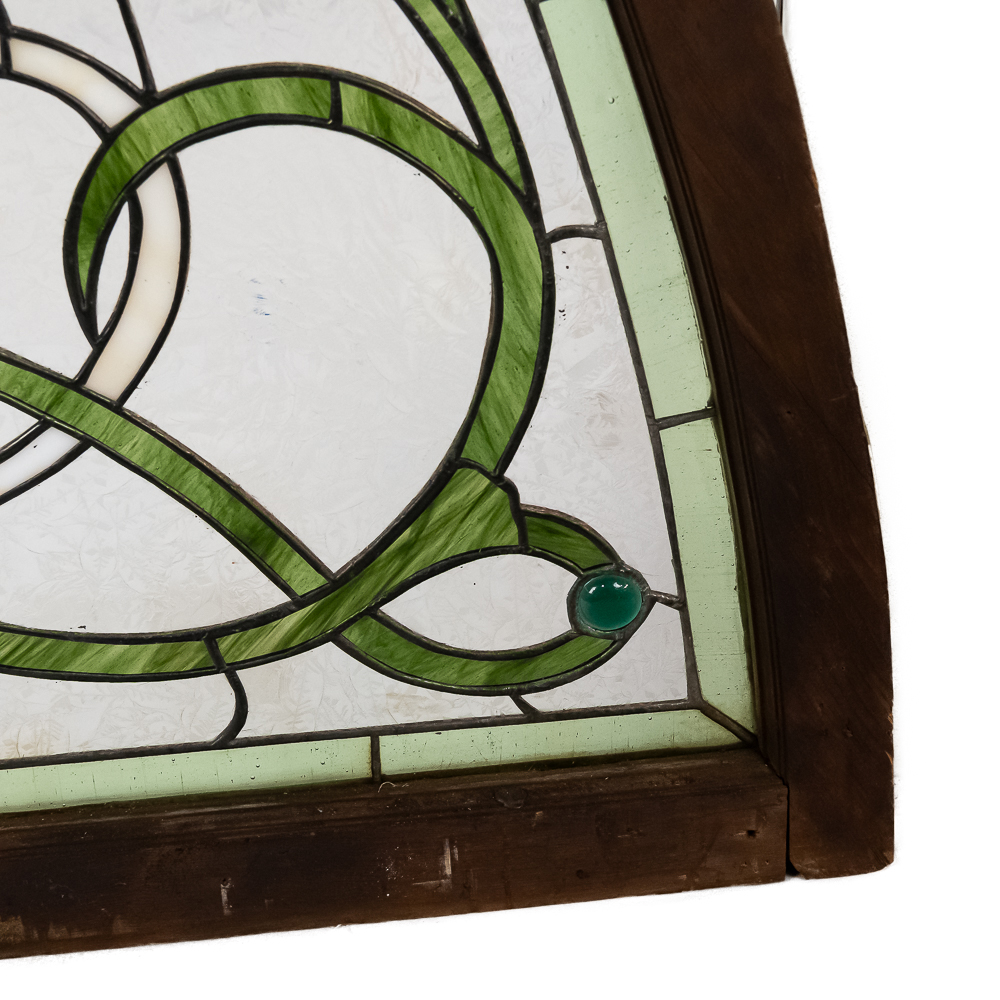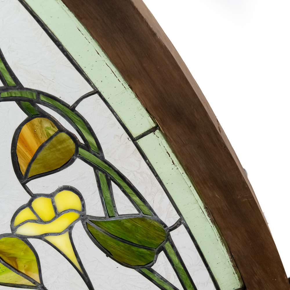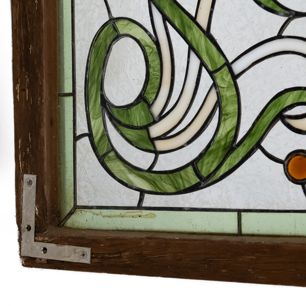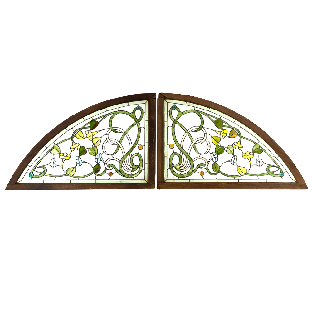 Lot of 2: Lily design stained glass left and right panels in wood frames. The lily design is surrounded by beautiful floral design etched glass and multi-colored jewels. Overall in good condition with just a few cracks throughout.