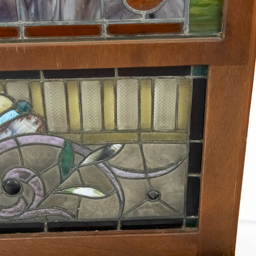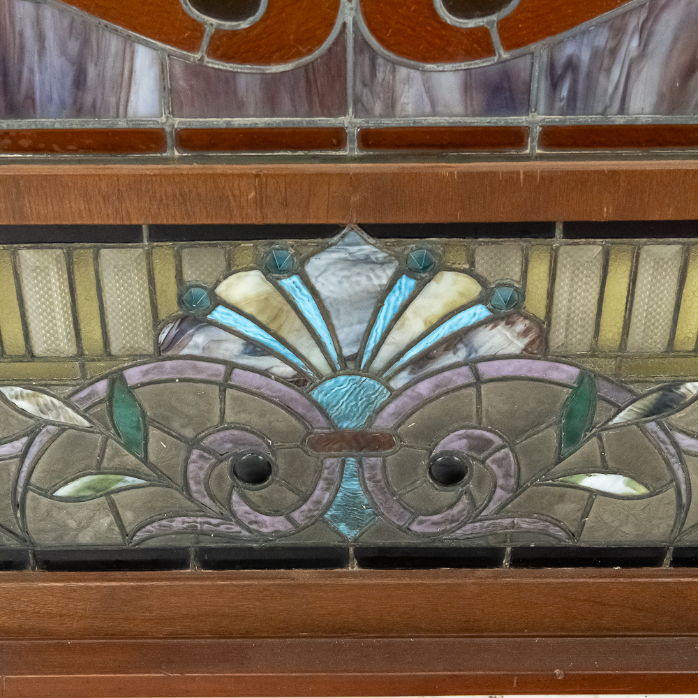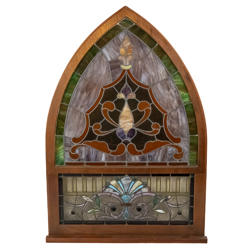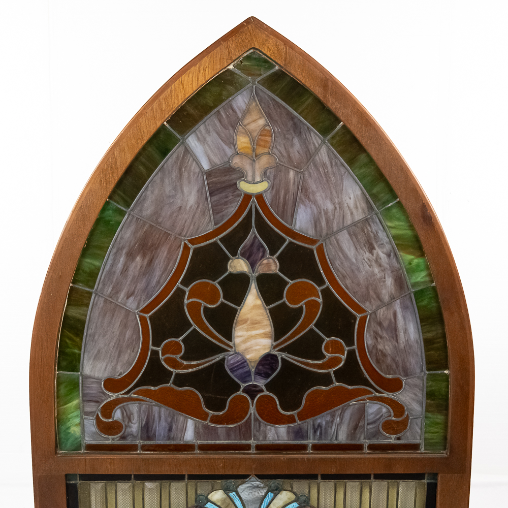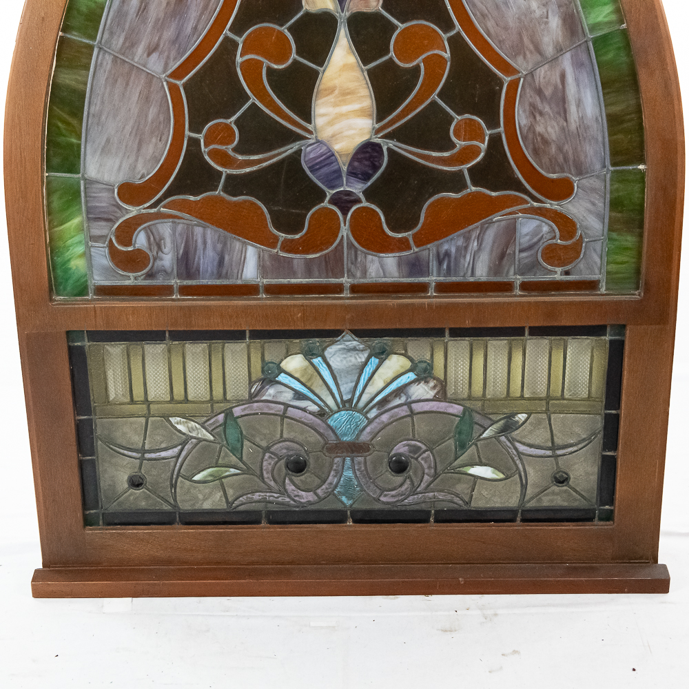 Custom made arched wood frame (boxed) containing two beautiful leaded, stained glass windows with many different colors, textures and types incorporated in the design. Also including, beveled glass and jewels. Case is well made with access door in back. Overall in good condition with a few cracks throughout. Please see photos.