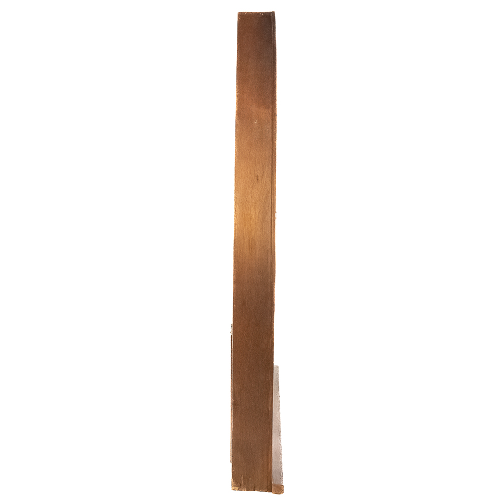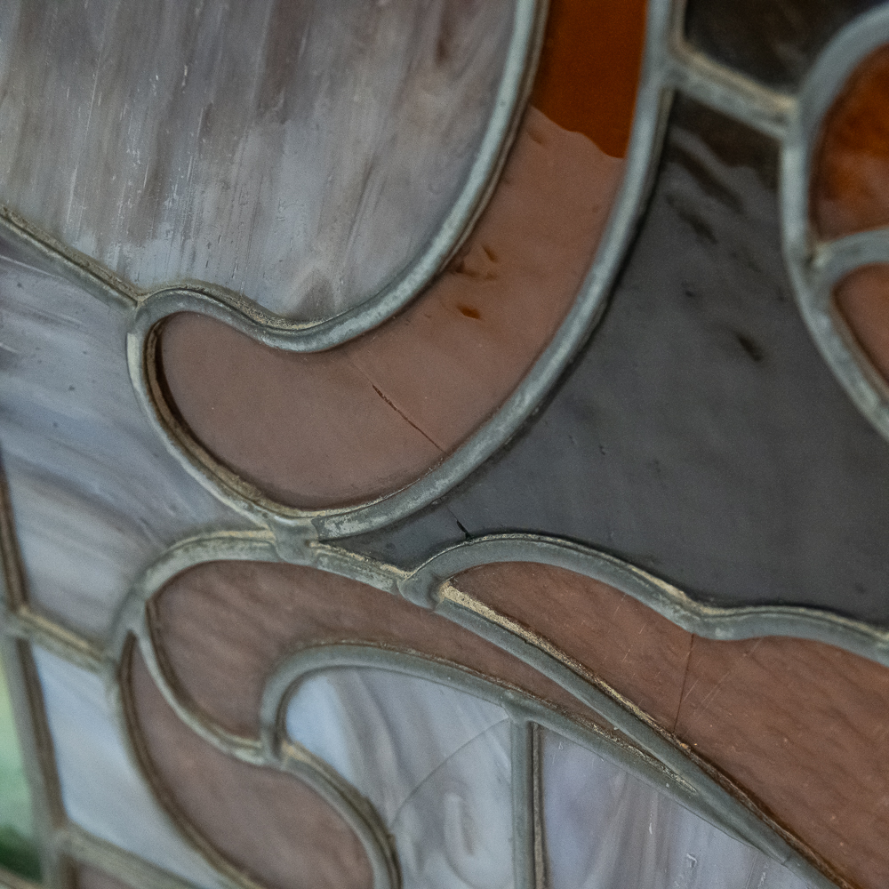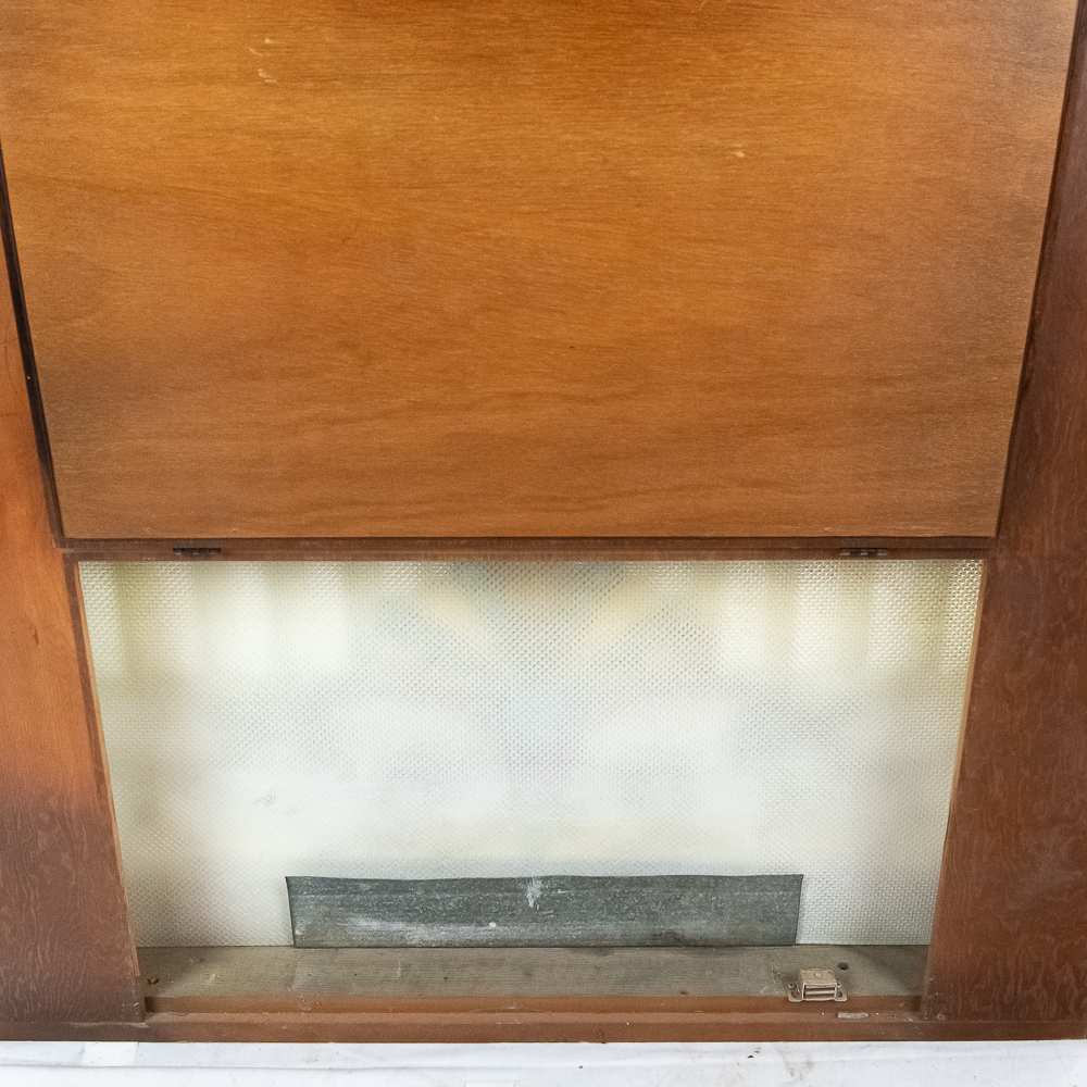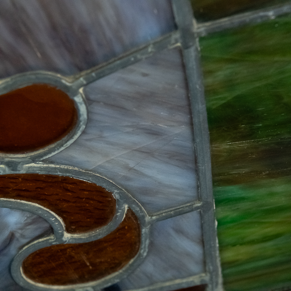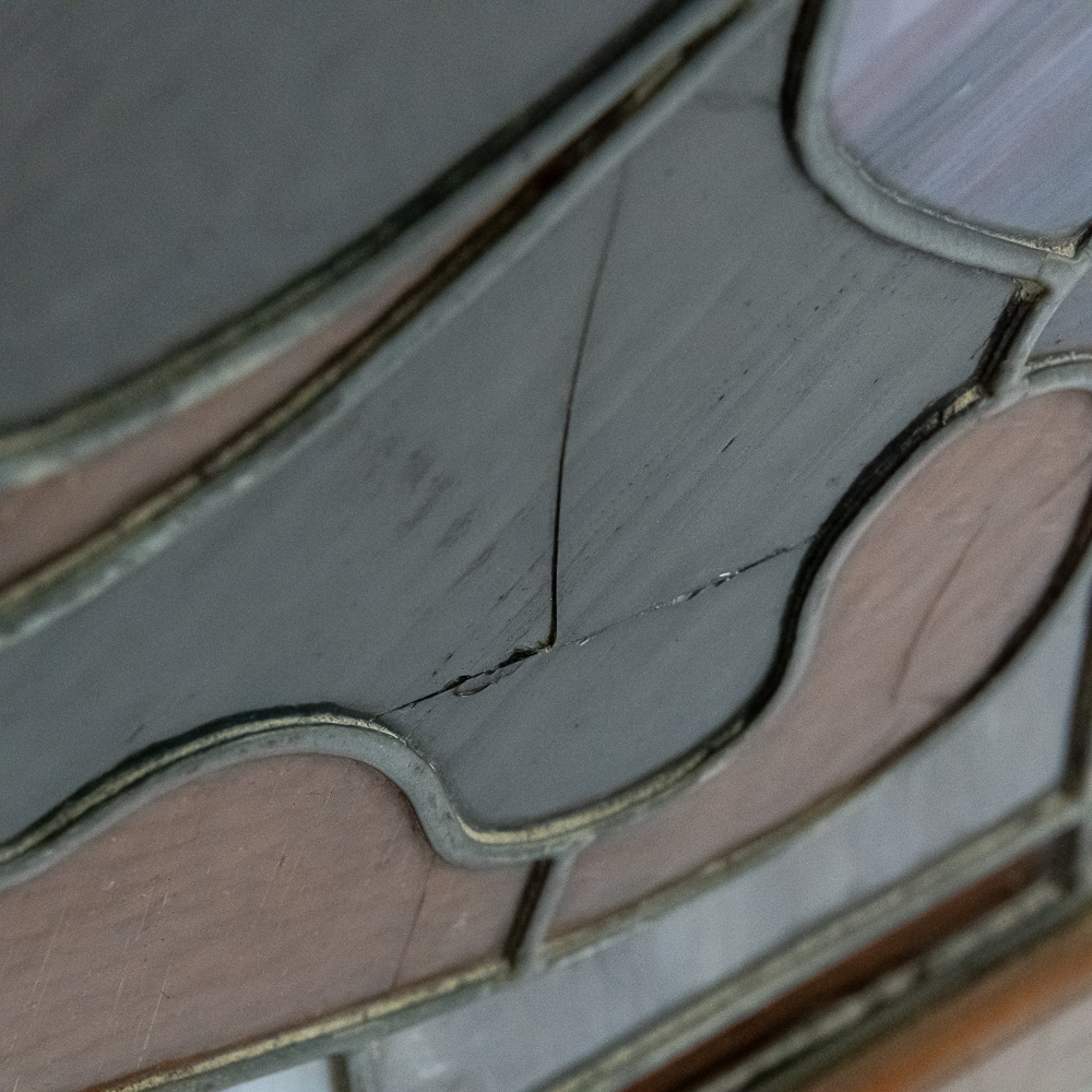 Custom made arched wood frame (boxed) containing two beautiful leaded, stained glass windows with many different colors, textures and types incorporated in the design. Also including, beveled glass and jewels. Case is well made with access door in back. Overall in good condition with a few cracks throughout. Please see photos.