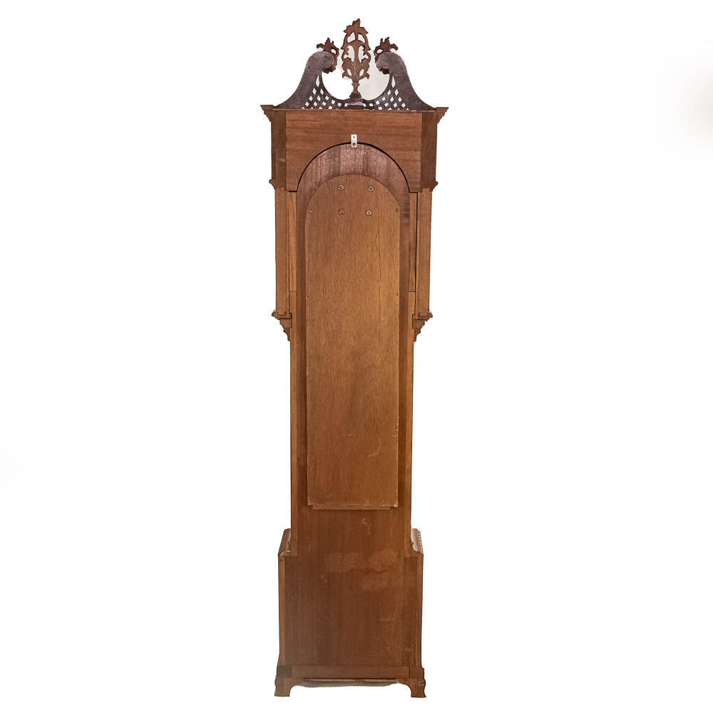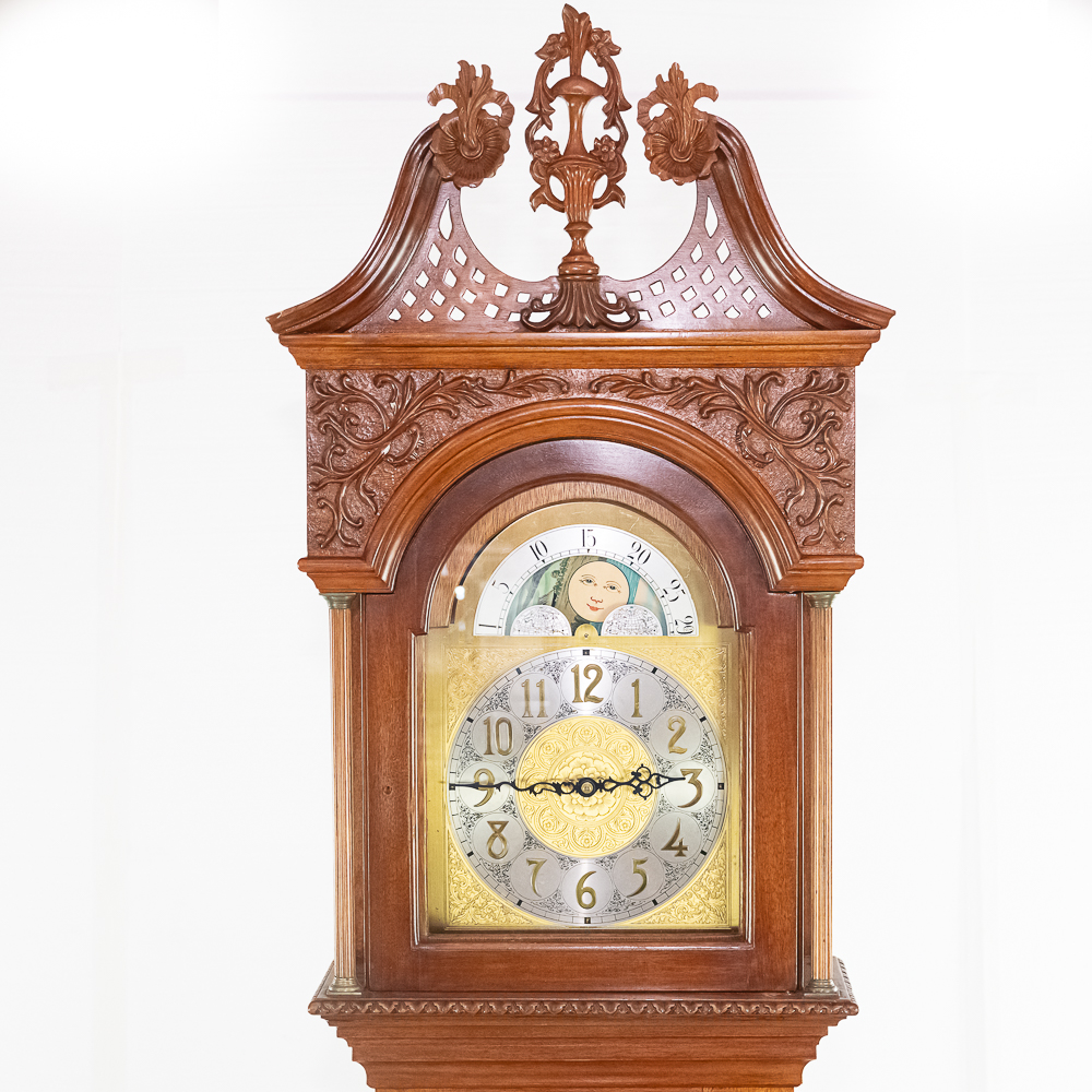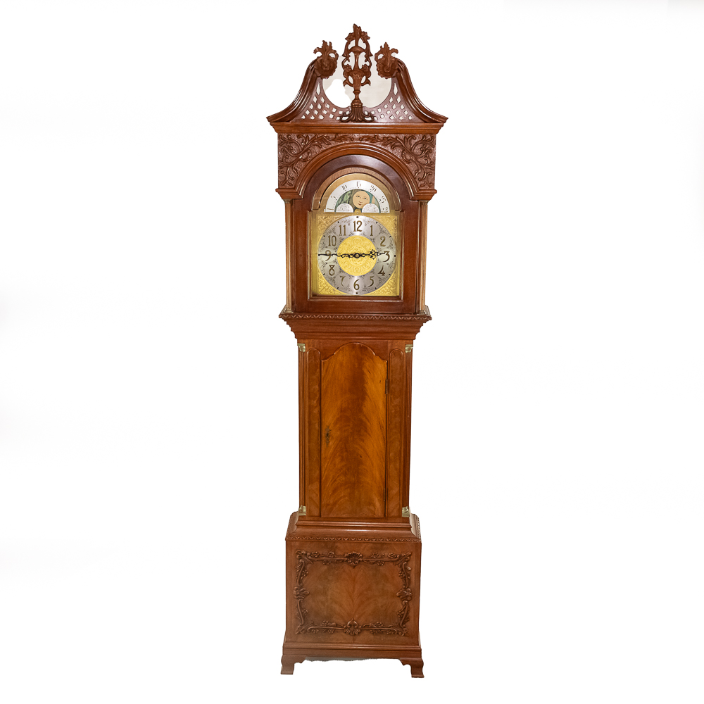 Contemporary made Grandfather clock with an Urgos 3 weight movement with moon phase in a mahogany case with a carved upper bonnet and gallery. Complete but needs servicing. Measures 91″ tall, 20″ wide, 10″ deep.