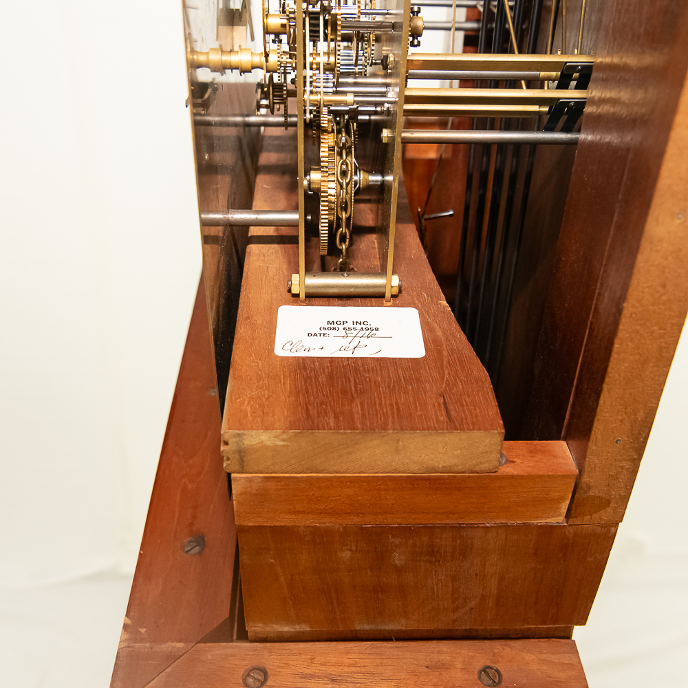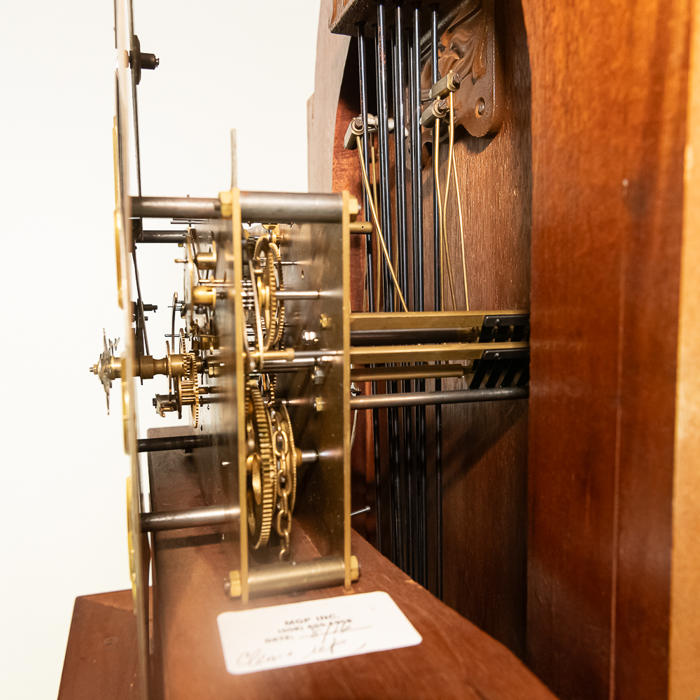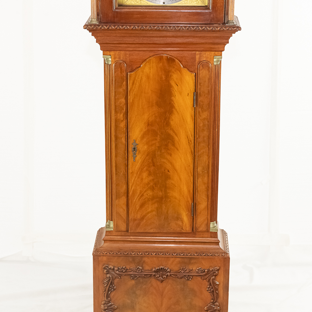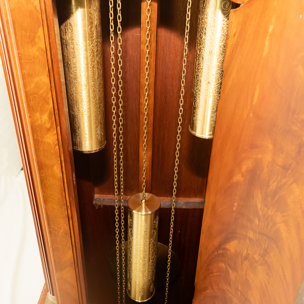Contemporary made Grandfather clock with an Urgos 3 weight movement with moon phase in a mahogany case with a carved upper bonnet and gallery. Complete but needs servicing. Measures 91″ tall, 20″ wide, 10″ deep.