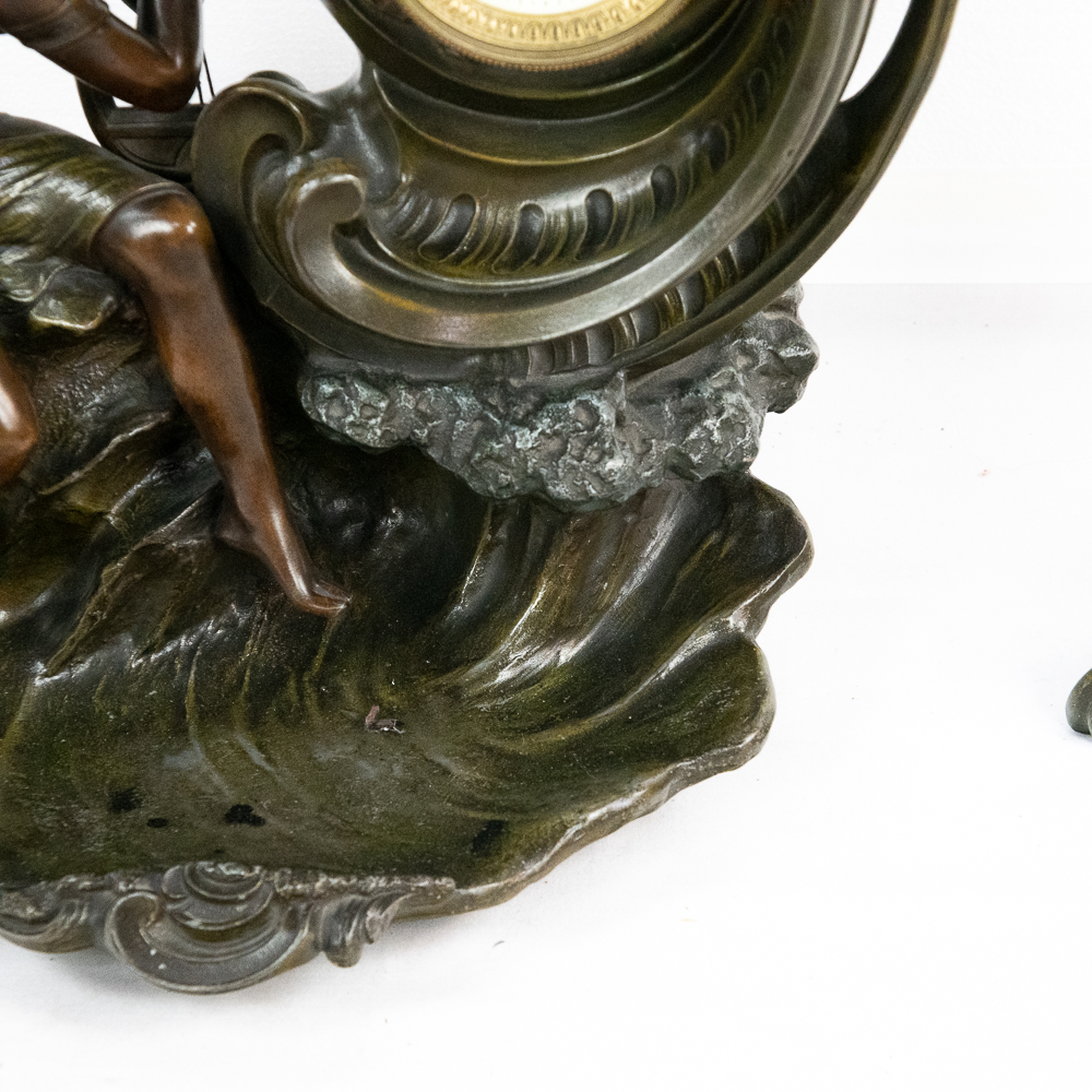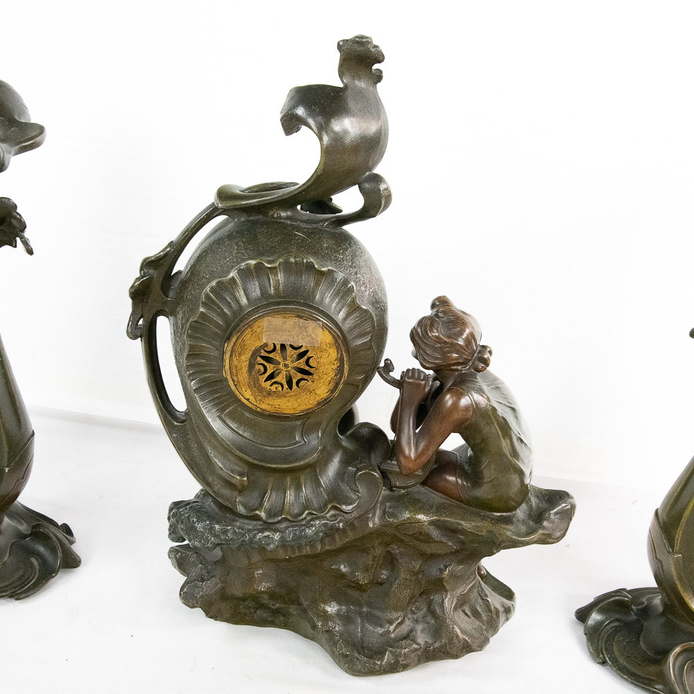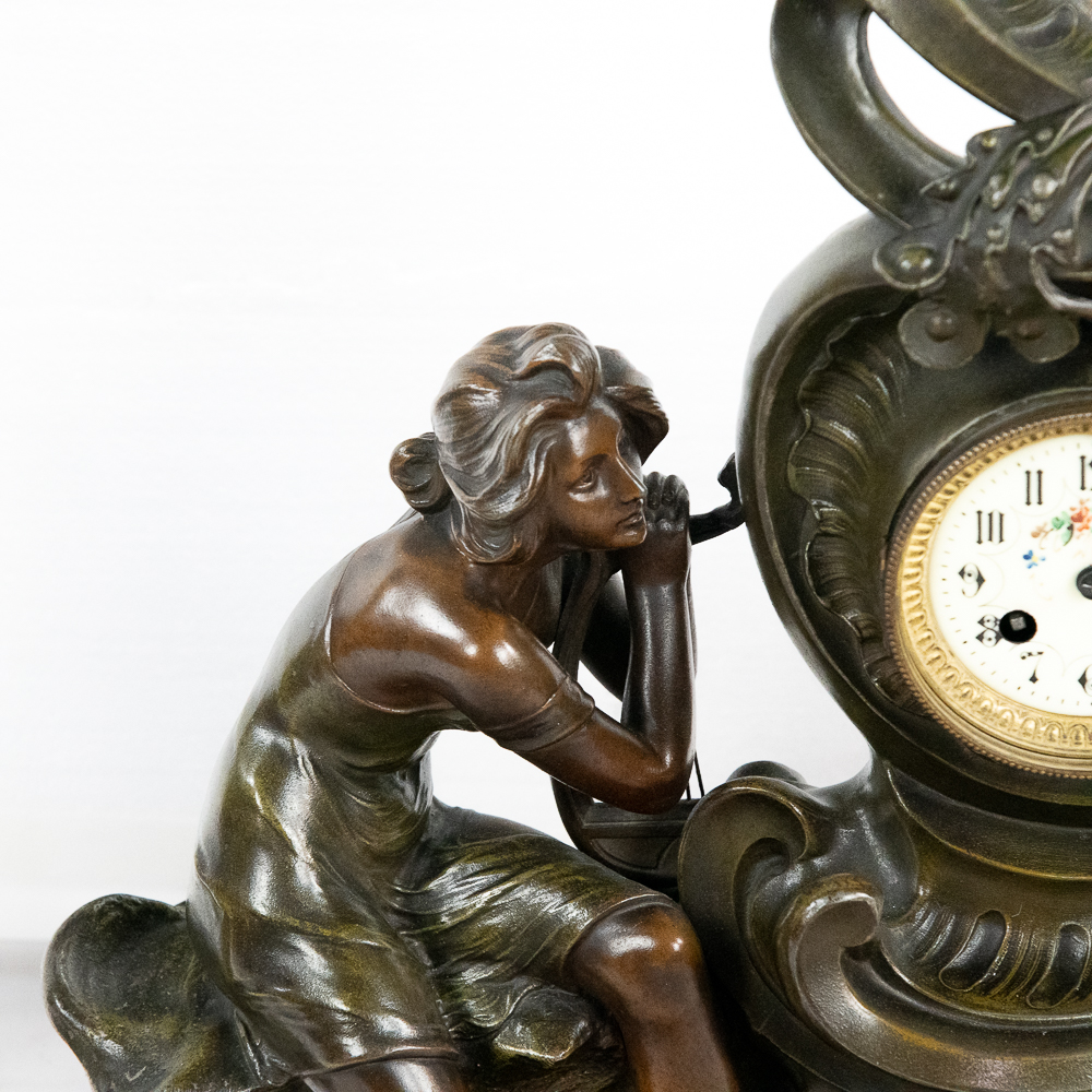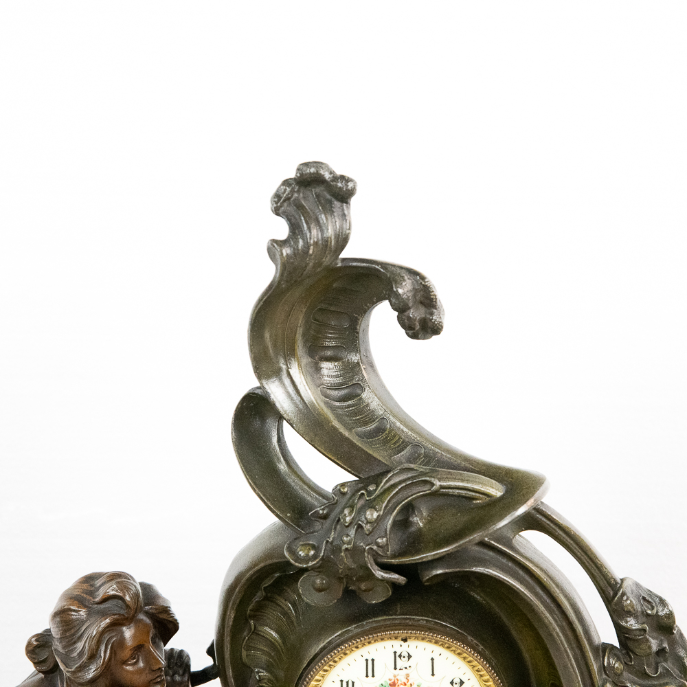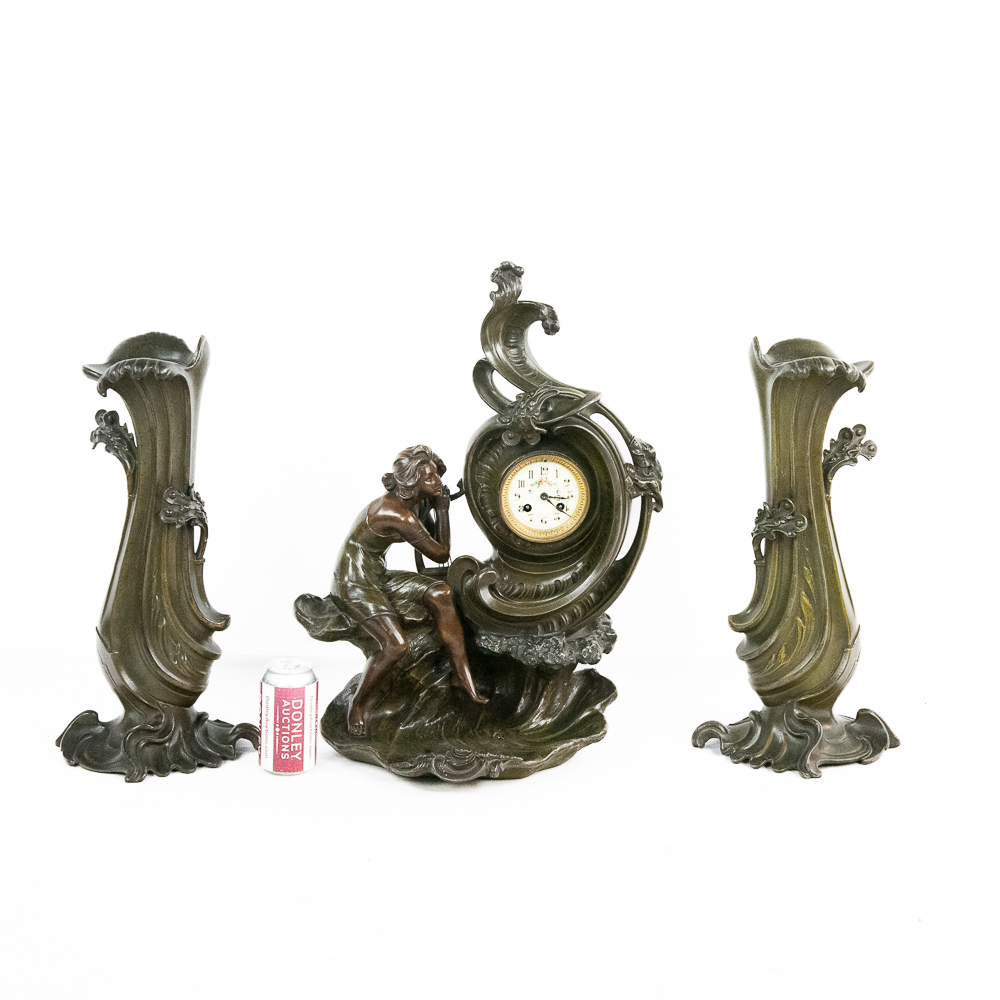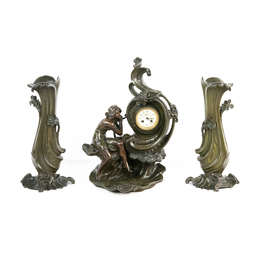 Art Nouveau inspired patinaed metal three-piece mantle clock ensemble, comprising a figural clock with scroll motif and a resting maiden beside the floral painted porcelain dial, signed ‘A. De Raudery’ on the base, 22.5″h x 13″w x 11″d, together with a pair of candlesticks; each 20″h x 10″w x 9″d. Clock retains no key and remains untested. Very good overall condition with minor age and wear noted including cosmetic blemishes such as scuffs, scratches and imperfections. Perfect addition to your collection, please use photos to judge condition and bid accordingly.