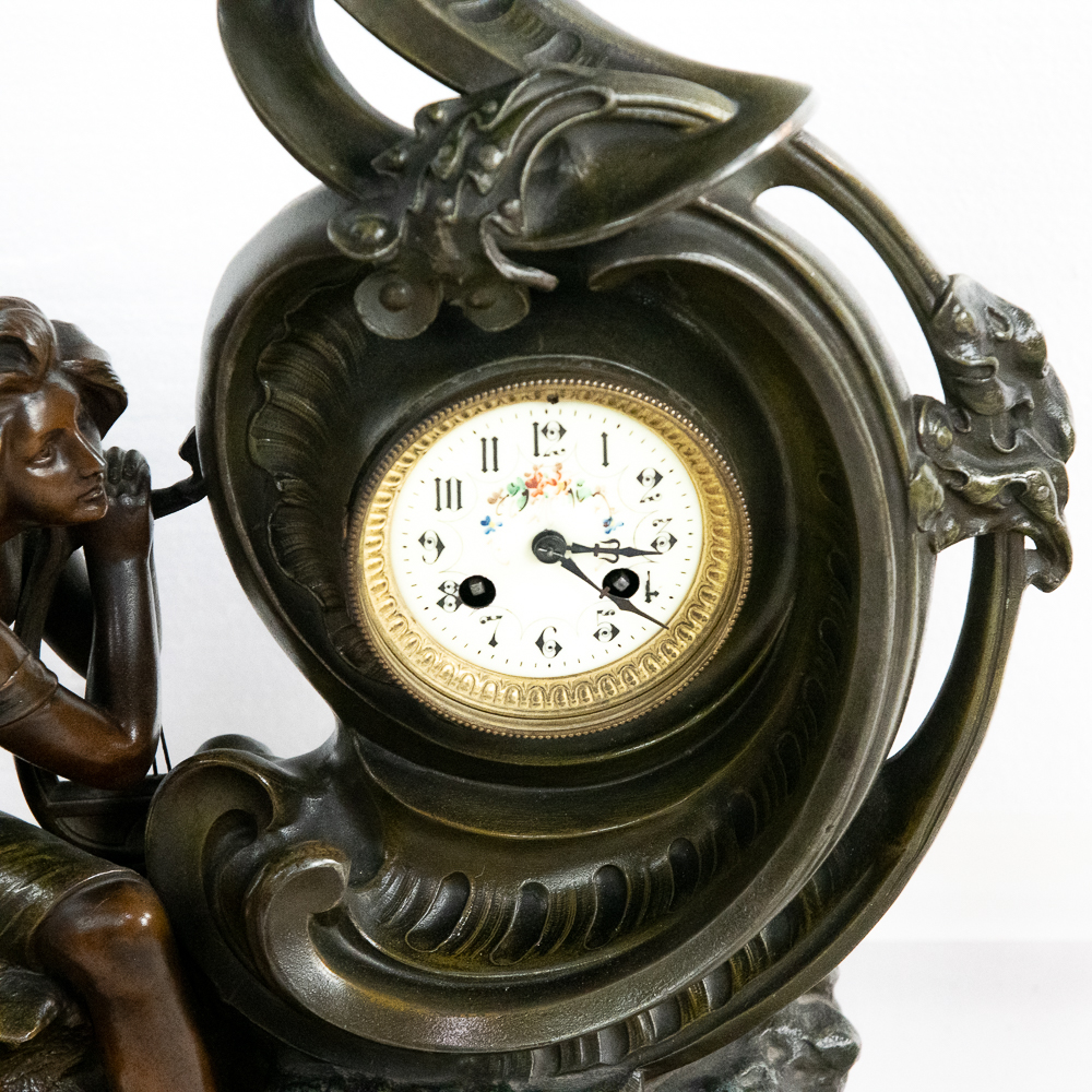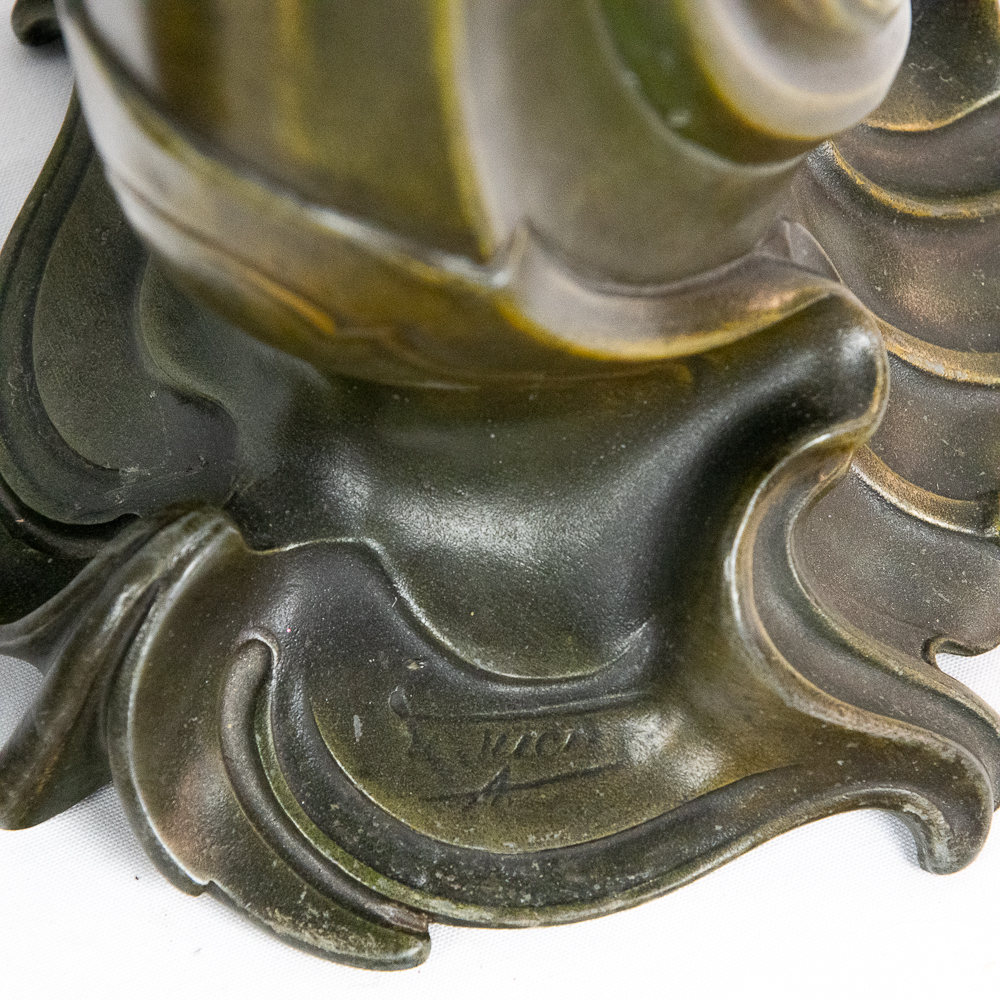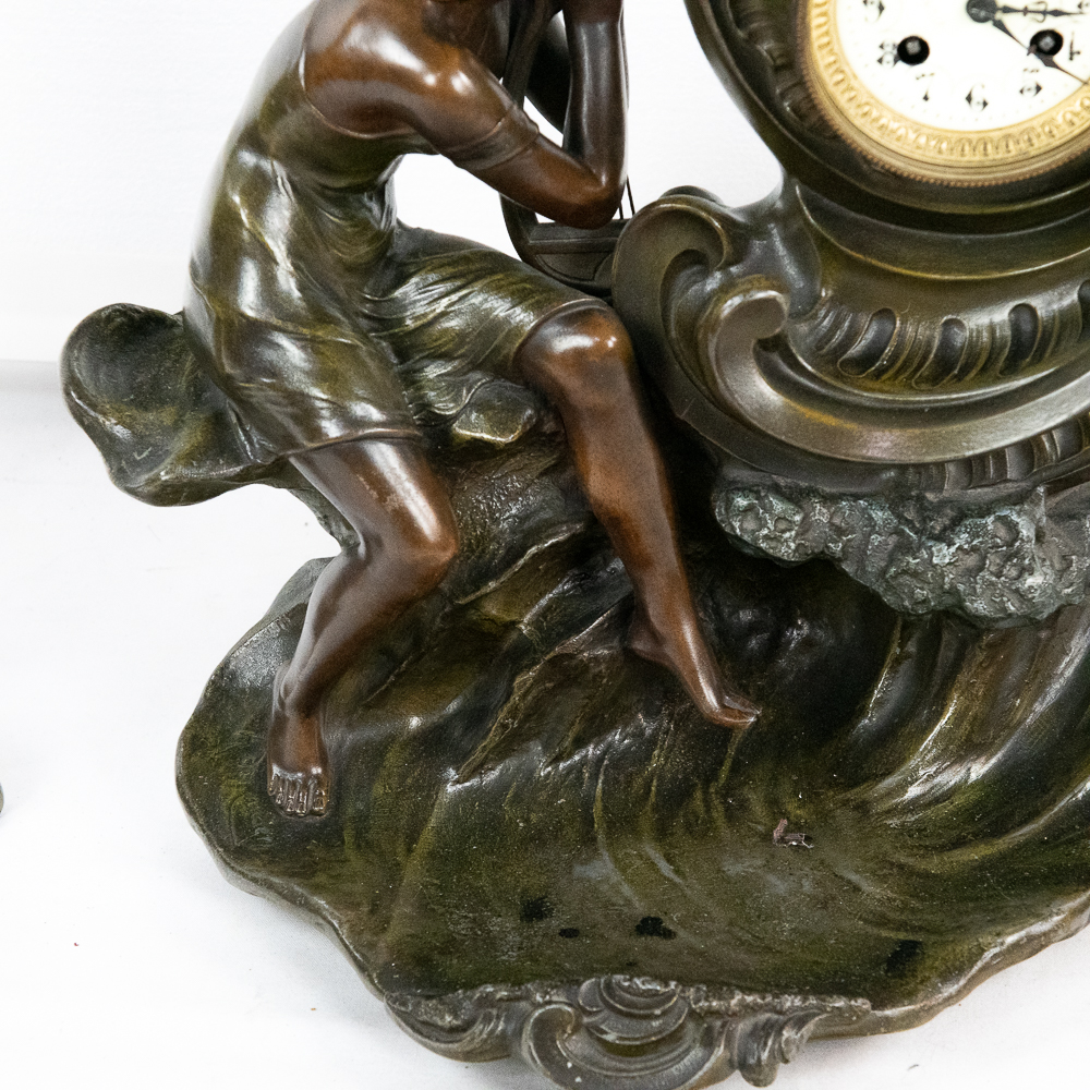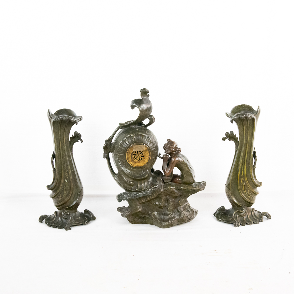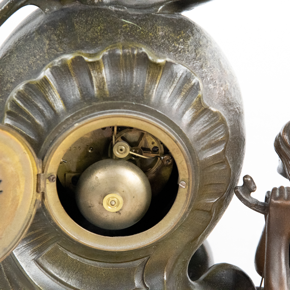 Art Nouveau inspired patinaed metal three-piece mantle clock ensemble, comprising a figural clock with scroll motif and a resting maiden beside the floral painted porcelain dial, signed ‘A. De Raudery’ on the base, 22.5″h x 13″w x 11″d, together with a pair of candlesticks; each 20″h x 10″w x 9″d. Clock retains no key and remains untested. Very good overall condition with minor age and wear noted including cosmetic blemishes such as scuffs, scratches and imperfections. Perfect addition to your collection, please use photos to judge condition and bid accordingly.