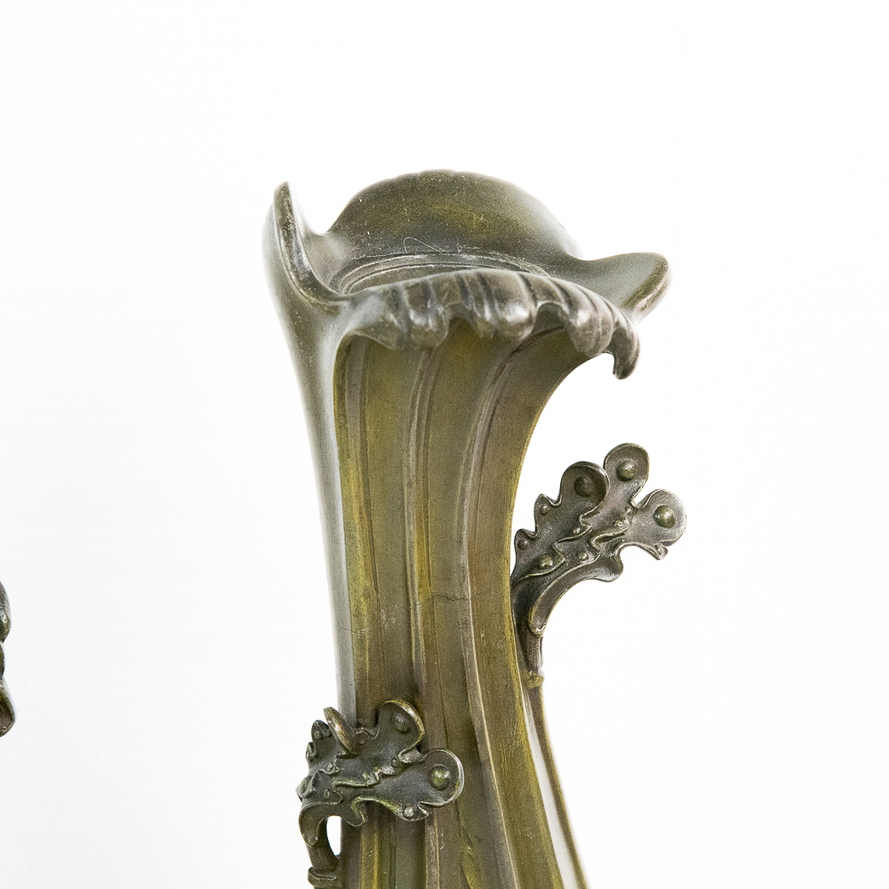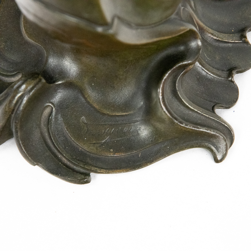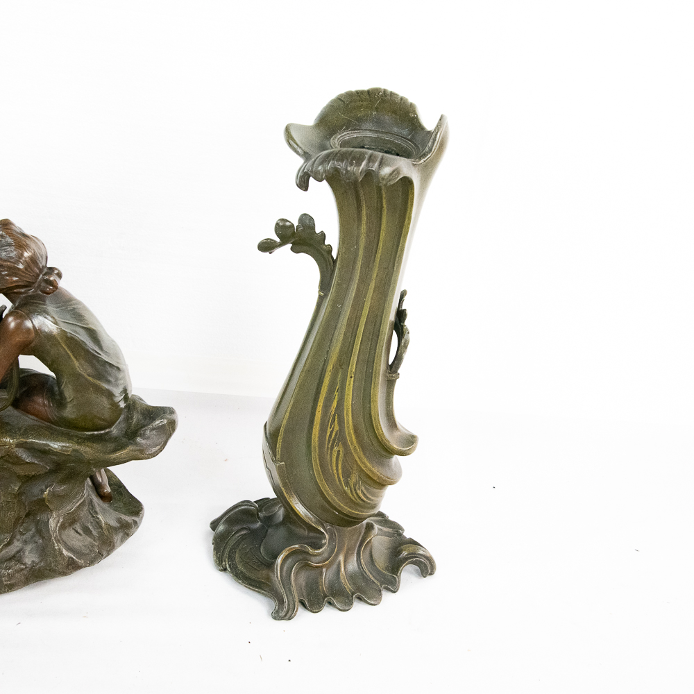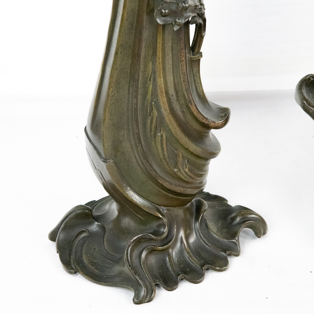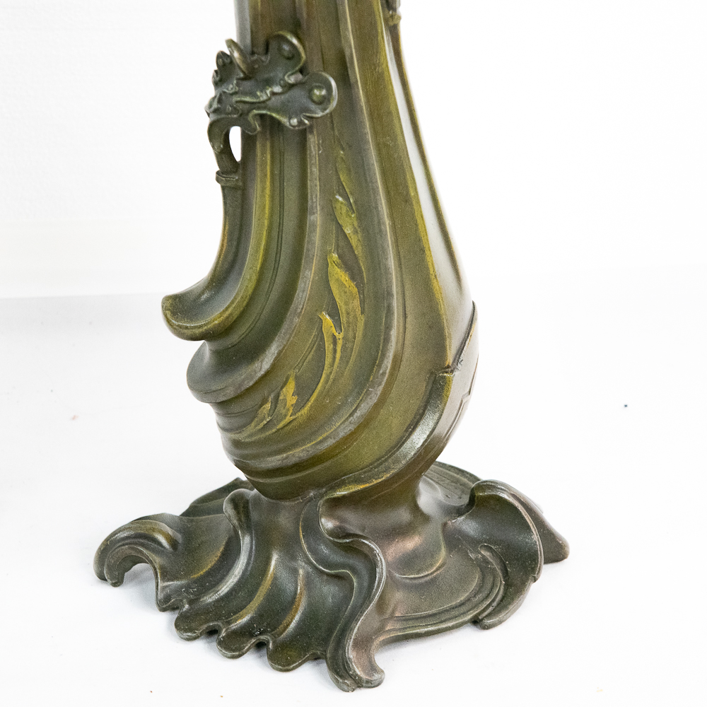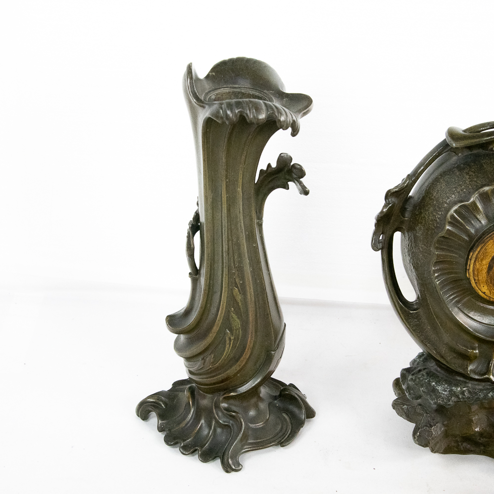 Art Nouveau inspired patinaed metal three-piece mantle clock ensemble, comprising a figural clock with scroll motif and a resting maiden beside the floral painted porcelain dial, signed ‘A. De Raudery’ on the base, 22.5″h x 13″w x 11″d, together with a pair of candlesticks; each 20″h x 10″w x 9″d. Clock retains no key and remains untested. Very good overall condition with minor age and wear noted including cosmetic blemishes such as scuffs, scratches and imperfections. Perfect addition to your collection, please use photos to judge condition and bid accordingly.