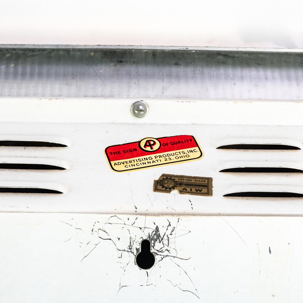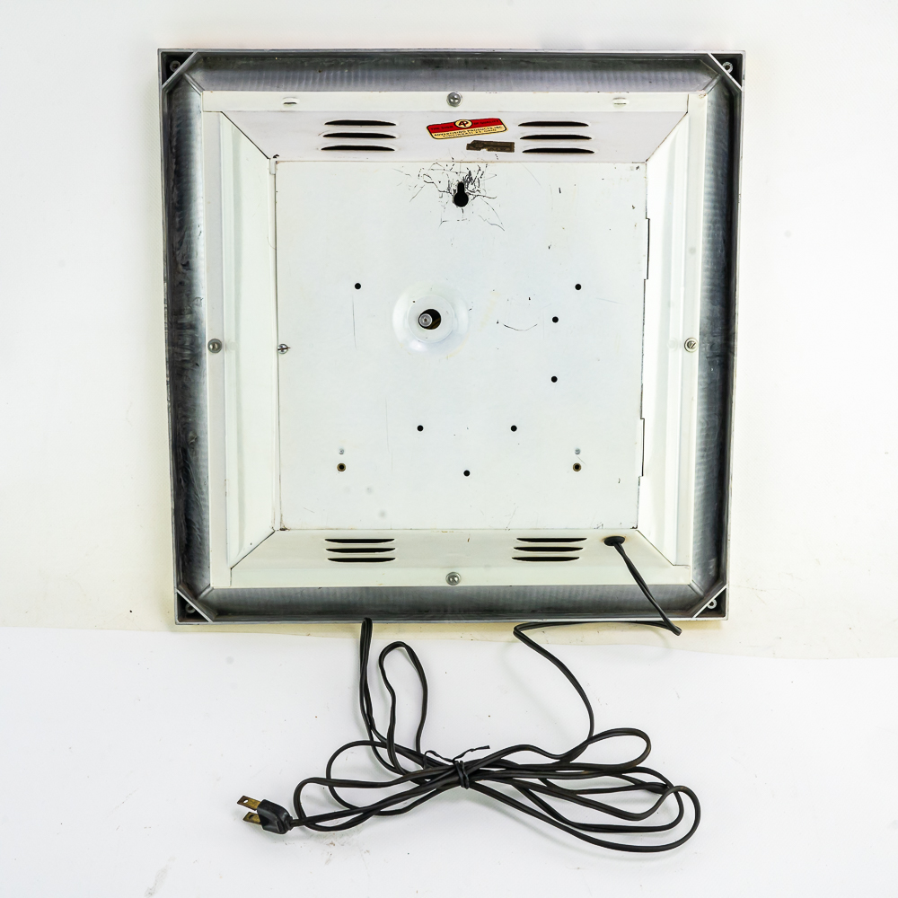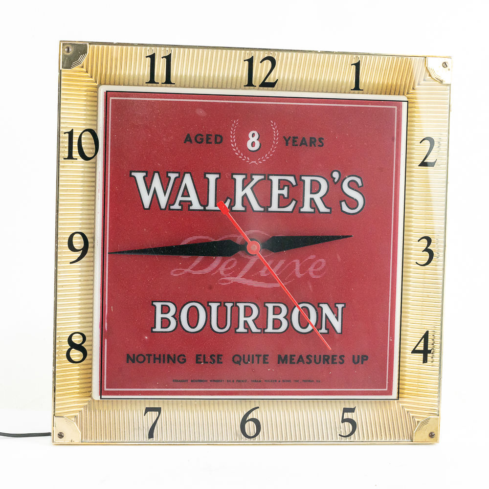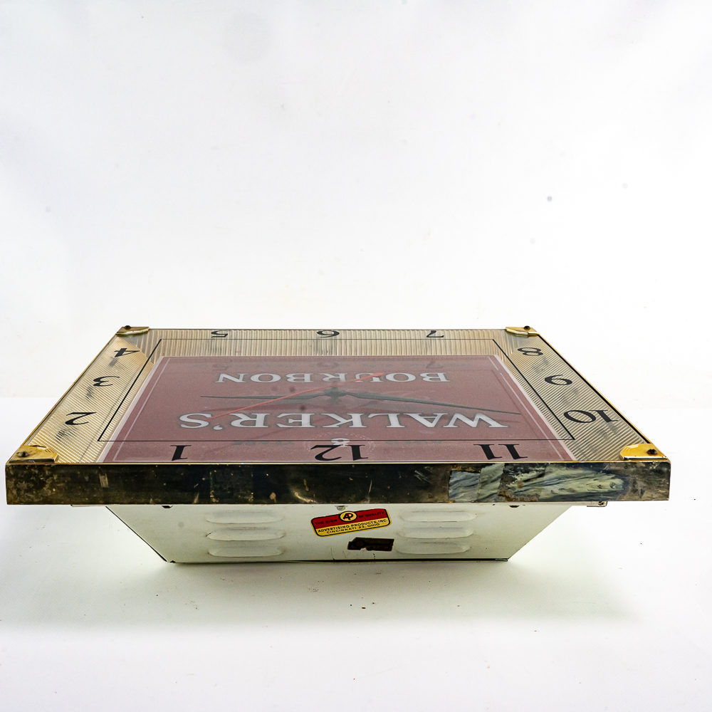 A nice wall hanging clock. Works. Good gold border with deep red light up insert. A little discoloration along side edge. Needs bulb. Otherwise good condition. and a very sought after item with the popularity of bourbon today.